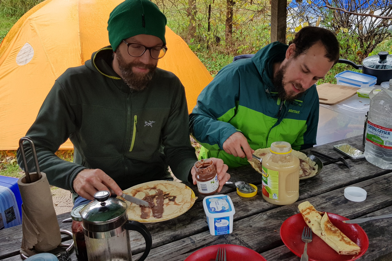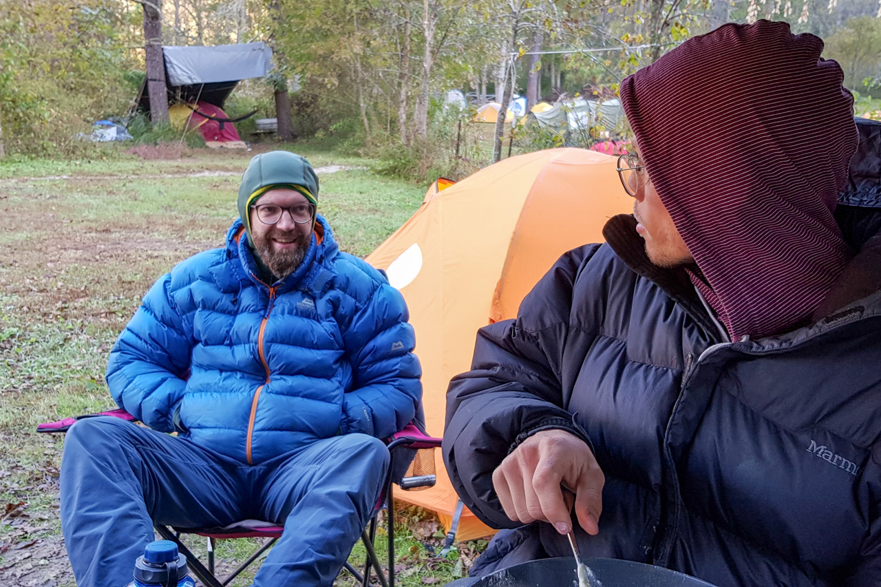 Klimatechnisch gibt es hier das volle Programm, mit der Ausnahme, dass es NIE perfekt ist (mimimi). Als wir hier ankamen, hatten wir Tag und Nacht gefühlt 30°, sodass unsere Schlafsäcke schlichtweg obsolet waren. Verfeinert wurde die Wettersituation durch die hohe Luftfeuchtigkeit, die mit jeder Sauna mithalten kann, was Unmengen von Tau zur Folge hat, der sich sowohl im und auch außerhalb des Zelts über die Nacht angesammelt hat. Auch beim Klettern freute uns das: Schmierige Finger, Schweißtropfen in den Augen und ständig das Gefühl, sofort unter eine kalte Dusche hüpfen zu wollen. Kurzum: So geschwitzt haben wir noch nie beim Klettern! Zu dieser Zeit sind uns sogar zwei unserer Holzkochlöffel verschimmelt, weil sie über mehrere Tage hinweg einfach nicht trocken wurden… (Danke an Flo für den neuen Pfannenwender!). Danach wurde es, wie soll es anders sein, schlagartig so kalt, dass wir von kürzest-möglichen Klamotten auf lange Unterwäsche und Daunenjacken wechseln mussten. Aus dem Tau wurde dadurch lediglich Raureif, bzw. Eis im Zelt. Anmerkung der Redaktion: Beschreibung gilt hauptsächlich für die erste Hälfte. In der zweiten Hälfte war es insgesamt etwas freundlicher.
