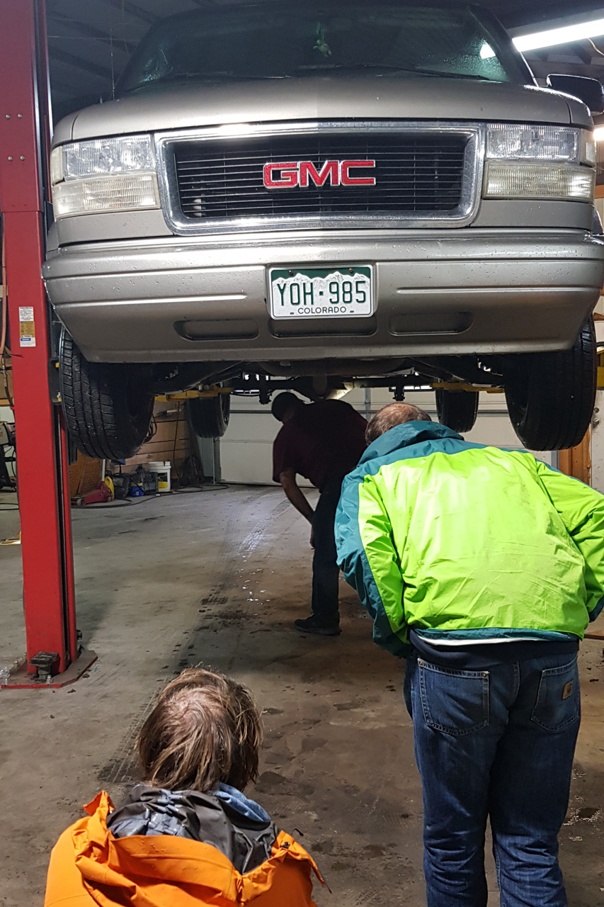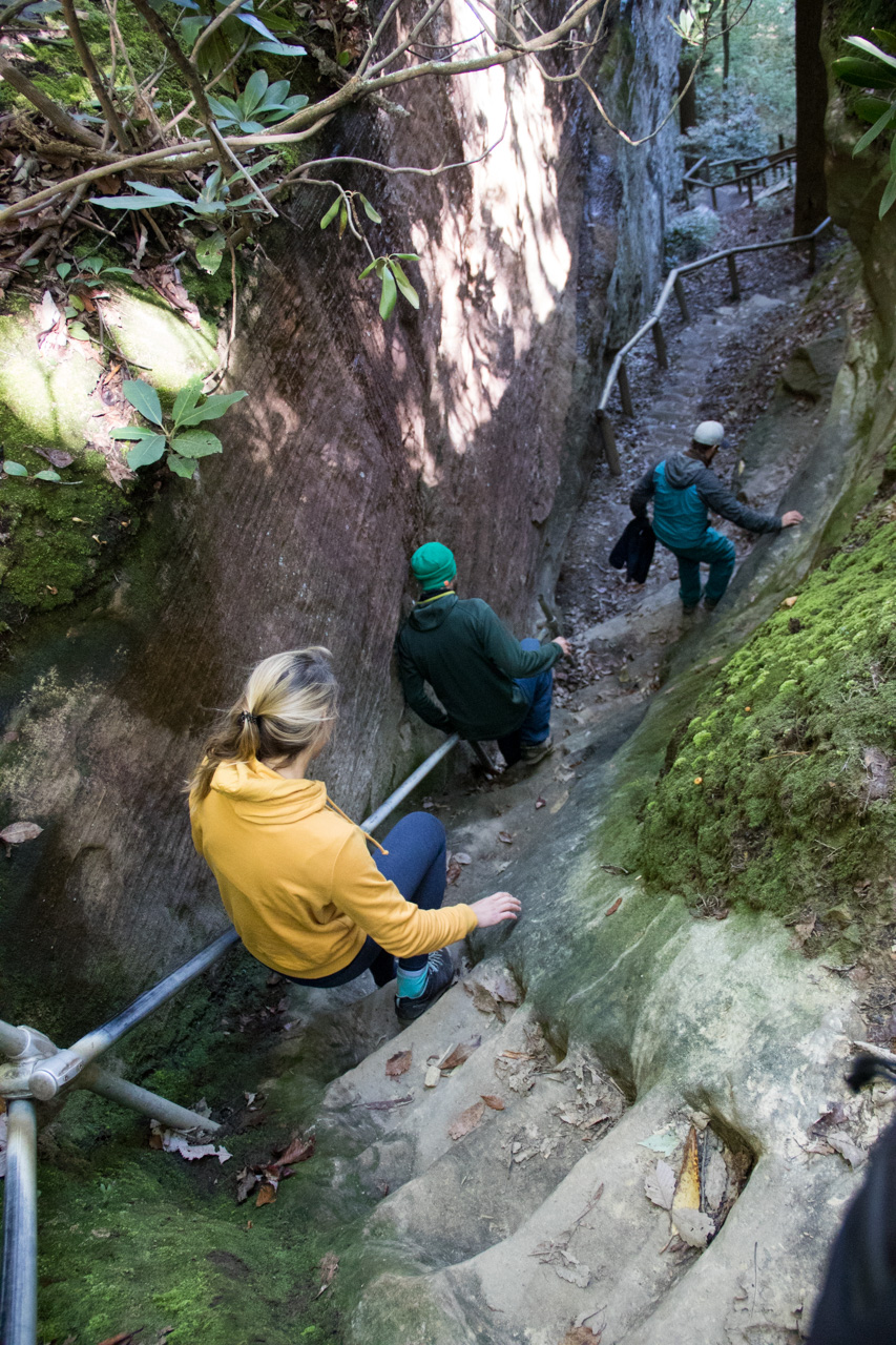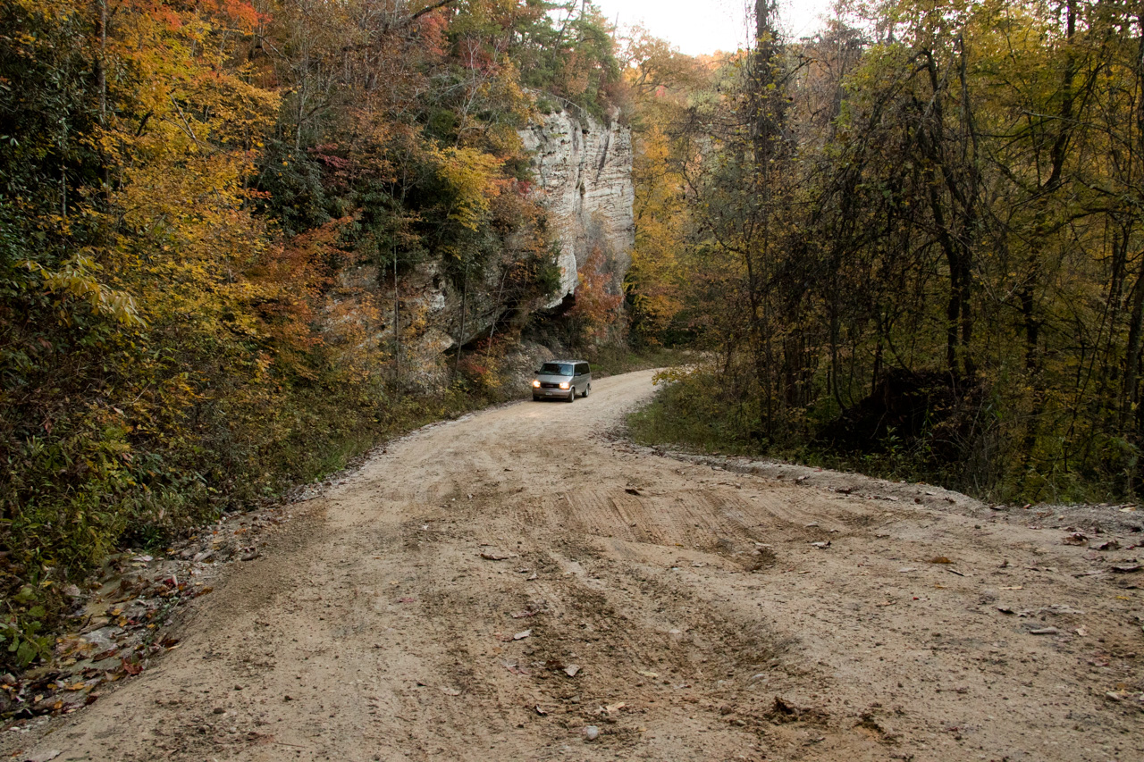 Die Region um die Red River Gorge ist zunächst einmal sehr hügelig, vielleicht vergleichbar mit der Region um Pottenstein. Allerdings gibt es hier keine lichten Buchenwälder, sondern einfach nur Dschungel! Sehr dichten Dschungel, bei dem die Lücken mit Efeu-artigen Ranken zusätzlich abgedichtet sind. Die Bevölkerungsdichte ist auch hier nicht sonderlich hoch (wesentlich höher als in Wyoming, aber wesentlich niedriger als rund um Pottenstein!), was auf der einen Seite sehr schön ist, aber auf der anderen Seite bedeutet, dass man sich häufig mit schlecht gewarteten Schotterstraßen konfrontiert sieht. Für diese Straßen soll man laut Kletterführer am Besten mit Allrad-Gefährten anreisen – was wir ja glücklicherweise auch sind. Unser Henry hat sich auf jeden Fall nicht sonderlich ins Zeug legen müssen und meisterte alle Hänge und Schlaglöcher ohne uns zu verraten, ob er nun in den 4-Rad Modus wechseln musste oder nicht. Eine Ausnahme gab es dann aber leider doch: Ein seltsames metallisches Geräusch, welches vor allem bei Unebenheiten vorne links im Radkasten zu hören war. Der lokale Auto-Magier konnte dessen Quelle jedoch lokalisieren und ließ es durchs Festziehen einer Schraube verschwinden.