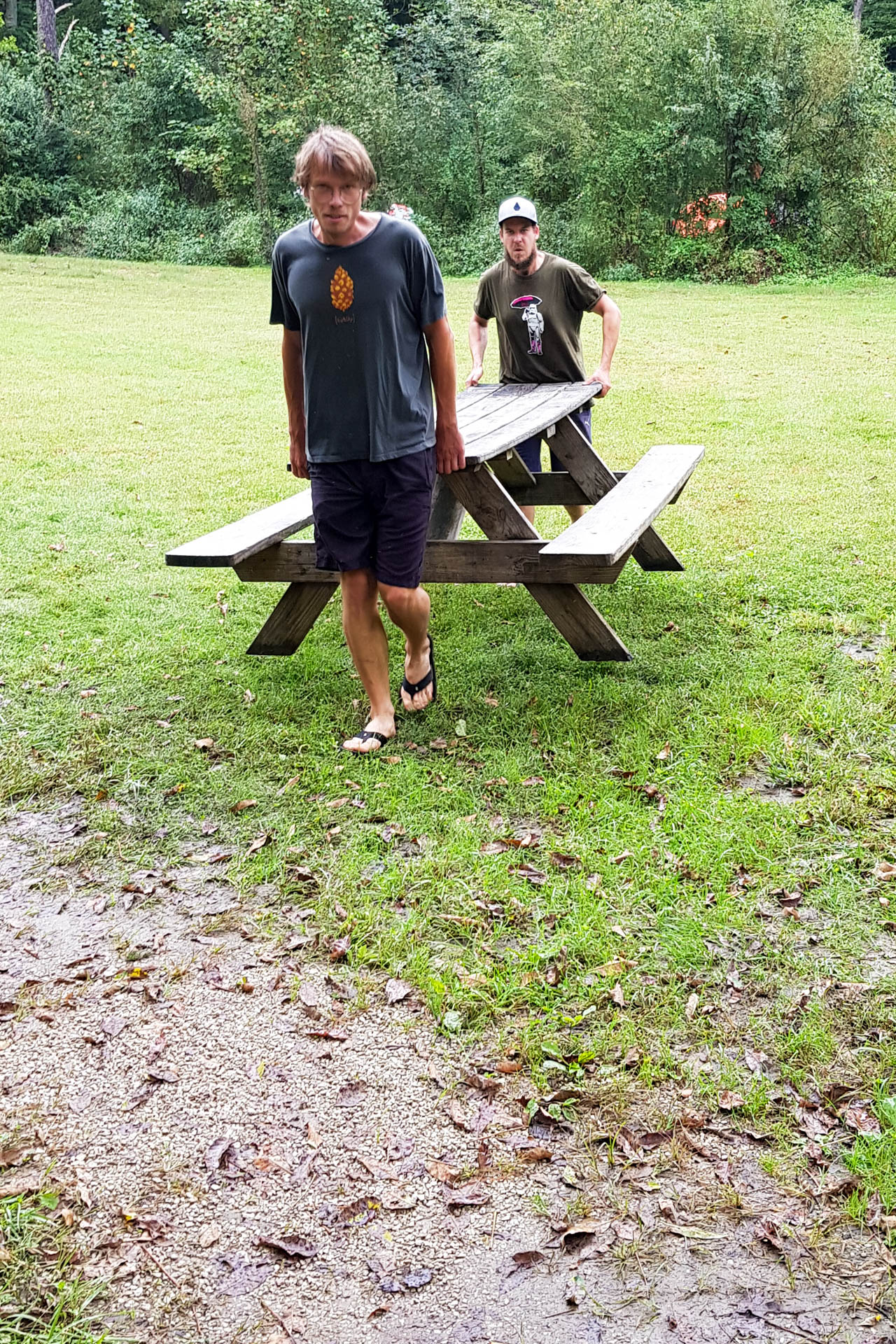 Natürlich haben wir versucht, dieser Situation auch einigermaßen Herr zu werden. Zum Beispiel haben wir auf dem Campingplatz eine ungenutzte Bank „gefunden“. Praktisch war hier auch unser Tarp, welches wir mit weiteren „gefundenen“ Baumaterialien immer besser über unserer Sitzgelegenheit ausrichten konnten. Hinzu kamen diverse Laufplanken, um die nach jedem Regensturz wiederkehrenden Pfützen zu überbrücken und um Matschfelder abzudecken. Dan’s altes Zelt wurde schnell als „Supply“-Zelt etabliert und erleichterte die „trockene“ Lagerung von Lebensmitteln und anderem Krempel. Trocken ist hier bewusst mit Anführungszeichen versehen, denn irgendwie haben sich dann doch einige Gegenstände dem Schimmel hingegeben.