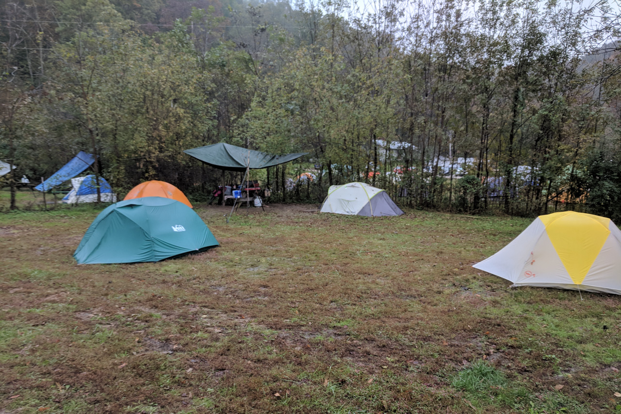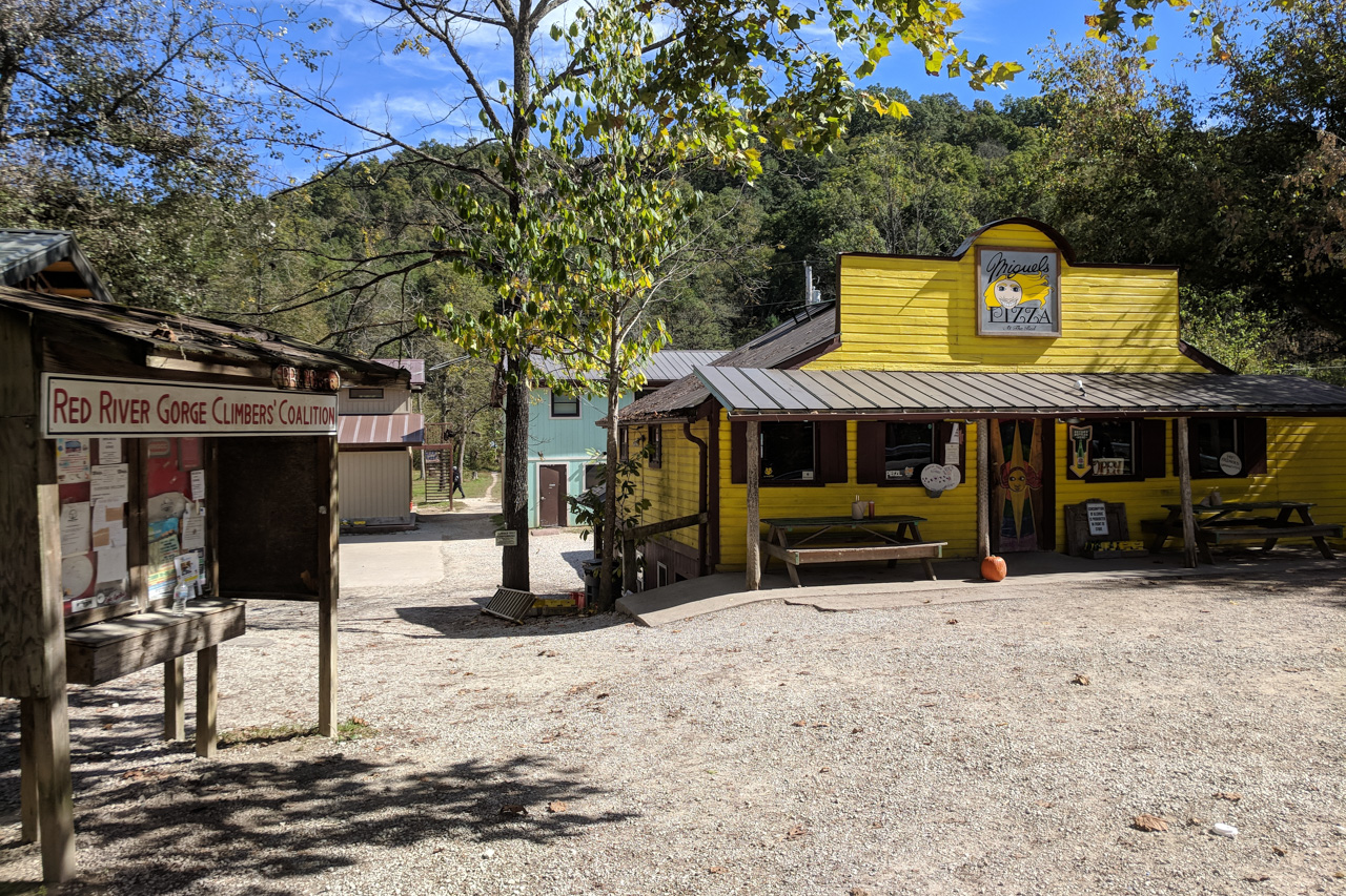 Miguel’s Pizza scheint in der Red River Gorge das religiöse Zentrum der Kletterwelt zu sein. Jedes Wochenende wird der Campingplatz mit „unlimited Campingspace“ von Kletterwütigen, deren Hunden und deren Krach, überrannt. Selbst alle Anfahrtsbeschreibungen im Kletterführer beginnen mit ihren Distanzangaben am Parkplatz der dortigen Pizzeria. Aus Ermangelung an Empfehlungen und dem Wunsch, das Ganze auch mal zu erleben, ließen wir uns also dort für die nächsten vier Wochen nieder.
