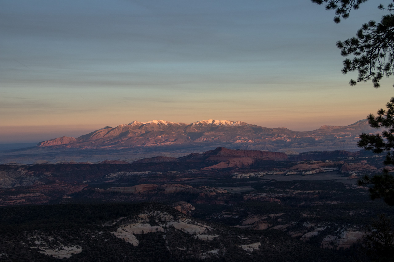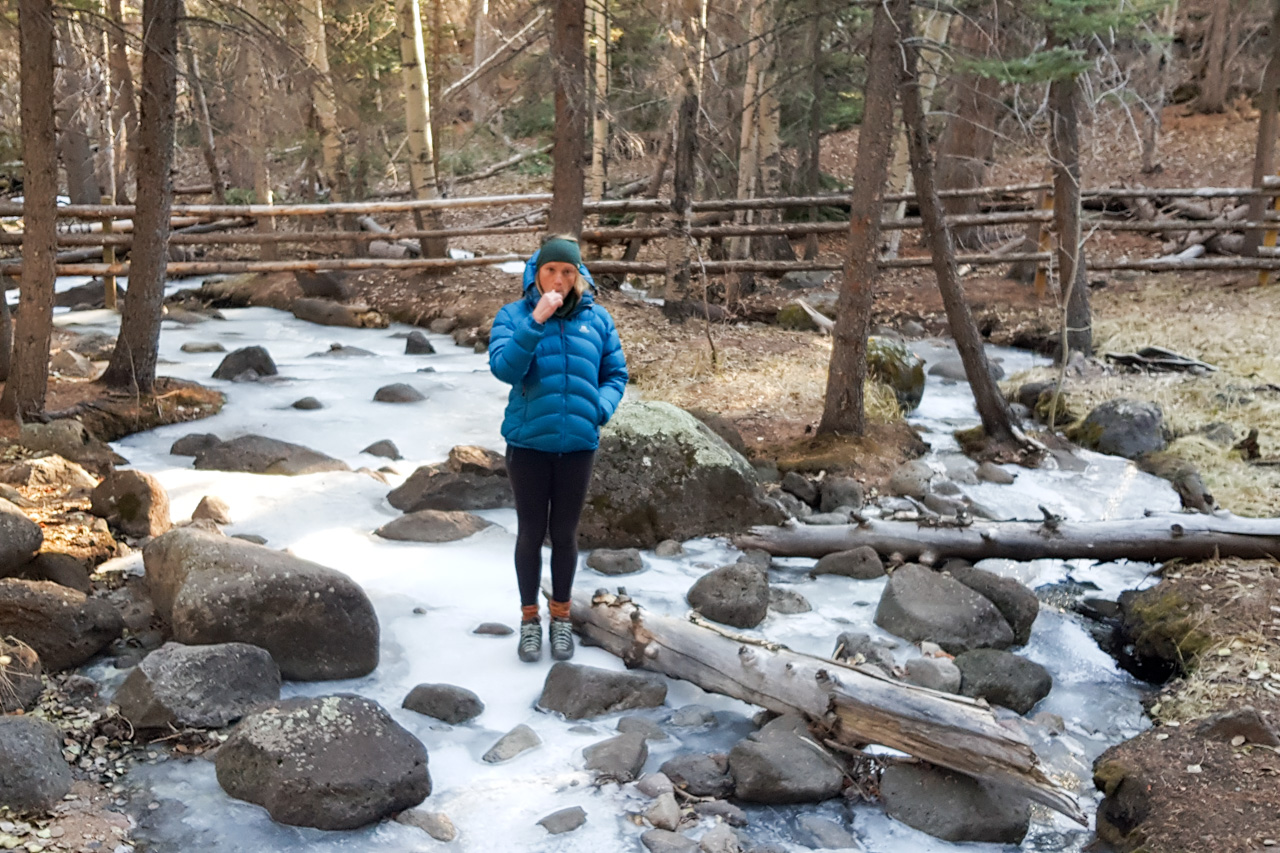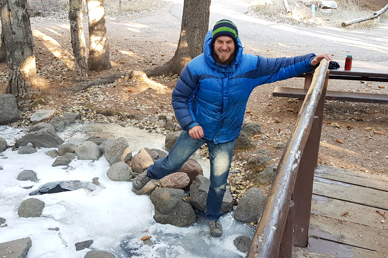 Von Moab sind wir dann Richtung Saint George aufgebrochen, da wir nachts gerne mal wieder Plusgrade haben wollten (inzwischen waren wir wieder ins Zelt gezogen). Der Weg dorthin führte uns durch den Dixie National Forest entlang des Scenic Highway 12. Unser „Ortskundiger“ (Piet) war mal wieder ziemlich erstaunt, als sich Stück für Stück die lückenhafte Erinnerung vervollständigt hat. Konkret hat das bedeutet, dass wir uns auf einer Passstraße befanden, welche uns, vorbei an zugefrorenen Bächen, auf fast 2900m hoch geführt hat. Dort haben wir dann an einem sehr schönen im Wald gelegenen, aber leider auch sehr kalten, Zeltplatz übernachtet. Hier war dann ein Lagerfeuer absolute Pflicht.