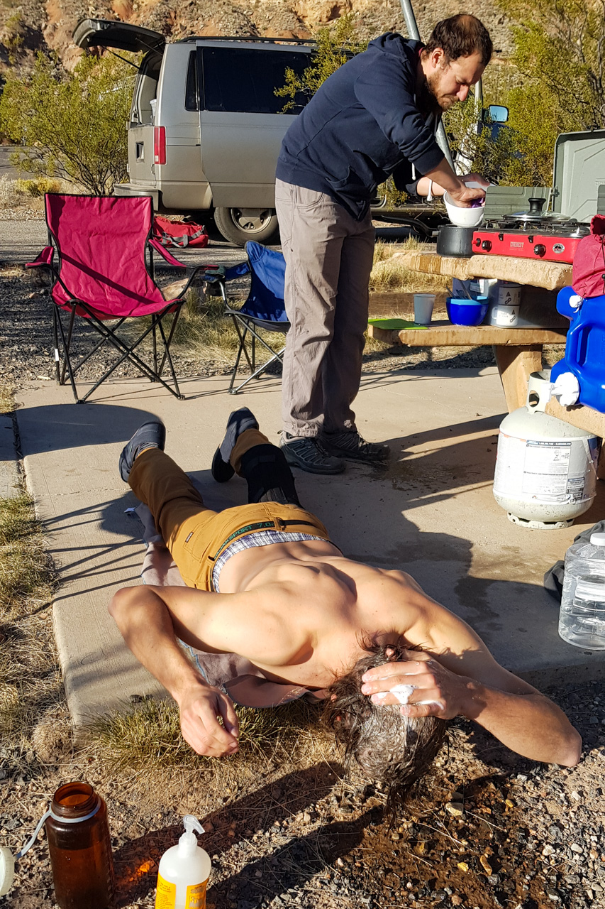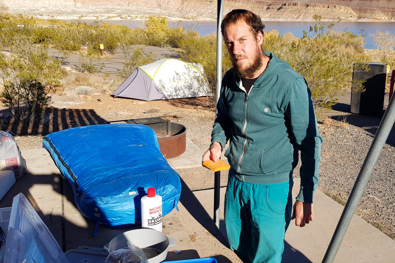 Doch nun zum „Main Event“ am Zeltplatz in Saint George: In einer lauen Nacht haben wir leider vergessen zwei Vorratsboxen mit Brot, Obst etc. aus Dans Zelt im Auto unterzubringen. Irgendwann in der Nacht hatte Dan dann ein possierliches Stinktier in seinem Zelt, welches sich an der reichlich vorhandenen Nahrung bediente. Nach einem kurzen Schreck und dem erfolgreichen Verjagen, hat der fiese Essensräuber dann doch noch seine Note hinterlassen und diverse Gegenstände, Essen bzw. Essensboxen, Zelt, Schlafsack usw. mit seinem „Spezialparfüm“ kontaminiert. Auch Sir Henry musste mitleiden, da wir mitten in der Nacht schlaftrunken ein paar der einparfümierten Boxen ins Auto gestellt hatten. Daher durften wir dann einen gesamten Tag der Geruchsbekämpfung widmen, was gar nicht so einfach war: Hausmittel wie Tomatensoße, Backpulvertinkturen usw. waren für unsere Situation nicht anwendbar. Deswegen haben wir im Haustierladen ein Anti-Stinktier-Wundermittel gekauft und alles, teilweise mehrfach, damit abgeschrubbt. Sir Henry hat zusätzlich ein Essigdöschen für die nächste Woche mit herumfahren dürfen. Auf jeden Fall wissen wir jetzt alle, dass Stinktiere wirklich bestialisch stinken... Sollte jemand Mutiges unter euch unbedingt mal nachempfinden wollen, wie Stinktierparfüm duftet, empfehlen wir, dies nur mit Gegenständen zu testen, die danach schnell entsorgt werden können.