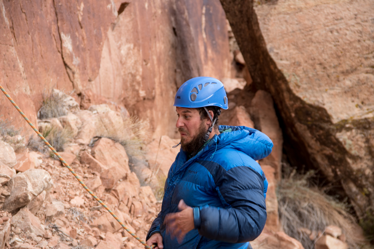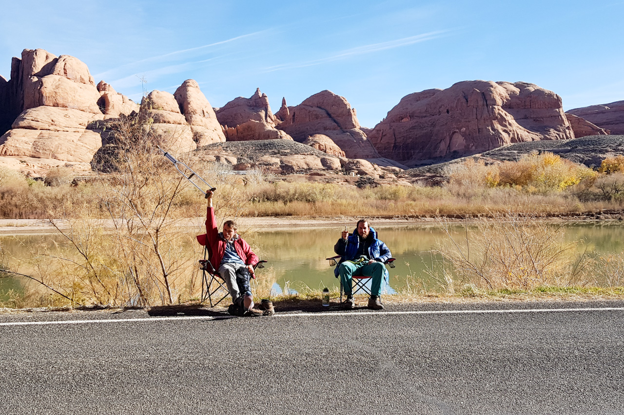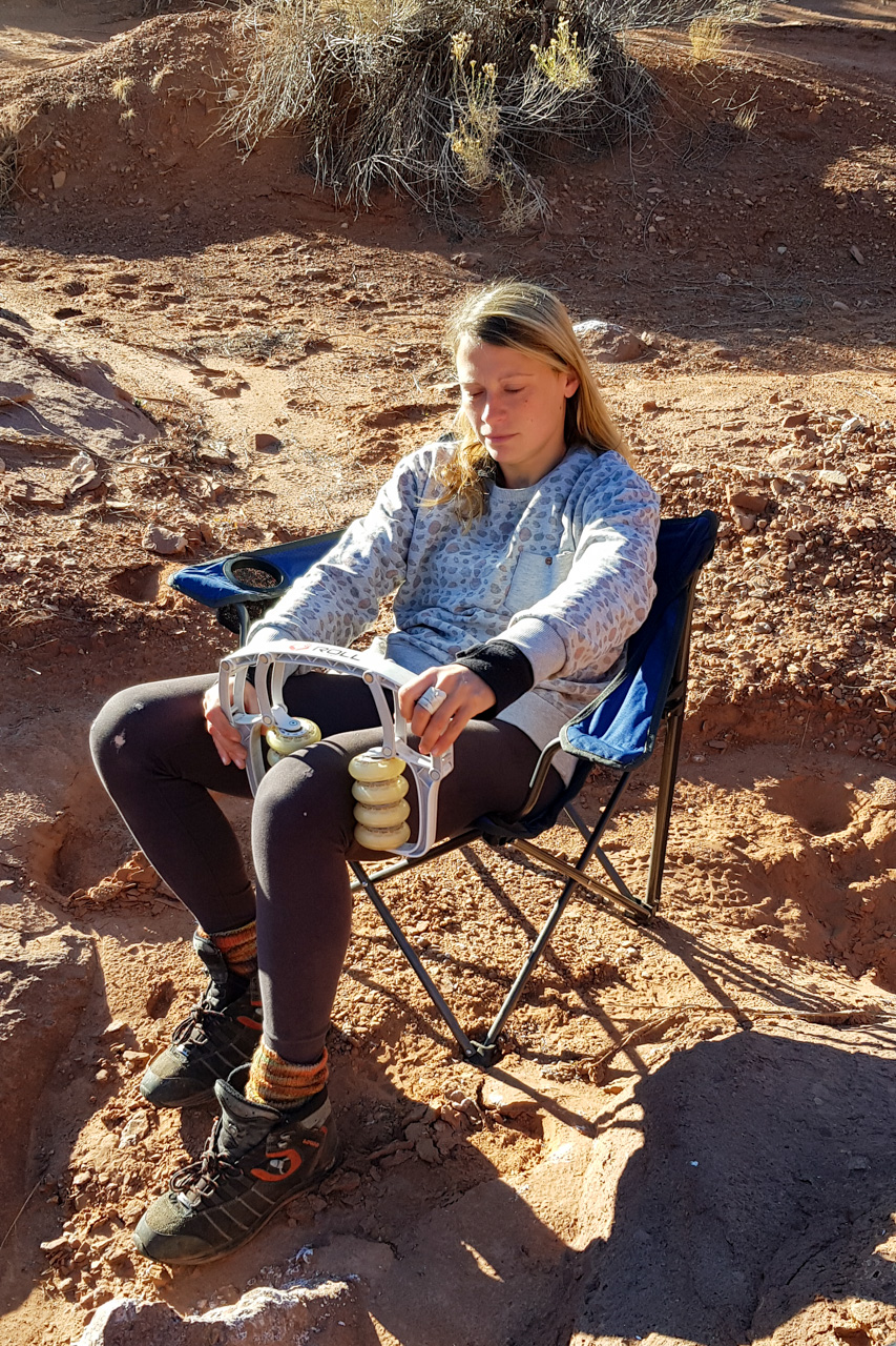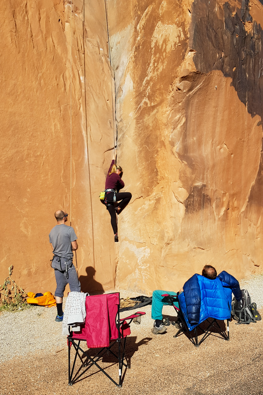 Ende November stand außerdem Thanksgiving ins Haus, was von vielen Kletterern als Anlass verwendet wird, um im Risskletter-Mekka Indian Creek das entsprechende „Creeksgiving“ zu feiern. Unter den gefühlt tausenden anderen Kletterern, welche aus den umliegenden Staaten nach Utah, bzw. Indian Creek, kamen (vorranging aus Kalifornien und Colorado) waren zu unserer Freude auch Colin und Kirill aus Boulder. Ursprünglich wollten wir bis Thanksgiving ja schon einiges an Risskletter-Erfahrung gesammelt haben und unser neu Erlerntes unseren Besuchern demonstrieren, aber wie ihr ja bereits wisst, ist alles anders gekommen. Glücklicherweise hatten Colin und Kirill nichts dagegen, das ein oder andere Toprope einzuhängen, um Franzi und Dan die ersten „Risskletter-Gehversuche“ zu ermöglichen. Und auch unser Versehrter kam nicht zu kurz: für Piet hatte Colin einen ultra-leichten Campingstuhl dabei, den man leicht zum Wandfuß tragen konnte und von dem aus die Rissklettershow angenehm zu verfolgen war.