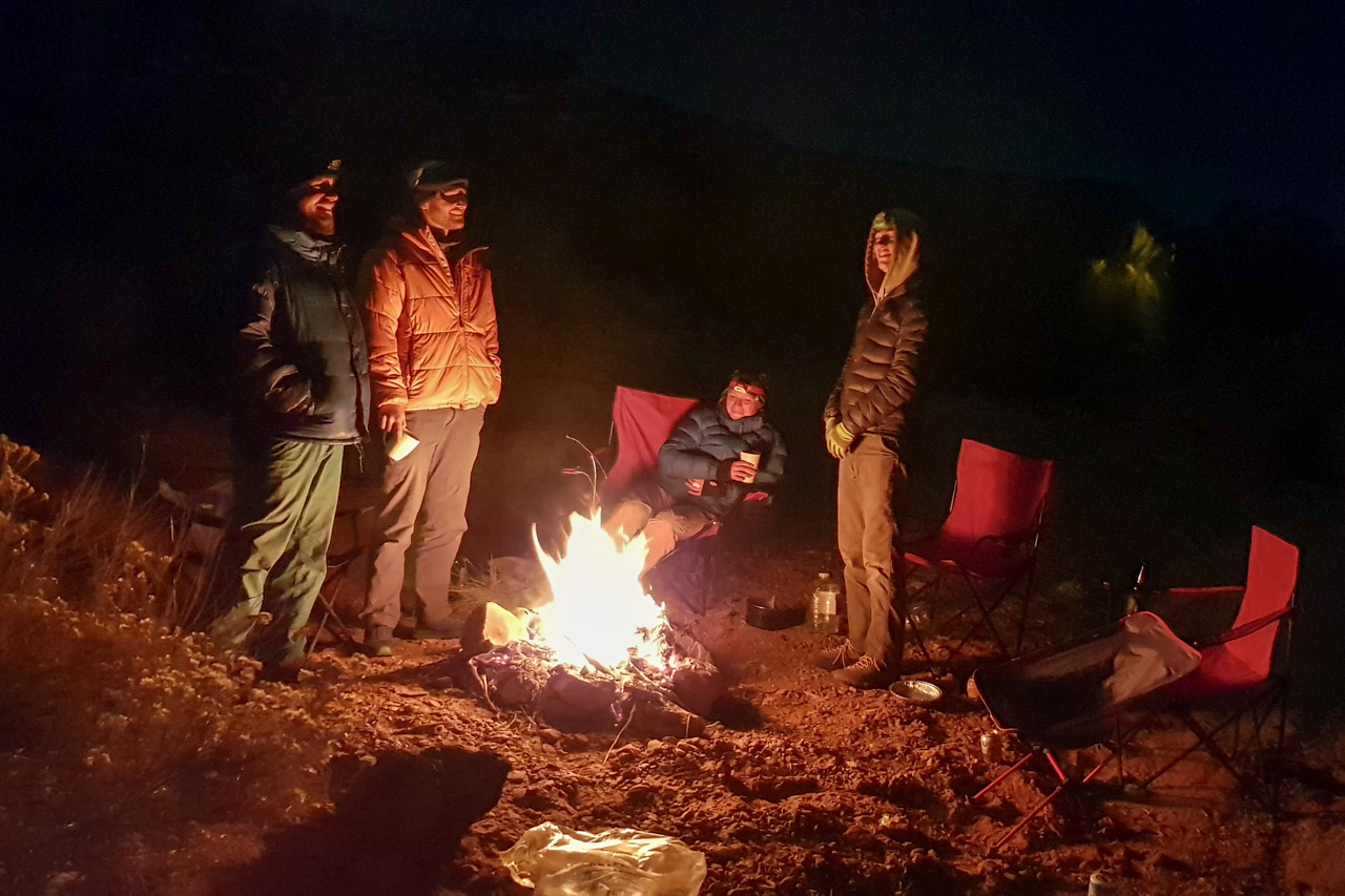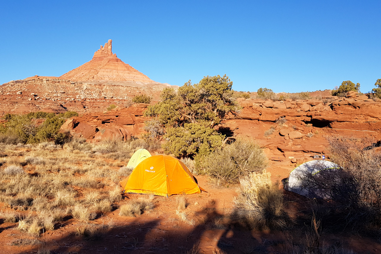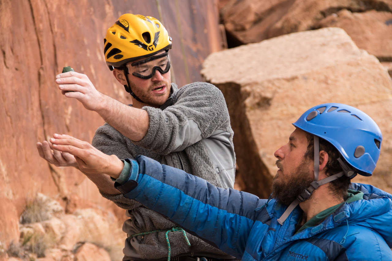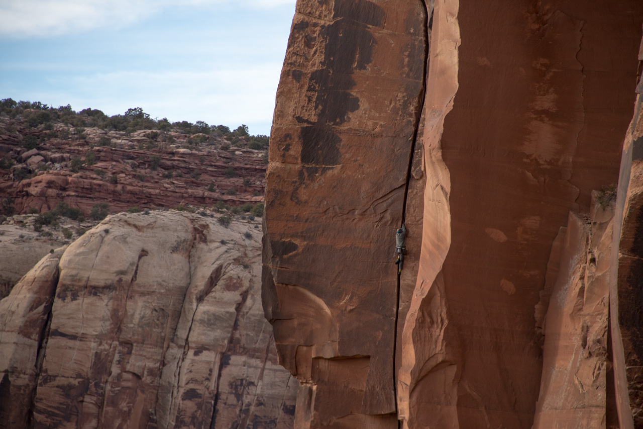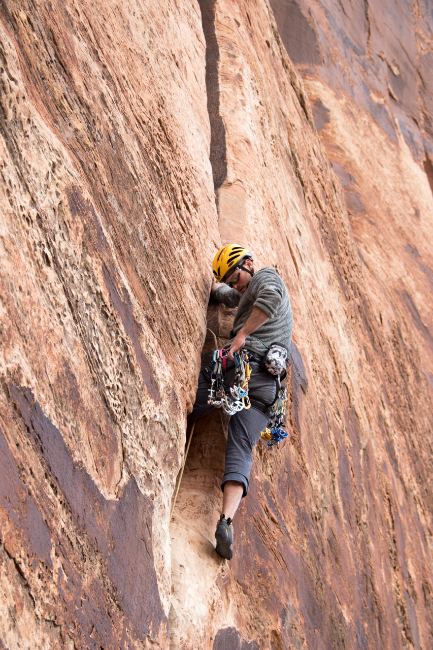 Ende November stand außerdem Thanksgiving ins Haus, was von vielen Kletterern als Anlass verwendet wird, um im Risskletter-Mekka Indian Creek das entsprechende „Creeksgiving“ zu feiern. Unter den gefühlt tausenden anderen Kletterern, welche aus den umliegenden Staaten nach Utah, bzw. Indian Creek, kamen (vorranging aus Kalifornien und Colorado) waren zu unserer Freude auch Colin und Kirill aus Boulder. Ursprünglich wollten wir bis Thanksgiving ja schon einiges an Risskletter-Erfahrung gesammelt haben und unser neu Erlerntes unseren Besuchern demonstrieren, aber wie ihr ja bereits wisst, ist alles anders gekommen. Glücklicherweise hatten Colin und Kirill nichts dagegen, das ein oder andere Toprope einzuhängen, um Franzi und Dan die ersten „Risskletter-Gehversuche“ zu ermöglichen. Und auch unser Versehrter kam nicht zu kurz: für Piet hatte Colin einen ultra-leichten Campingstuhl dabei, den man leicht zum Wandfuß tragen konnte und von dem aus die Rissklettershow angenehm zu verfolgen war.
