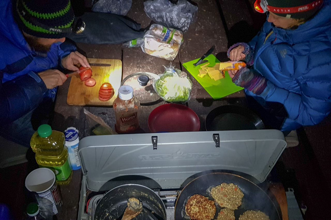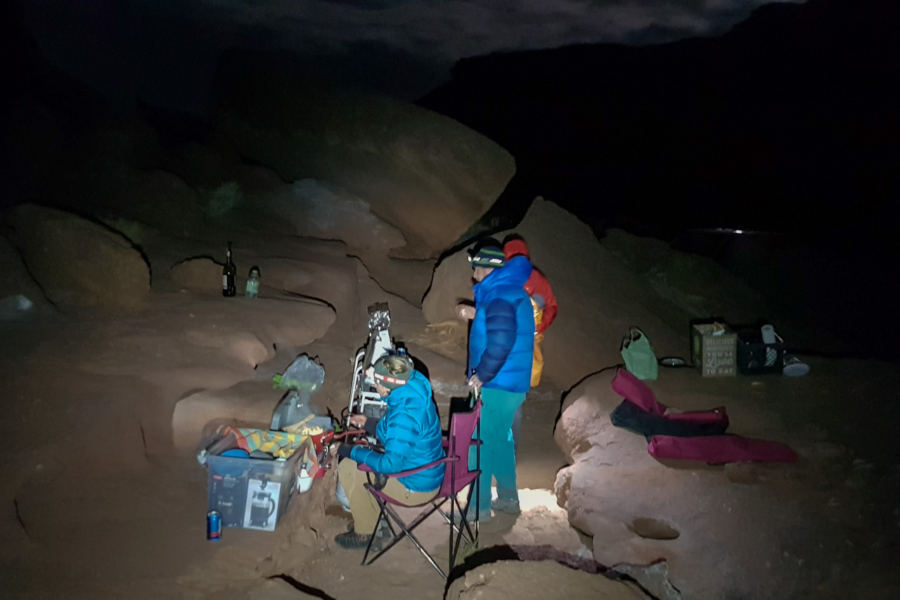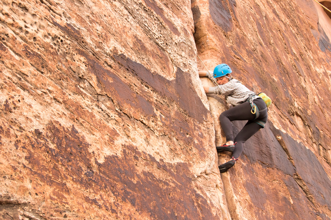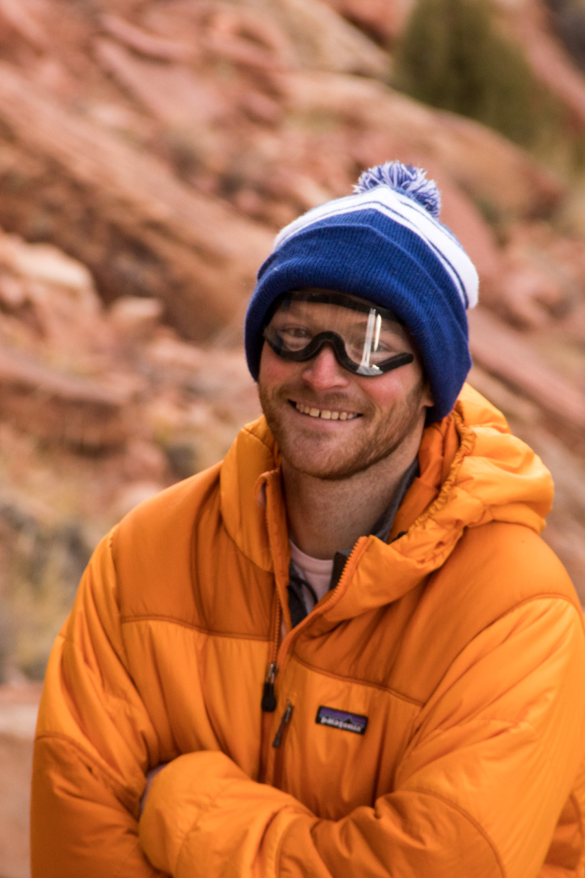 Ende November stand außerdem Thanksgiving ins Haus, was von vielen Kletterern als Anlass verwendet wird, um im Risskletter-Mekka Indian Creek das entsprechende „Creeksgiving“ zu feiern. Unter den gefühlt tausenden anderen Kletterern, welche aus den umliegenden Staaten nach Utah, bzw. Indian Creek, kamen (vorranging aus Kalifornien und Colorado) waren zu unserer Freude auch Colin und Kirill aus Boulder. Ursprünglich wollten wir bis Thanksgiving ja schon einiges an Risskletter-Erfahrung gesammelt haben und unser neu Erlerntes unseren Besuchern demonstrieren, aber wie ihr ja bereits wisst, ist alles anders gekommen. Glücklicherweise hatten Colin und Kirill nichts dagegen, das ein oder andere Toprope einzuhängen, um Franzi und Dan die ersten „Risskletter-Gehversuche“ zu ermöglichen. Und auch unser Versehrter kam nicht zu kurz: für Piet hatte Colin einen ultra-leichten Campingstuhl dabei, den man leicht zum Wandfuß tragen konnte und von dem aus die Rissklettershow angenehm zu verfolgen war.