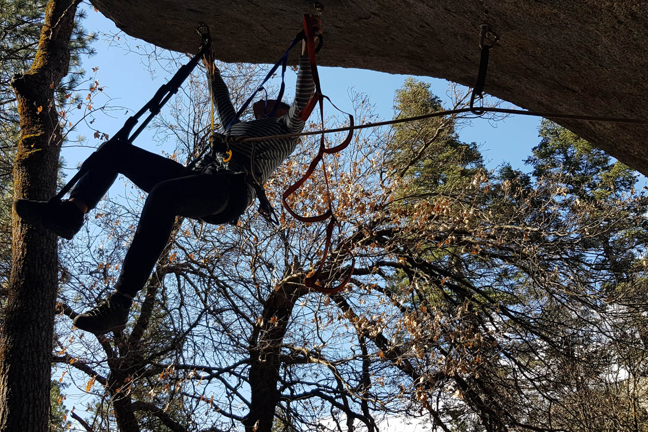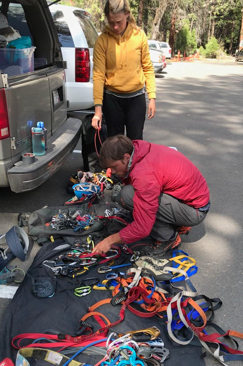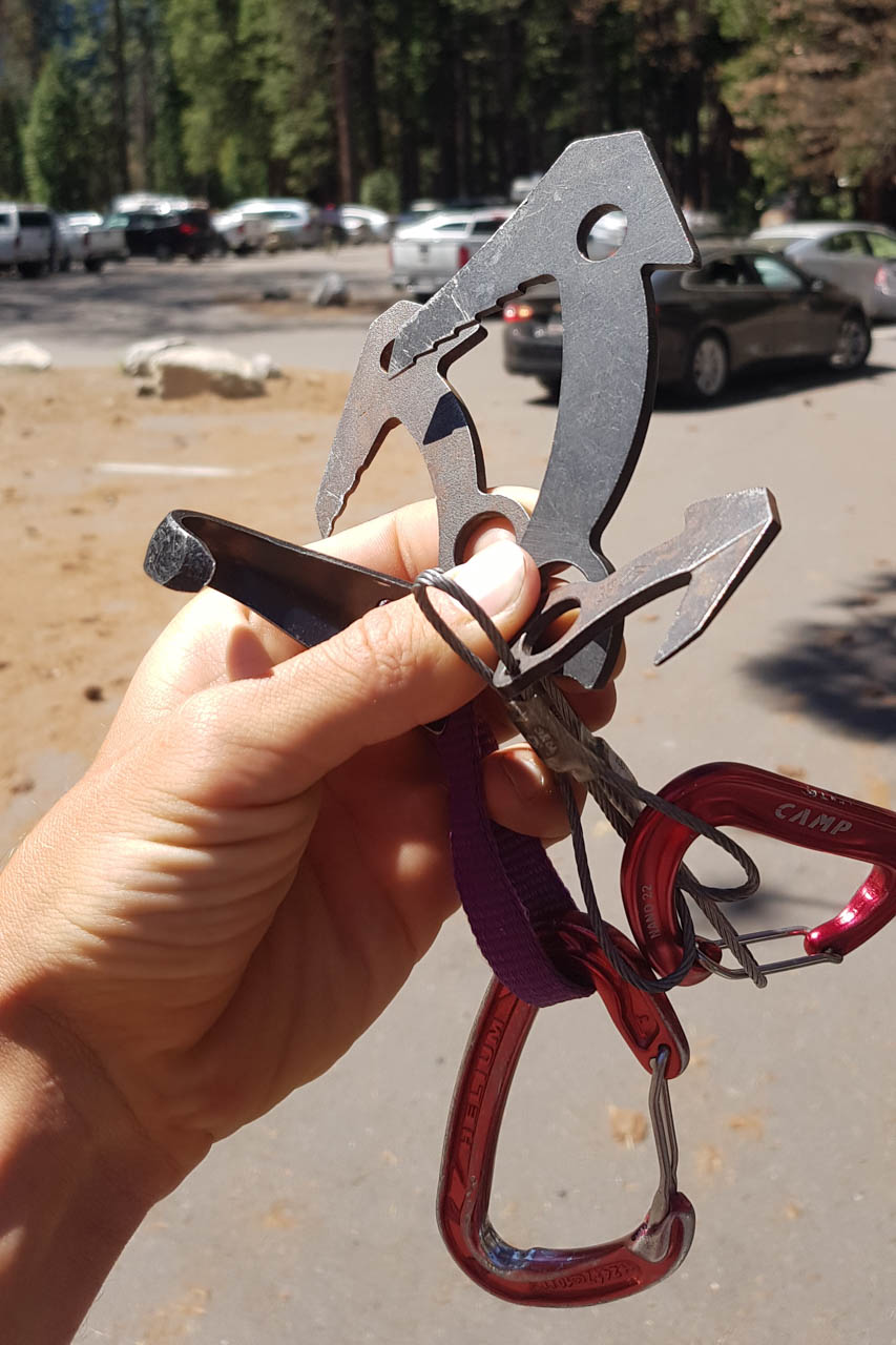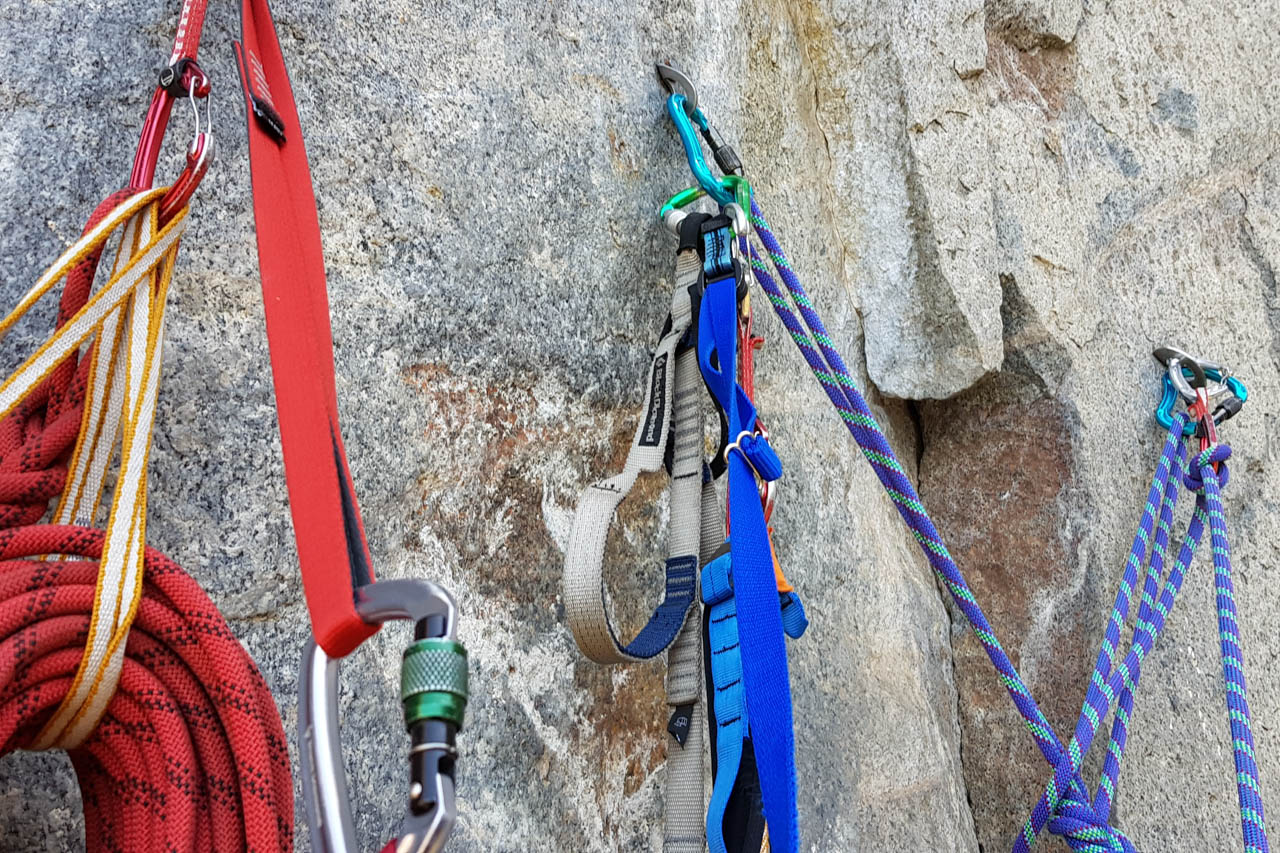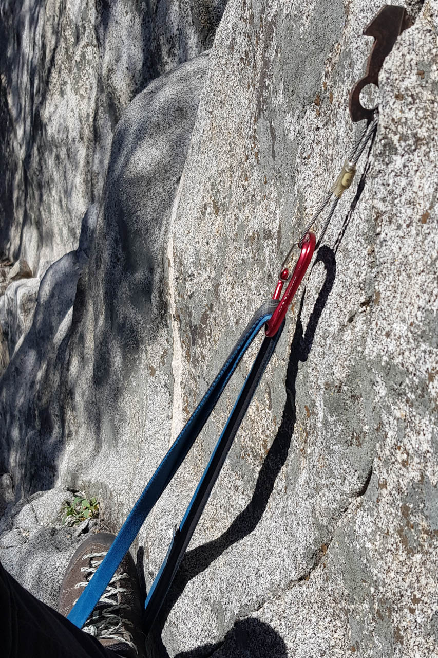 Nach 2 Tagen Bedenkzeit, viel Internetrecherche zum Leaning Tower und einigen zusammen gekletterten Klettermetern haben wir uns von Robert und der Gelegenheit, es einfach mal ausprobieren zu können, mitreißen lassen und haben zugesagt. Unser Frei-Kletter-Plan war damit erst mal ad acta gelegt und durch eine Kurzschulung im Big-Wall-Klettern ersetzt worden. Neben den uns bisher bekannten Friends und Keilen verwendet der Big Wall Kletterer nämlich eine wesentlich größere Trickkiste: Steigklemmen, Seilrollen, Ball-Nuts, Sky Hooks, Cam Hooks, Talons oder Peckers. Und laut der Routenbeschreibung wurde einiges davon in unserer geplanten Tour ‚abgefragt’. Glücklicherweise besaß Robert praktisch alles davon und wir mussten nur unsere persönlichen Sicherungsgerätschaften und Seile beisteuern. Nachdem die Franzi dann auch noch eine weitere Trittleiter sowie 2 Steigklemmen erworben hatte, waren wir ‚gerüstet’.