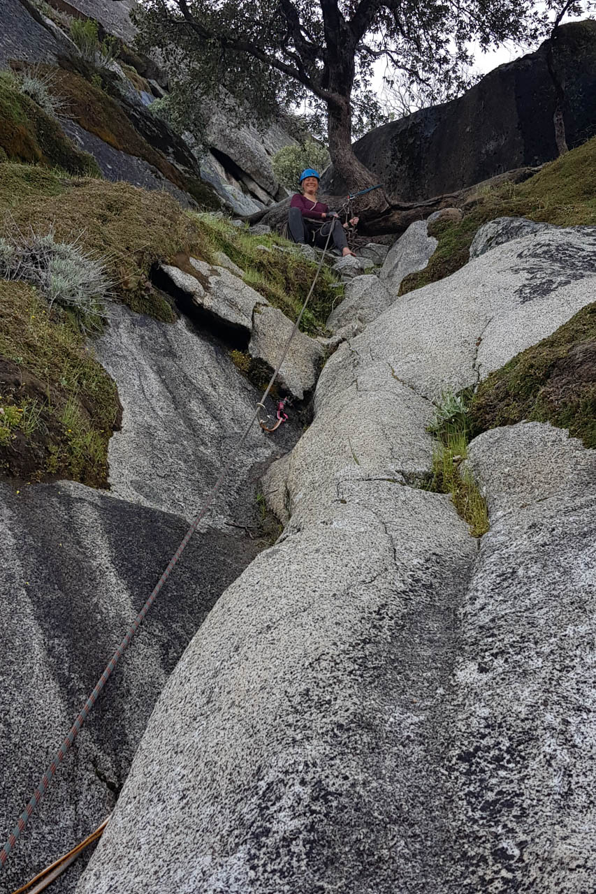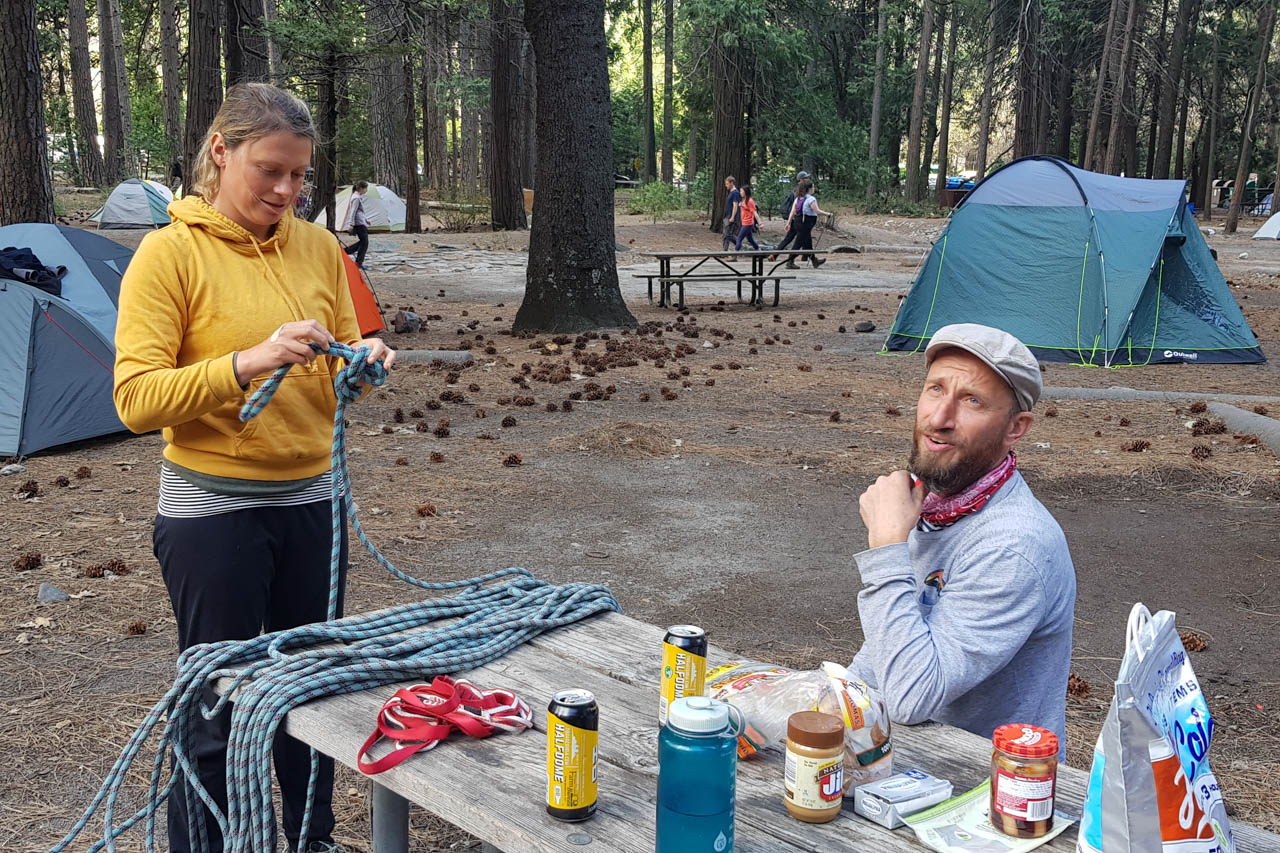 Während der ersten Tage tingelten wir also mit unserem ganzen Metallkram los und versuchten uns an die Felsen bzw. an die Kletterei darauf zu gewöhnen. Franzi stieg in dieser Zeit ihre ersten Seillängen im Yosemite vor und ‚baute’ die ersten Standplätze indem sie Bäume in der Wand mit Schlingenmaterial umwickelte. Piet dagegen stellte fest, dass die ganzen in der Erinnerung ‚einfachen’ Touren teilweise gar nicht so einfach waren oder aber einen gehörigen Gruselfaktor hatten. Mit der Zeit kamen dann aber auch ein paar Erfolgsmomente dazu, in die man zumindest eine kleine Verbesserung seit dem letzten Besuch interpretieren kann. Während unser ersten Woche haben wir auch einige andere Kletterer kennen gelernt, allen voran einen Kerl der am Wandfuß auf 2 Meter Raum dauernd hin und her traversiert ist und die ganze Zeit etwas von „Friction“ gebrabbelt hat: Robert.