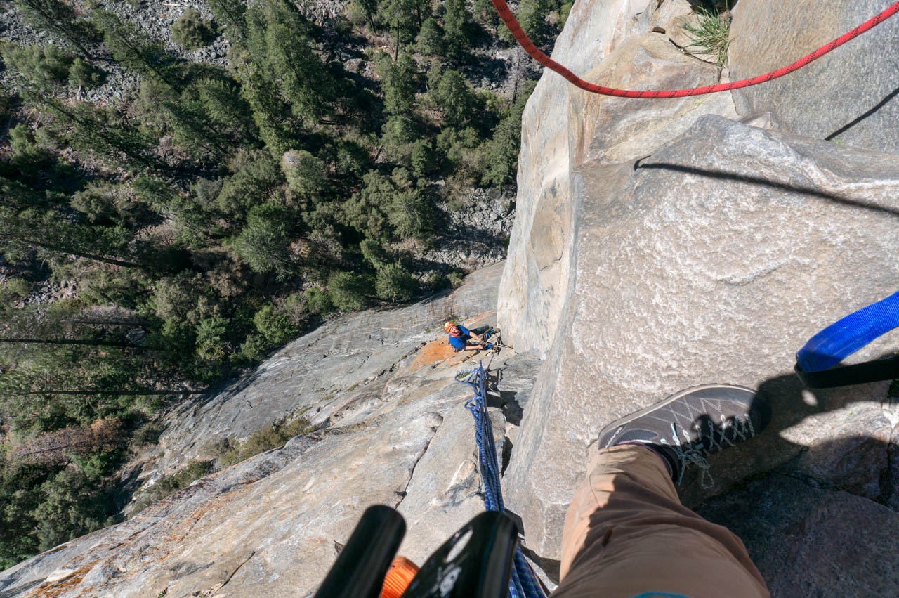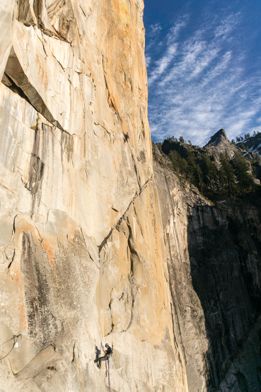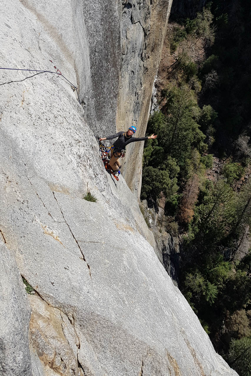 Nach einigen Übungsrunden war es dann am 22. April soweit. Das Weckergebimmel um 5 Uhr kündigte an, dass es jetzt ernst werden würde und nachdem wir unsere Erdnuss-/Walnussbutter-Marmelade Sandwiches für die nächsten zwei Tage vorbereitet hatten, ging es auch schon los zum Einsatzort. Robert holte uns ab, fuhr uns zum Parkplatz an den Bridal Veil Falls und wir begannen zu dritt den Aufstieg. Mit einer gesunden schauen-wir-mal-ansonsten-drehen-wir-halt-um-Einstellung legten wir den ausgesetzten Quergang zum Einstieg der Tour zurück und Piet begann mit dem Vorsteigen der ersten Seillängen. Der Plan sah vor, dass Piet die ersten vier Seillängen bis hin zur Ahwahnee Ledge vorsteigen sollte (Anmerkung: Das Luxushotel im Yosemite hieß bis vor kurzem noch „The Ahwahnee“). Zum Reinkommen war die erste Seillänge gleich ziemlich gut geeignet, da es sich zu großen Teilen um eine Hakenleiter handelt, wenn da nicht die zwei ‚Hook-Stellen’ wären. Robert hatte bereits herausgefunden, dass man entsprechende Stelle wohl mit Peckers und Skyhooks klettern können müsste, und trotz knirschendem Fels war dem dann auch so. Franzi hatte das Vergnügen mit dem Nachsteigen zu beginnen und kam sofort in den Genuss der Ausgesetztheit. Wegen der Querung in die steile Wand (bis hin zum Einstieg) brachten die herausgenommenen Zwischensicherungen häufig einen aufregenden Seilpendler mit sich. Der Dritte im Bunde, Robert, konnte dies dann noch mehr genießen. Somit hatte das Vor- sowie Nachsteigen seine eigenen Herausforderungen.