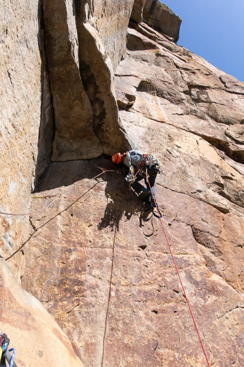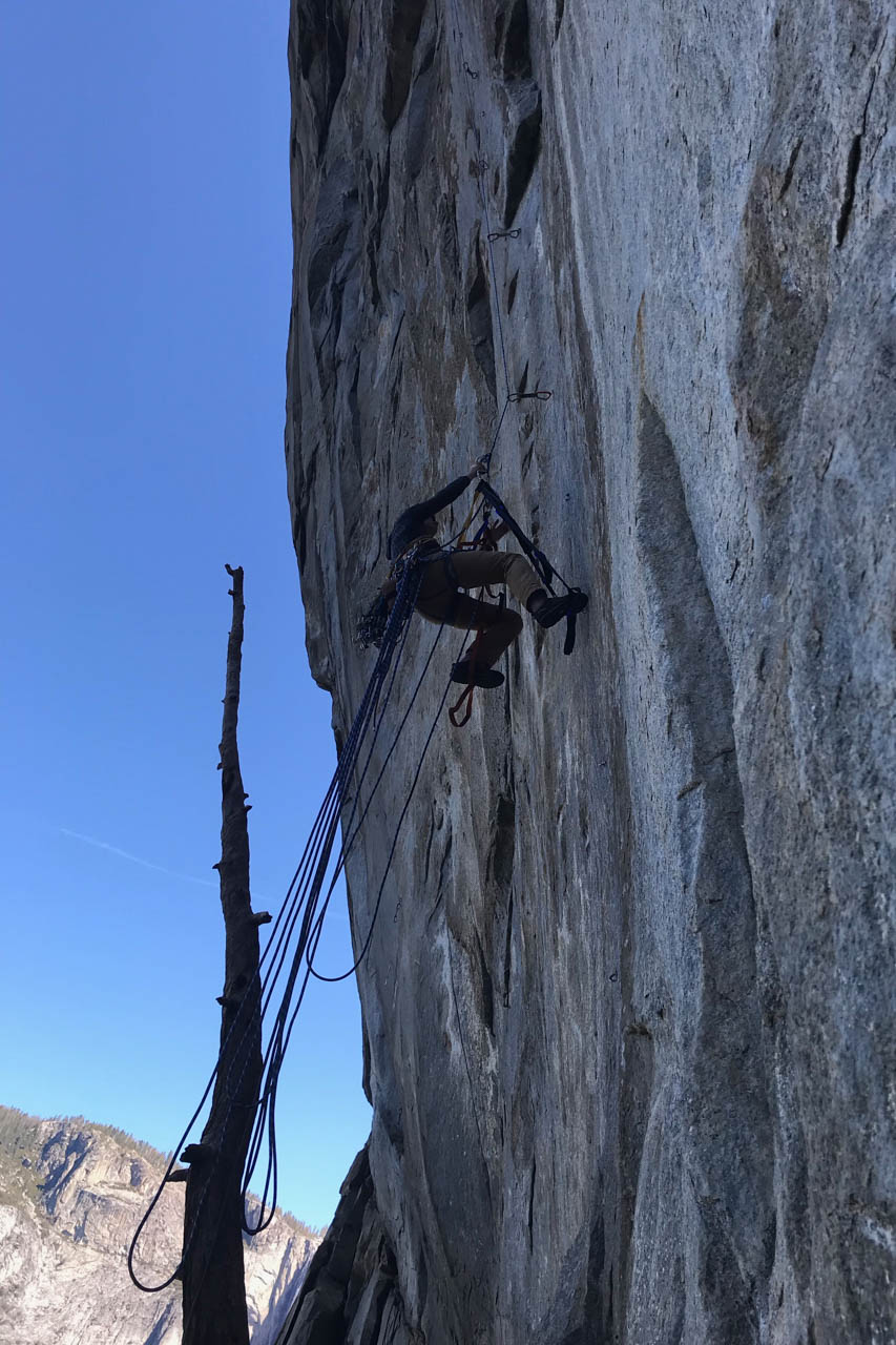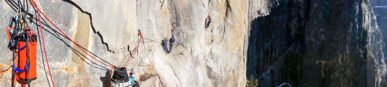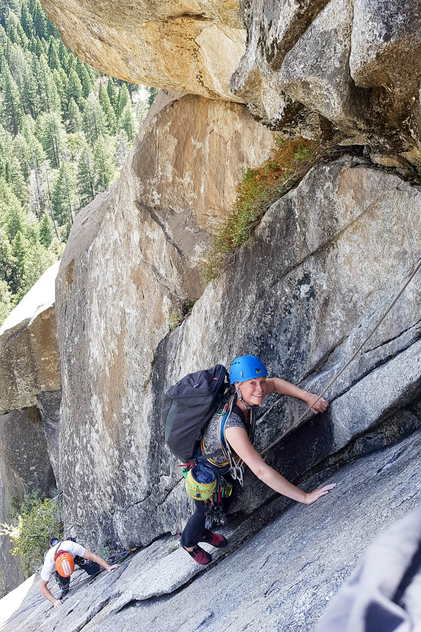 Nach einigen Übungsrunden war es dann am 22. April soweit. Das Weckergebimmel um 5 Uhr kündigte an, dass es jetzt ernst werden würde und nachdem wir unsere Erdnuss-/Walnussbutter-Marmelade Sandwiches für die nächsten zwei Tage vorbereitet hatten, ging es auch schon los zum Einsatzort. Robert holte uns ab, fuhr uns zum Parkplatz an den Bridal Veil Falls und wir begannen zu dritt den Aufstieg. Mit einer gesunden schauen-wir-mal-ansonsten-drehen-wir-halt-um-Einstellung legten wir den ausgesetzten Quergang zum Einstieg der Tour zurück und Piet begann mit dem Vorsteigen der ersten Seillängen. Der Plan sah vor, dass Piet die ersten vier Seillängen bis hin zur Ahwahnee Ledge vorsteigen sollte (Anmerkung: Das Luxushotel im Yosemite hieß bis vor kurzem noch „The Ahwahnee“). Zum Reinkommen war die erste Seillänge gleich ziemlich gut geeignet, da es sich zu großen Teilen um eine Hakenleiter handelt, wenn da nicht die zwei ‚Hook-Stellen’ wären. Robert hatte bereits herausgefunden, dass man entsprechende Stelle wohl mit Peckers und Skyhooks klettern können müsste, und trotz knirschendem Fels war dem dann auch so. Franzi hatte das Vergnügen mit dem Nachsteigen zu beginnen und kam sofort in den Genuss der Ausgesetztheit. Wegen der Querung in die steile Wand (bis hin zum Einstieg) brachten die herausgenommenen Zwischensicherungen häufig einen aufregenden Seilpendler mit sich. Der Dritte im Bunde, Robert, konnte dies dann noch mehr genießen. Somit hatte das Vor- sowie Nachsteigen seine eigenen Herausforderungen.