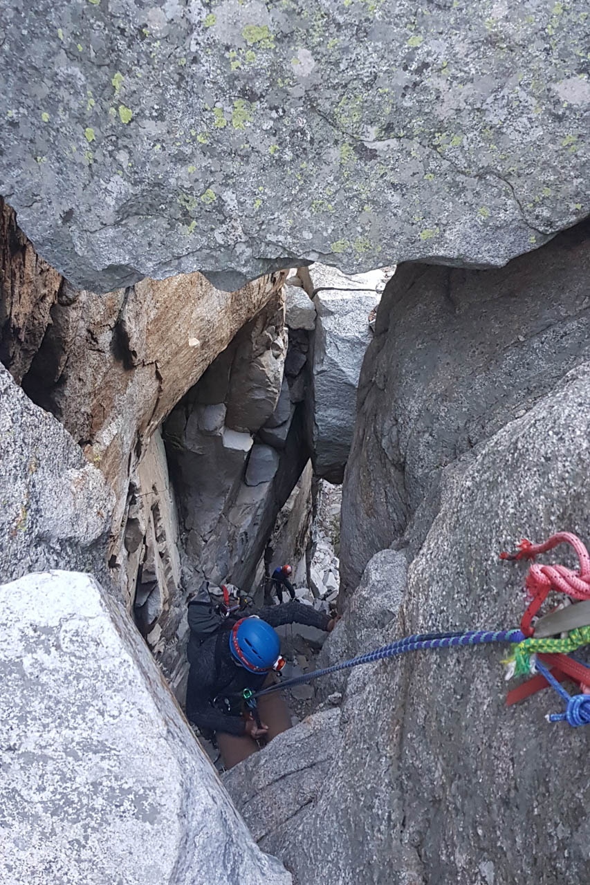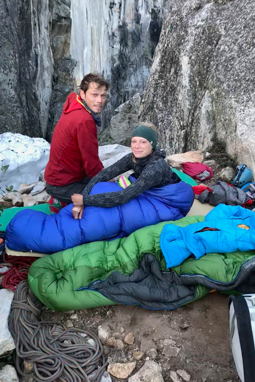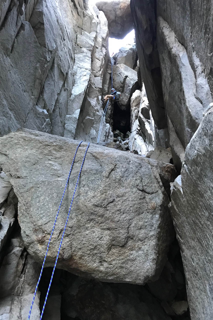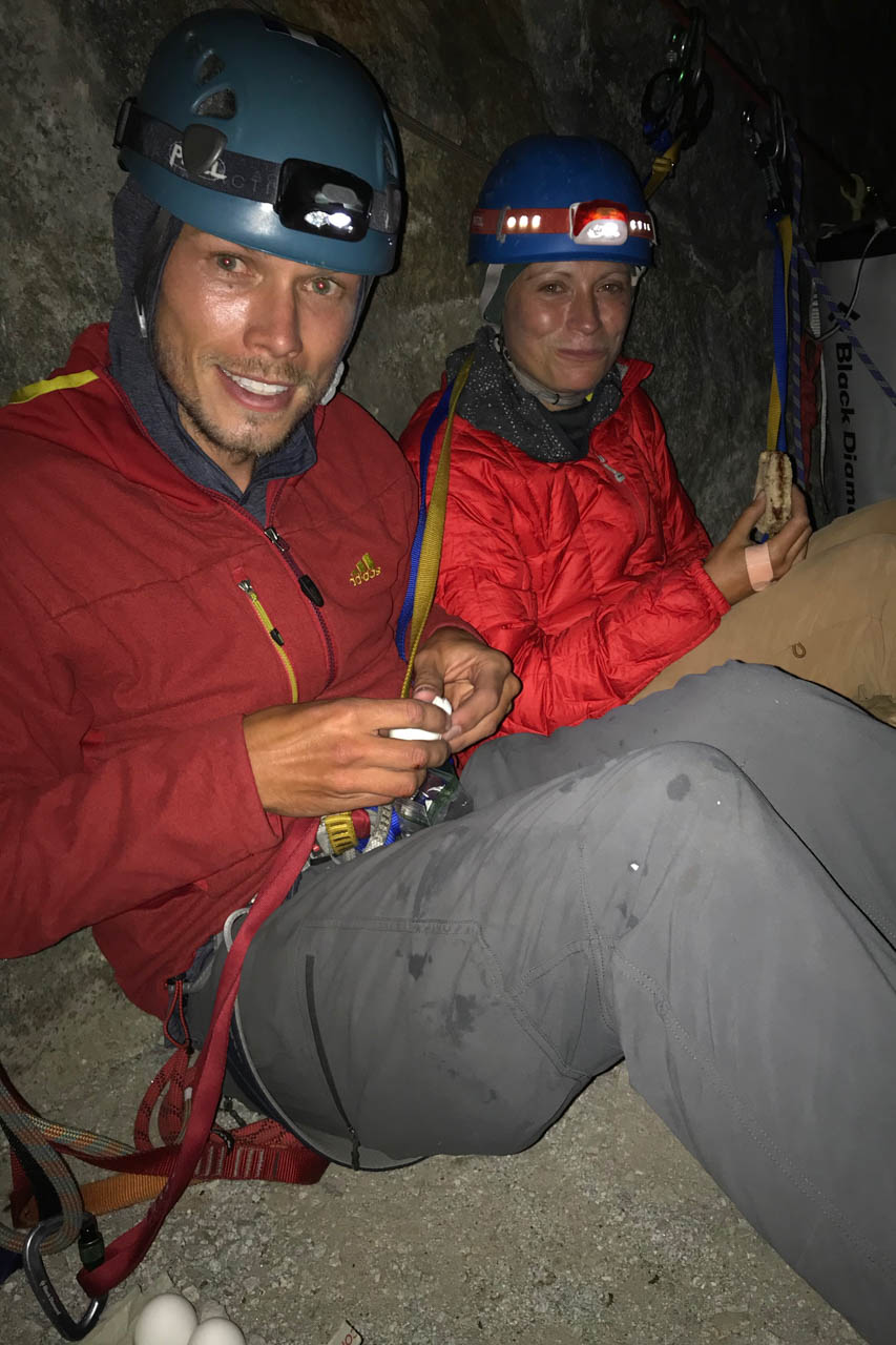 Irgendetwas musste ja noch schief gehen – uns blieb prompt das Seil hängen und da standen wir dann nun an einer ollen Sanduhr (Felsformation, um die Schlingen gelegt werden können), inmitten einer riesen Granitplatte in den letzten Minuten Tageslicht. Robert legte nach kurzem Überlegen ausgerüstet mit Stirnlampe und einem weiteren Seil los und konnte das verklemmte Seil zum Glück befreien – aber der Zeitverlust war dann doch etwas lästig. Vor allem da es nun wirklich dunkel wurde. Nach den insgesamt ersten 100 Abseilmetern erreichten wir einen Sattel hinter dem Leaning Tower und mussten dort die Fortsetzung der Abseilpiste finden. Schneeblöcke, Wasser und potentielles Abklettern verhinderten dann letztendlich aber, dass wir die nächsten Bohrhaken zum weiteren Abseilen entdeckten. Während Piet noch abseilte trafen Franzi und Robert bereits die einzig richtige Entscheidung. Wir hatten noch genügend Wasser und noch einige Müsliriegel – lieber noch einmal biwakieren und dann im Tageslicht weitermachen. Mit einer aufgeschnittenen Wasserflasche konnten wir zudem noch jede Menge Schmelzwasser direkt von den Schneebergen zapfen, sodass an diesem Abend keiner durstig ins Bett musste.