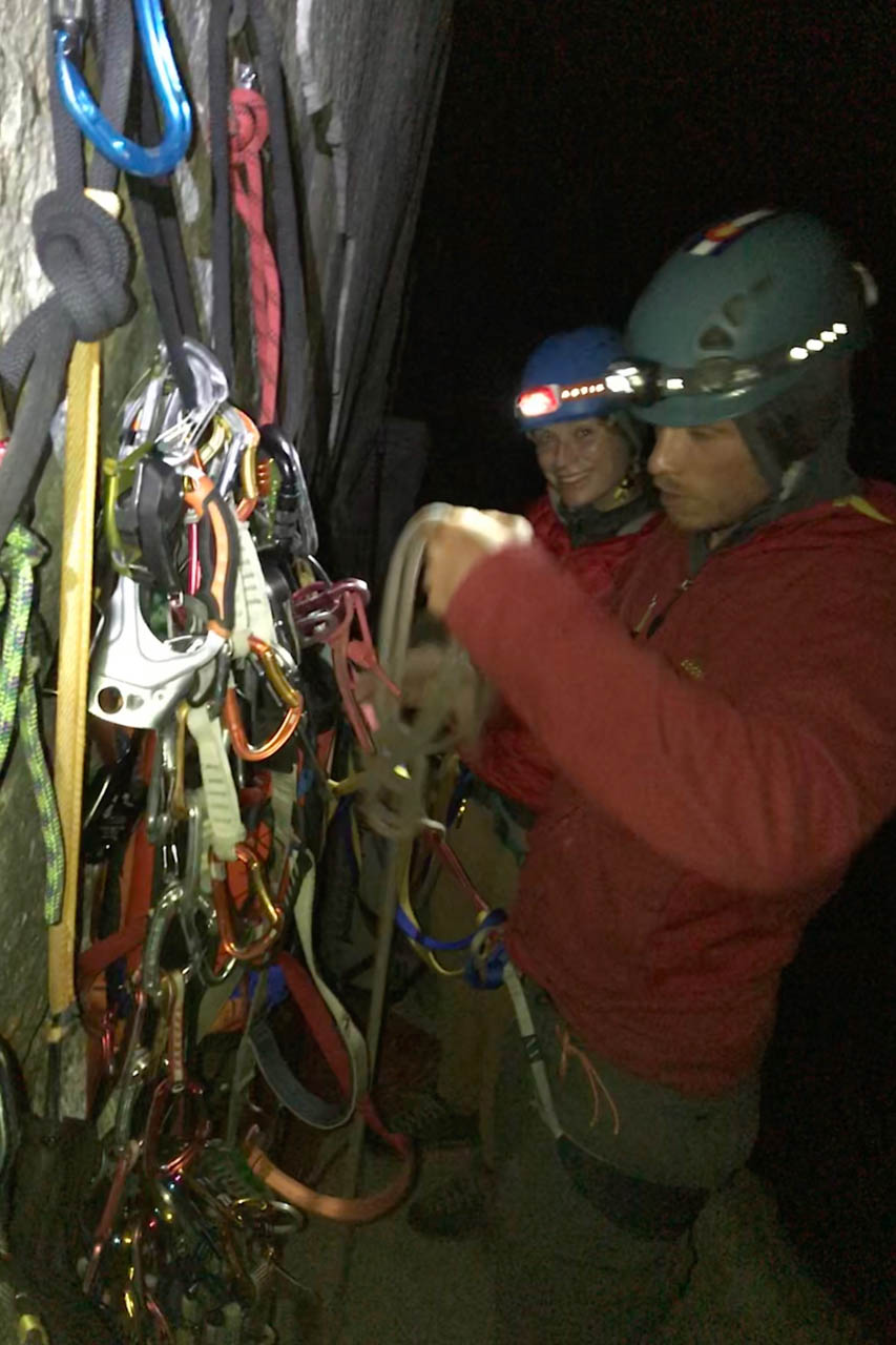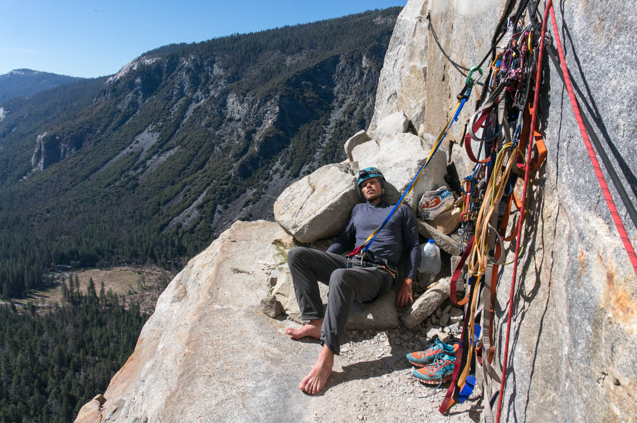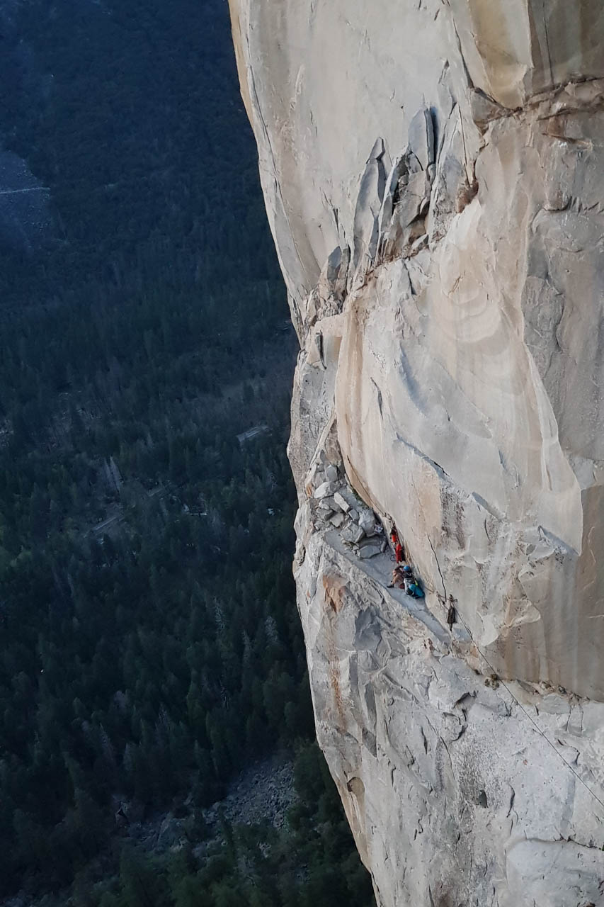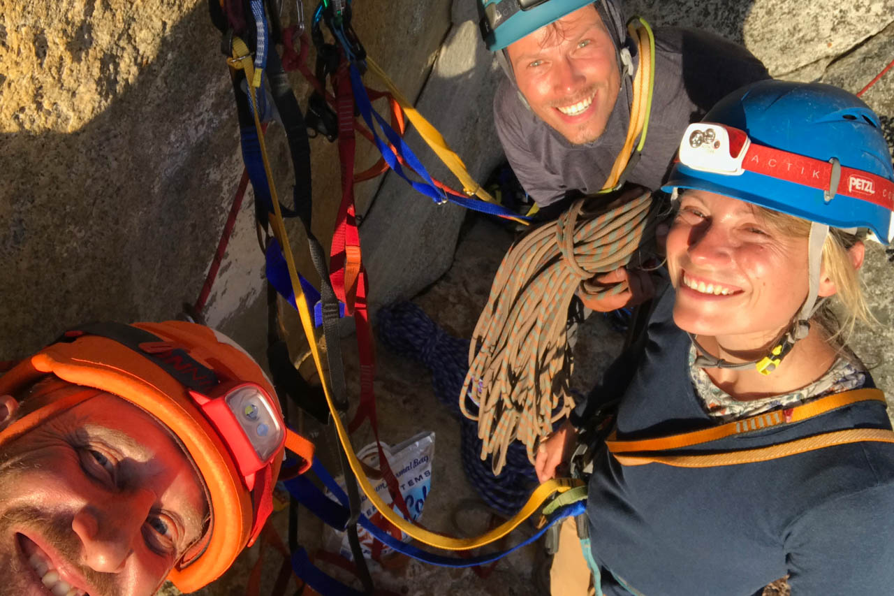 Abschluss des ersten Vorstiegsblocks war eine gruselige Aussteigsplatte. welche direkt in der Ahwahnee Ledge mündete, und ziemlich zeitgleich war dann auch das letzte Quäntchen Vorstiegswille bei Piet aufgebraucht. Nachdem der Haulbag, liebevoll auch das ‚Schwein’ genannt, auch bis zur Ledge hochgezerrt war, konnte Piet sich erst mal erholen während Franzi und Robert am fixierten Seil mit den Steigklemmen hinterherstiegen (Anmerkung: Der Haulbag ist die Reisetasche des Bigwall-Kletterers). Nach einer ausgiebigen Pause (wir glaubten gut in der Zeit zu sein), begann der zweite Teil des Kletterprogramms: Robert’s Vorstieg der fünften und sechsten Seillänge. Vor allem an erstere hatte er unangenehme Erinnerungen – meisterte die Seillänge aber sicher und problemlos, sowie auch eine weiteren Freikletterteil mit Slopern (abschüssigen Griffen) und letztendlich auch die sechste Seillänge. Einziges Manko: unser Zeitmanagement. Denn als Piet es endlich zum Standplatz nach der sechsten Seillänge geschafft hatte war es bereits dunkel und wir waren nicht mehr viel mehr als 3 mit Stirnlampen erhellte Flecken in der Wand. Zeit zurück zur Ahwahnee Ledge abzuseilen… doch nach 50 Metern abseilen befand sich erhofftes Band nicht unter uns, sondern gute 10 Meter zu unserer linken. Mit dem letzten Mut wurde noch ein spannender Seilpendler durch die Dunkelheit vollführt und damit war der Tag dann endgültig beendet. Es folgte nur noch das Abendessen (hartgekochte Ostereier mit Senf, Sandwiches und Wein bzw. Half-Dome Bier) und danach ging es direkt, immer noch angeseilt, in die Schlafsäcke.