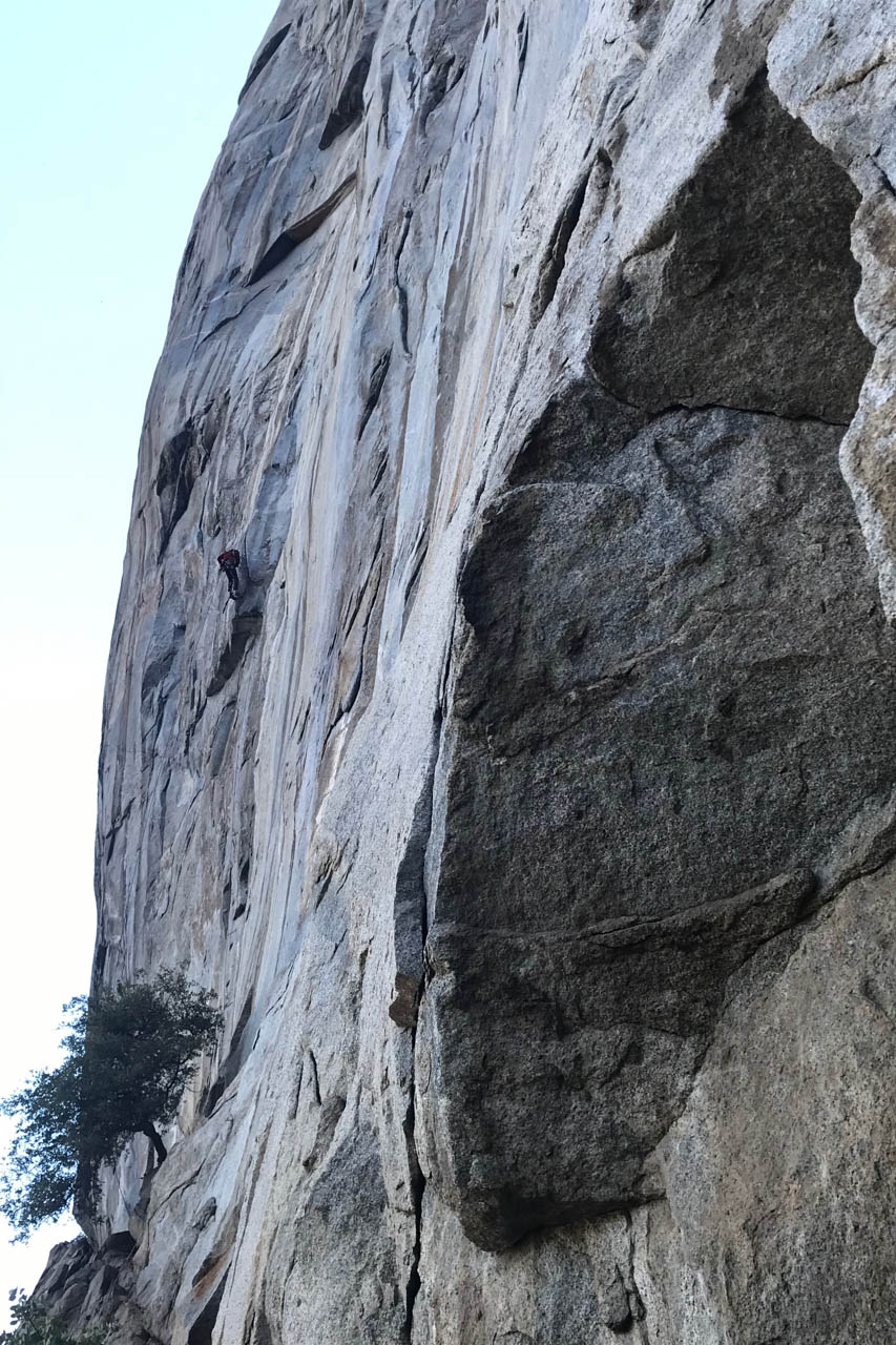 Anders als in Indian Creek bestehen die Felsen im Yosemite National Park nicht aus Sandstein, sondern aus Granit – und saugen sich damit nicht mit dem ganzen Regenwasser voll. Etwas Wind und etwas Sonne genügen üblicherweise schon und man kann abseits der Wasserläufe und –rinnen schon wieder mit dem Klettern beginnen. Neben den hervorragenden, wasserabweisenden Felsoberflächen beherbergt das Yosemite Valley (und auch der Rest des Parks) auch einige ganz besonders große Exemplare an Granitklötzen – allen voran den El Capitan und den Half Dome – zwei besonders begehrte Kletterziele. Diese werden üblicherweise mit einer Mischung aus freiem und technischem Klettern bezwungen, wovon wir uns während unseren Aufenthaltes zunächst erst mal nur mit ersterem beschäftigen wollten. Das heißt, wir wollten möglichst viele Seillängen klettern, welche mit selbst mitgebrachten Sicherungsmitteln abgesichert werden müssen – wollten aber zeitgleich die Zwischensicherungen nicht als Hilfsmittel zum Klettern verwenden (das wäre dann eher technisches Klettern gewesen).