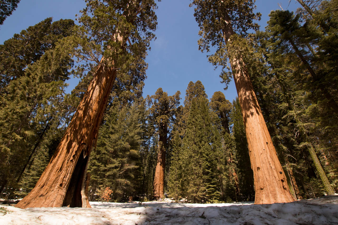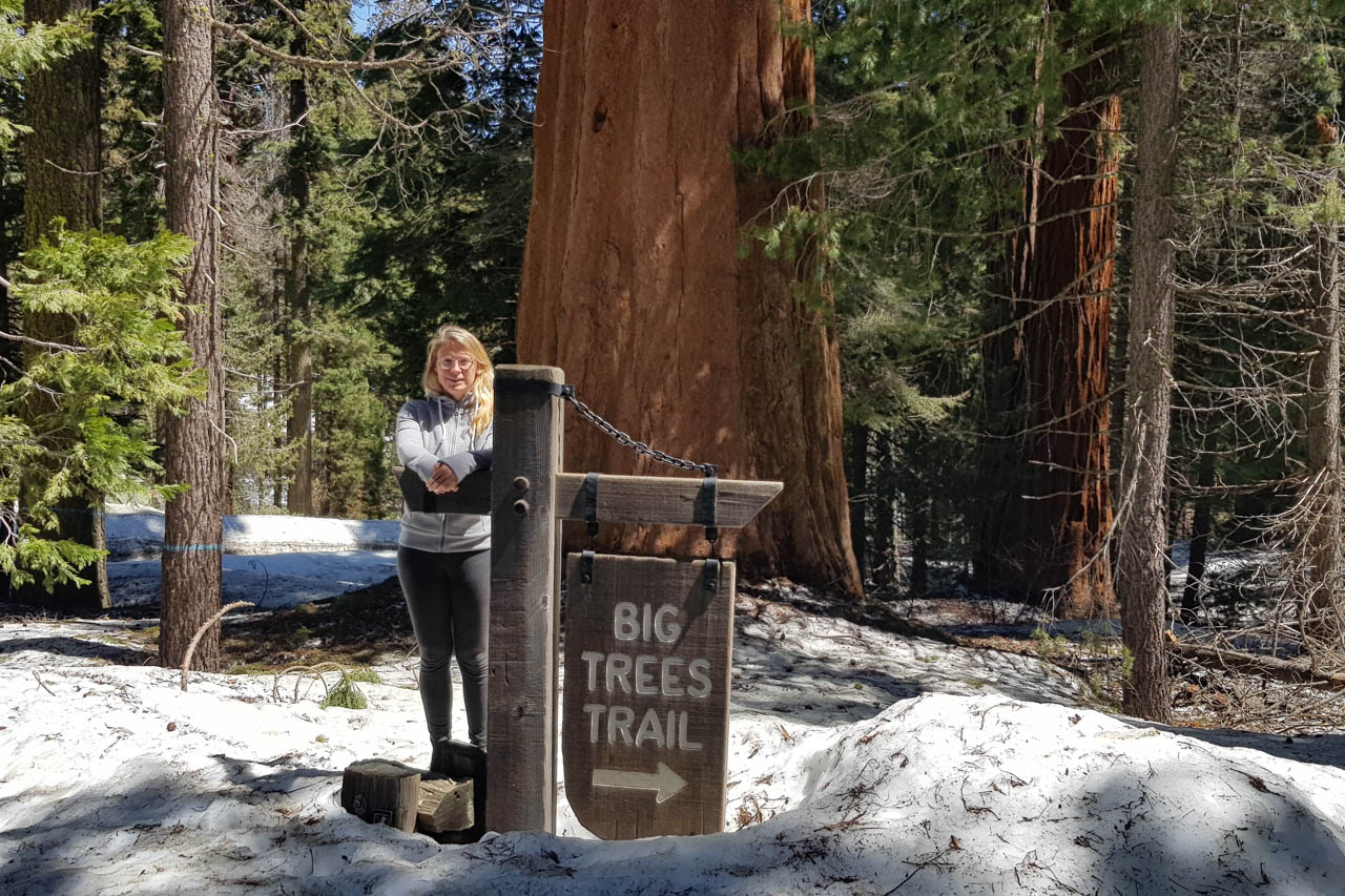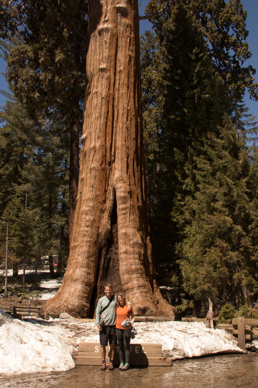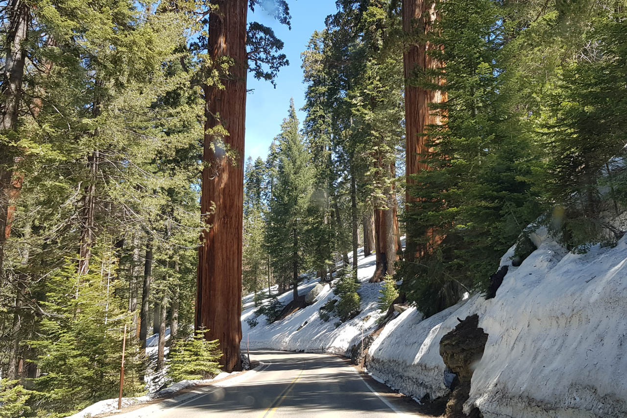 Nach einer Nacht vor dem Park machten wir uns am Morgen auf den Weg zu den dicken Sequioa-Bäumen. Laut dem Visitor Center sind diese Bäume ziemlich gnerschig was die Bodenqualität, Temperatur und die Niederschlagsmenge betrifft, sodass sie letztendlich nur in relativ eng umgrenzten Gebieten gedeihen. Zumindest für den Frühjahrbesucher sind diese Ansprüche nicht direkt vorteilhaft, denn sobald man die entsprechenden Höhenlagen mit dem Auto erklommen hat, steht man dann doch wieder im Schnee. Die Bäume sind ja aber groß genug, sodass sie selbst mit Schnee nicht zu übersehen sind.
