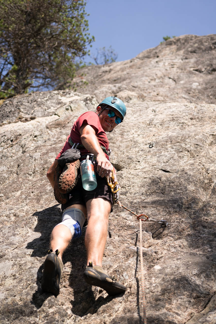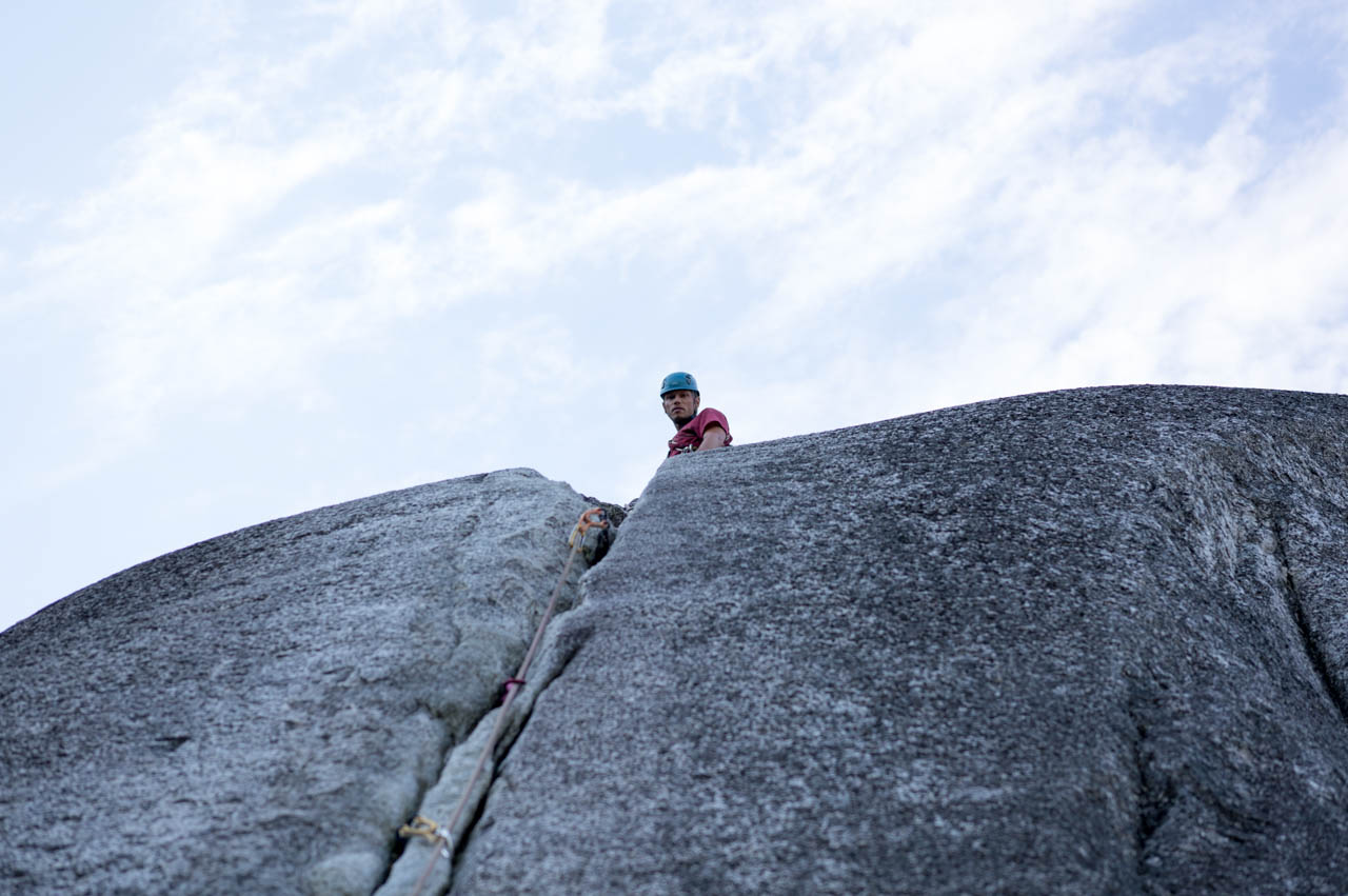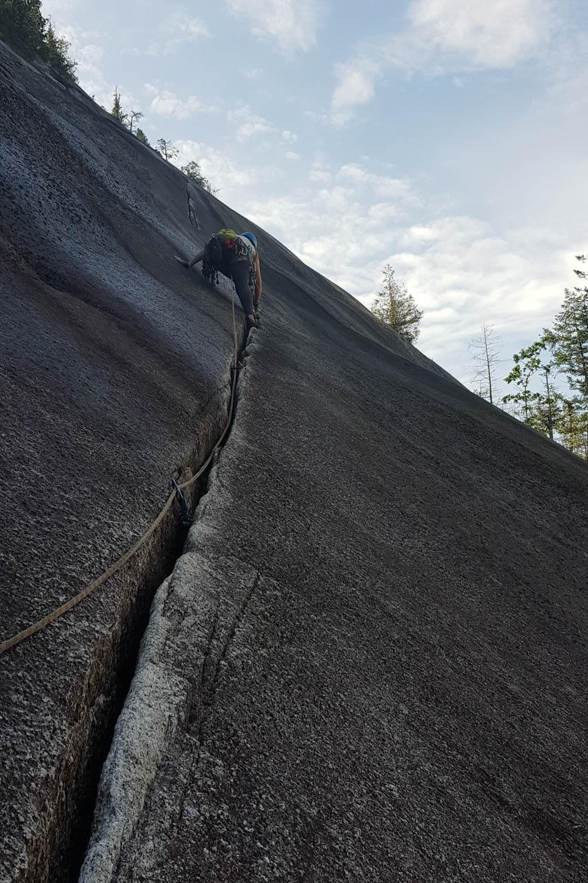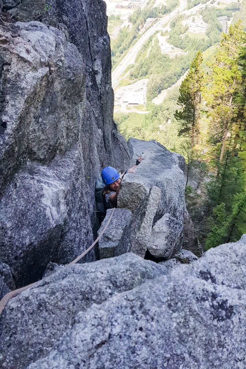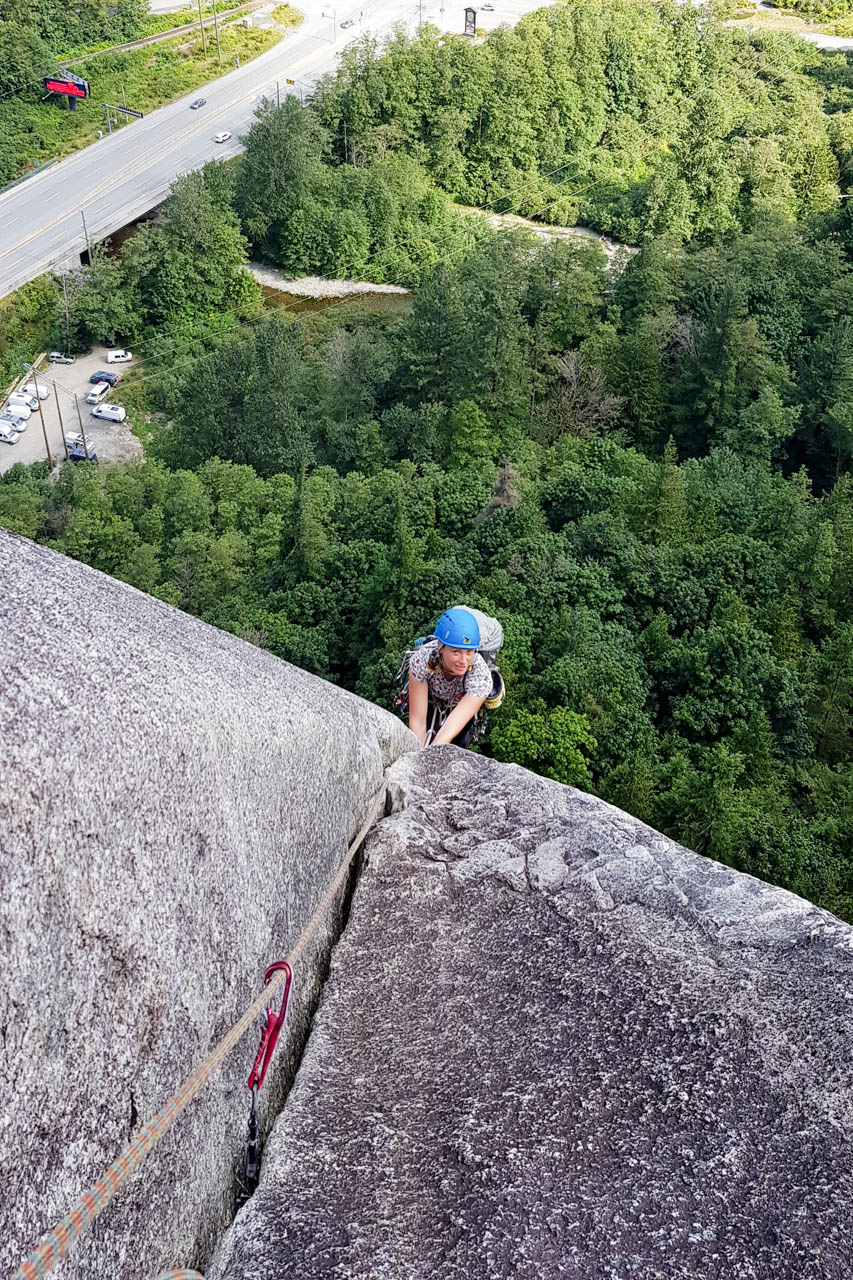 Eine wichtige Motivation für unseren Besuch in Squamish war unser Trad-Kletter-Können weiter auszubauen, und dafür sind hier die Voraussetzungen ziemlich gut. Verglichen mit anderen Gebieten gibt es hier nämlich, wie man es vom Sportklettern her kennt, Felsen an denen eine Trad-Tour neben der anderen ist. Das ist vor allem deshalb besonders, weil diese Touren ja üblicherweise Felsstrukturen folgen, welche auch eine Absicherung erlauben, wie zum Beispiel Rissen. Das einzige andere Gebiet welches uns einfällt, in dem so viele qualitativ hochwertige Touren auf engem Raum, oder gar nebeneinander, zu finden sind, ist Indian Creek, aber da wäre es im Sommer viel zu heiß. Außerdem findet man hier bei fast allen Einseillängen-Touren auch einen Umlenker mit zwei Haken, den man sogar häufig zu Fuß erreichen kann um sich ein Toprope einzuhängen – zum Lernen ists hier also wirklich ideal.