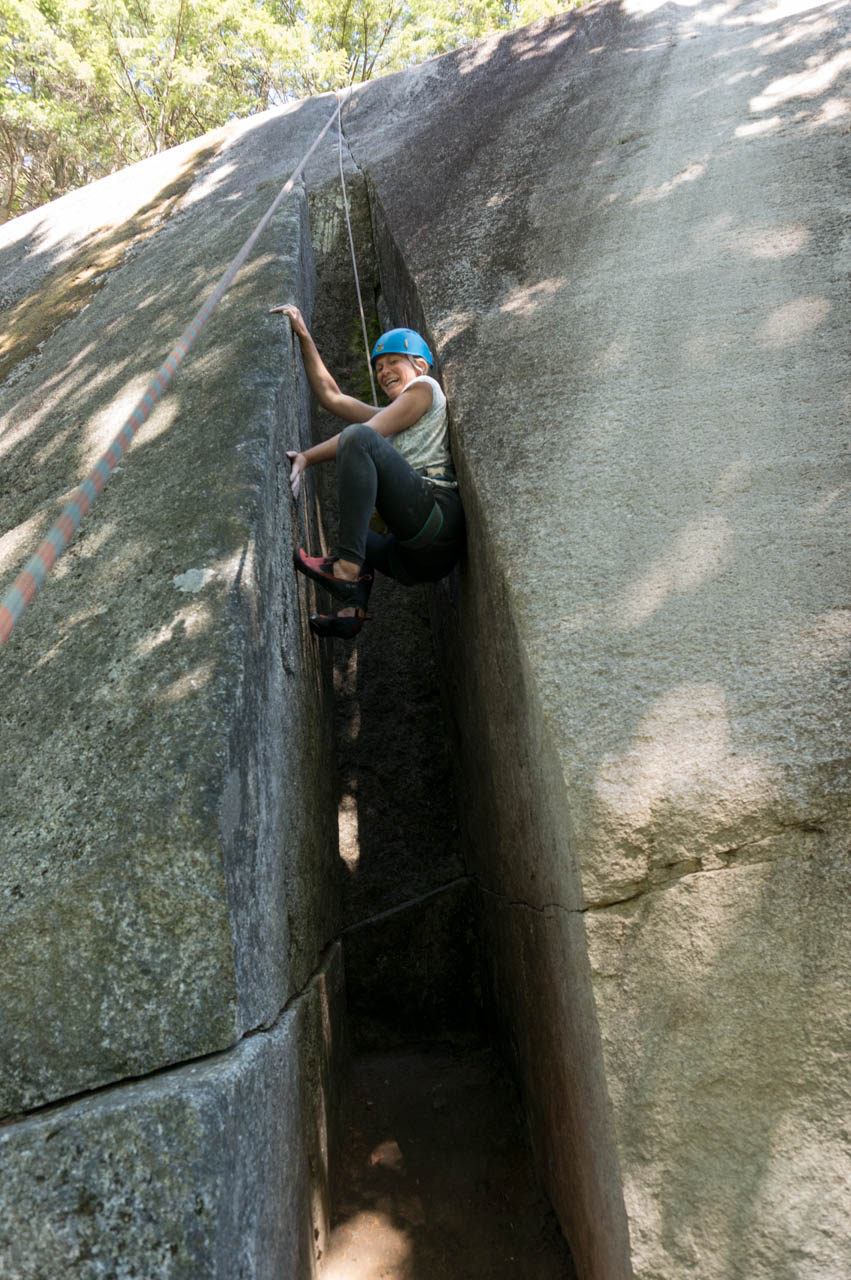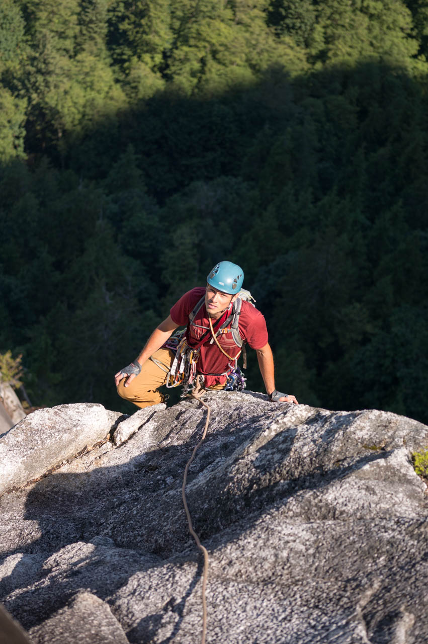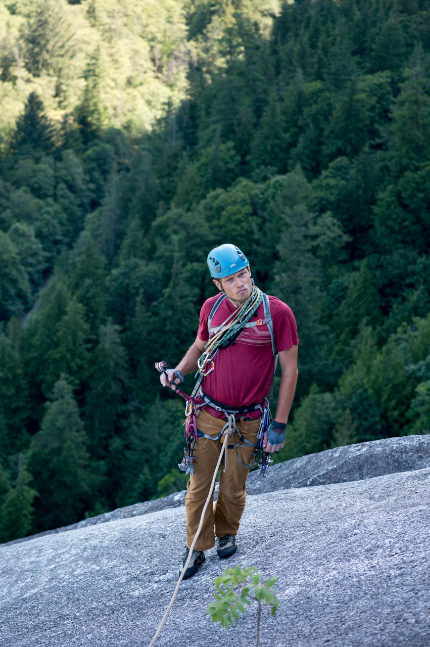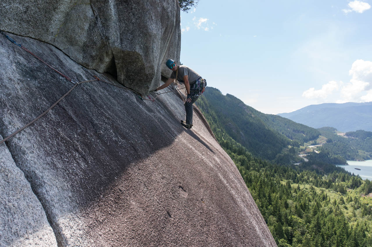 Eine wichtige Motivation für unseren Besuch in Squamish war unser Trad-Kletter-Können weiter auszubauen, und dafür sind hier die Voraussetzungen ziemlich gut. Verglichen mit anderen Gebieten gibt es hier nämlich, wie man es vom Sportklettern her kennt, Felsen an denen eine Trad-Tour neben der anderen ist. Das ist vor allem deshalb besonders, weil diese Touren ja üblicherweise Felsstrukturen folgen, welche auch eine Absicherung erlauben, wie zum Beispiel Rissen. Das einzige andere Gebiet welches uns einfällt, in dem so viele qualitativ hochwertige Touren auf engem Raum, oder gar nebeneinander, zu finden sind, ist Indian Creek, aber da wäre es im Sommer viel zu heiß. Außerdem findet man hier bei fast allen Einseillängen-Touren auch einen Umlenker mit zwei Haken, den man sogar häufig zu Fuß erreichen kann um sich ein Toprope einzuhängen – zum Lernen ists hier also wirklich ideal.