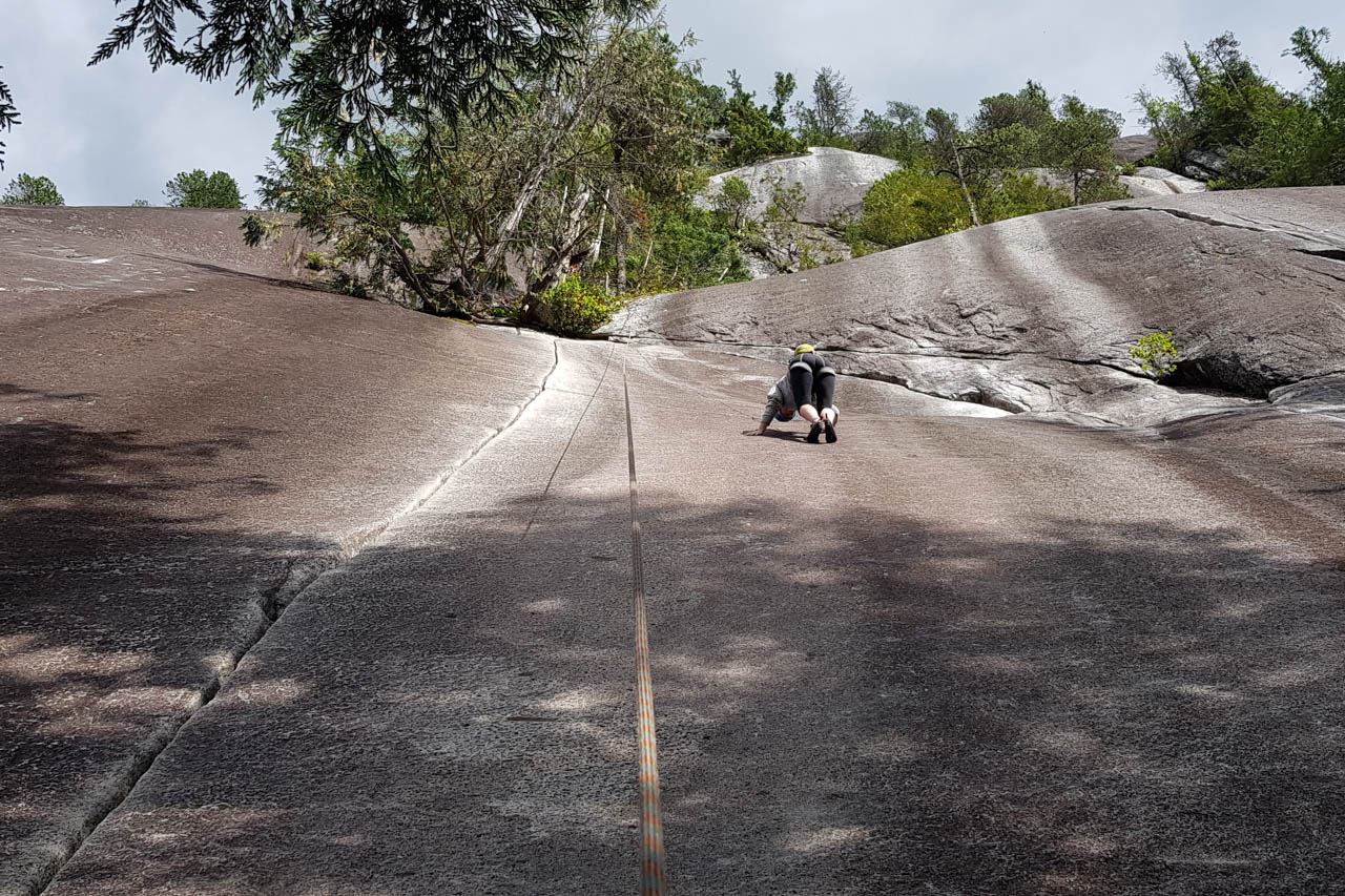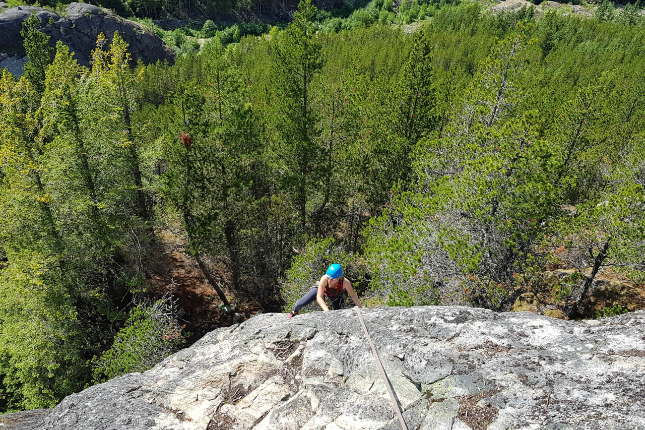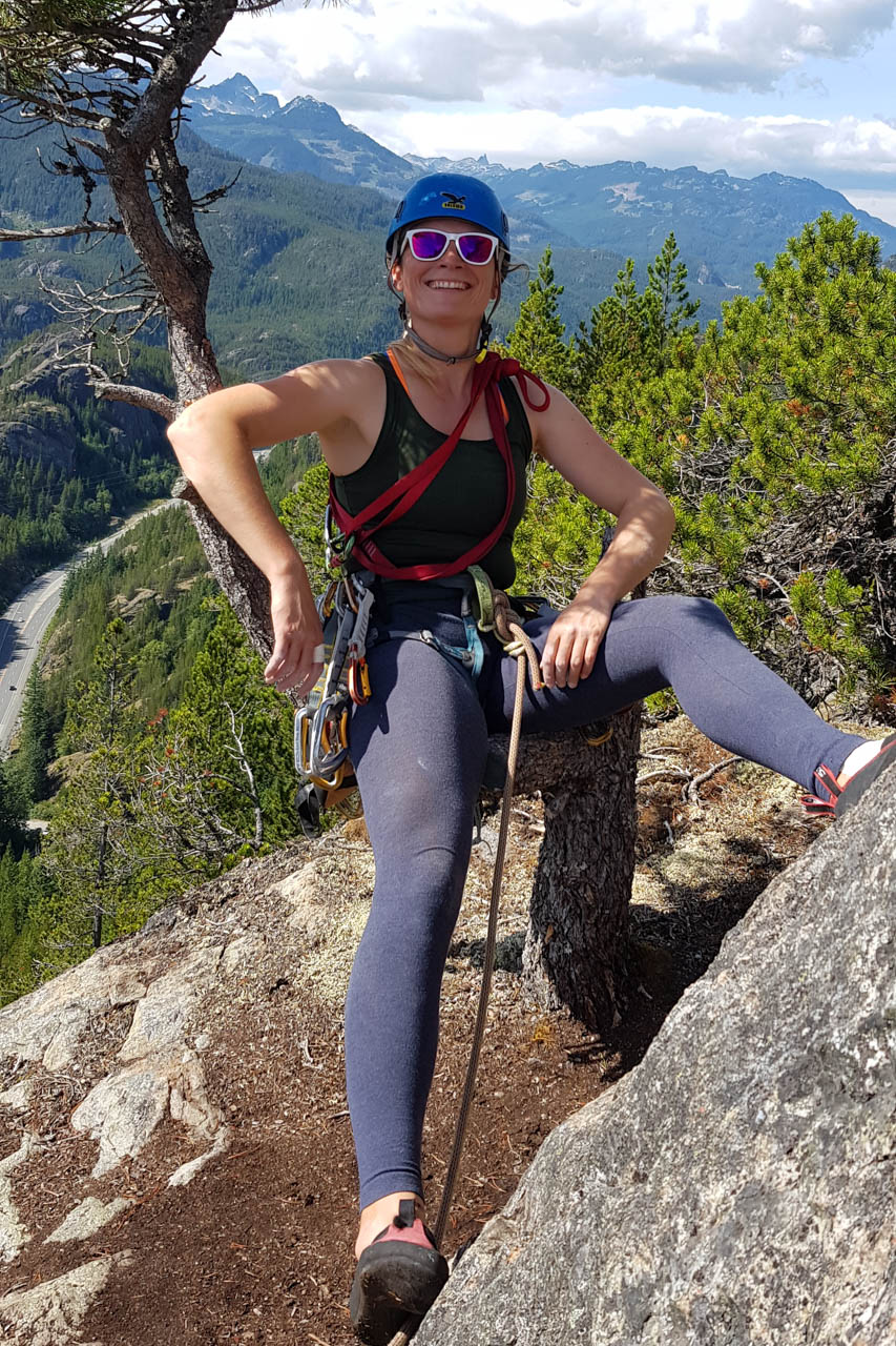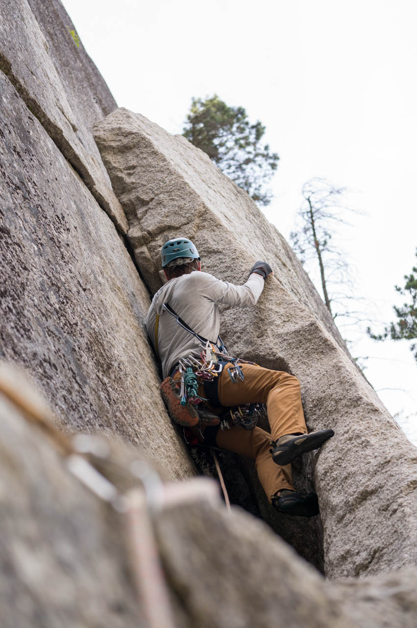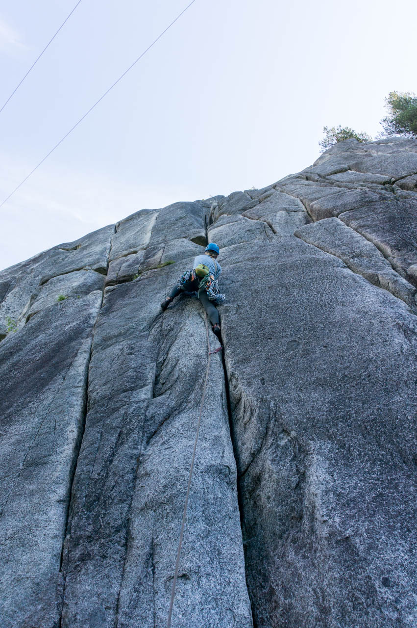 Eine wichtige Motivation für unseren Besuch in Squamish war unser Trad-Kletter-Können weiter auszubauen, und dafür sind hier die Voraussetzungen ziemlich gut. Verglichen mit anderen Gebieten gibt es hier nämlich, wie man es vom Sportklettern her kennt, Felsen an denen eine Trad-Tour neben der anderen ist. Das ist vor allem deshalb besonders, weil diese Touren ja üblicherweise Felsstrukturen folgen, welche auch eine Absicherung erlauben, wie zum Beispiel Rissen. Das einzige andere Gebiet welches uns einfällt, in dem so viele qualitativ hochwertige Touren auf engem Raum, oder gar nebeneinander, zu finden sind, ist Indian Creek, aber da wäre es im Sommer viel zu heiß. Außerdem findet man hier bei fast allen Einseillängen-Touren auch einen Umlenker mit zwei Haken, den man sogar häufig zu Fuß erreichen kann um sich ein Toprope einzuhängen – zum Lernen ists hier also wirklich ideal.
