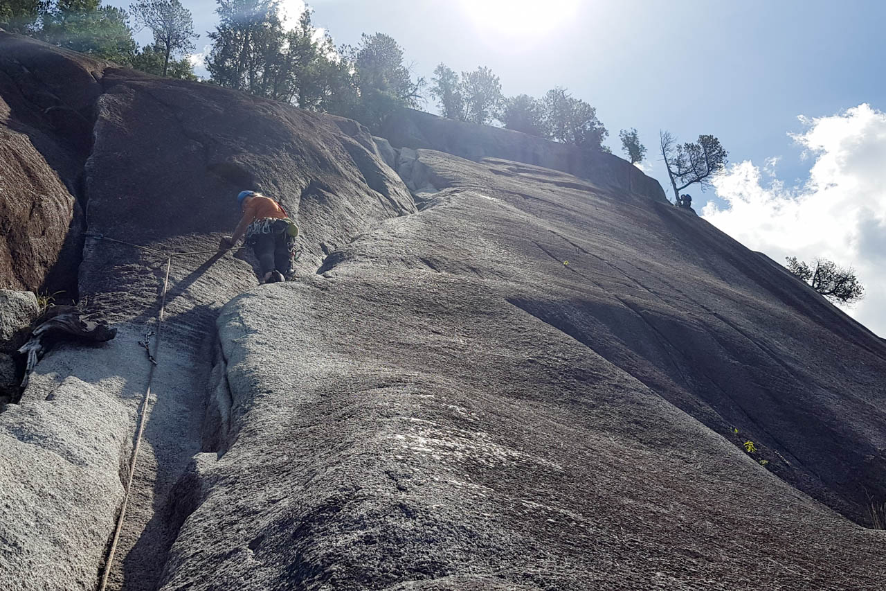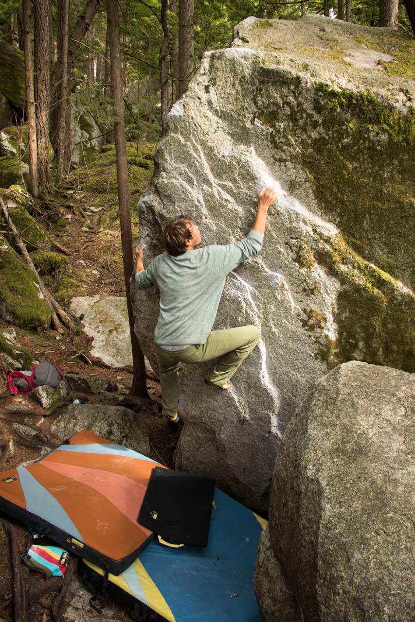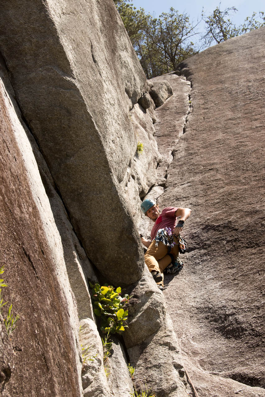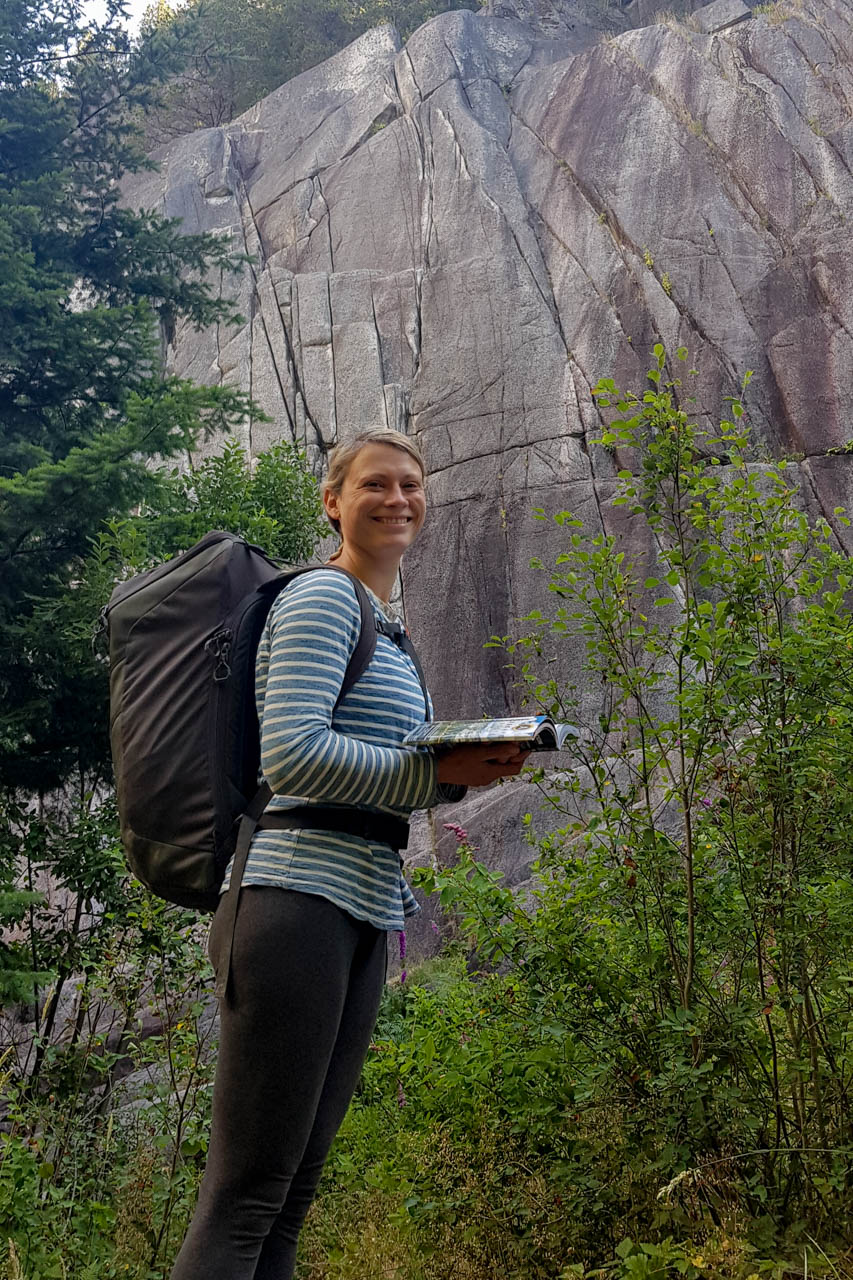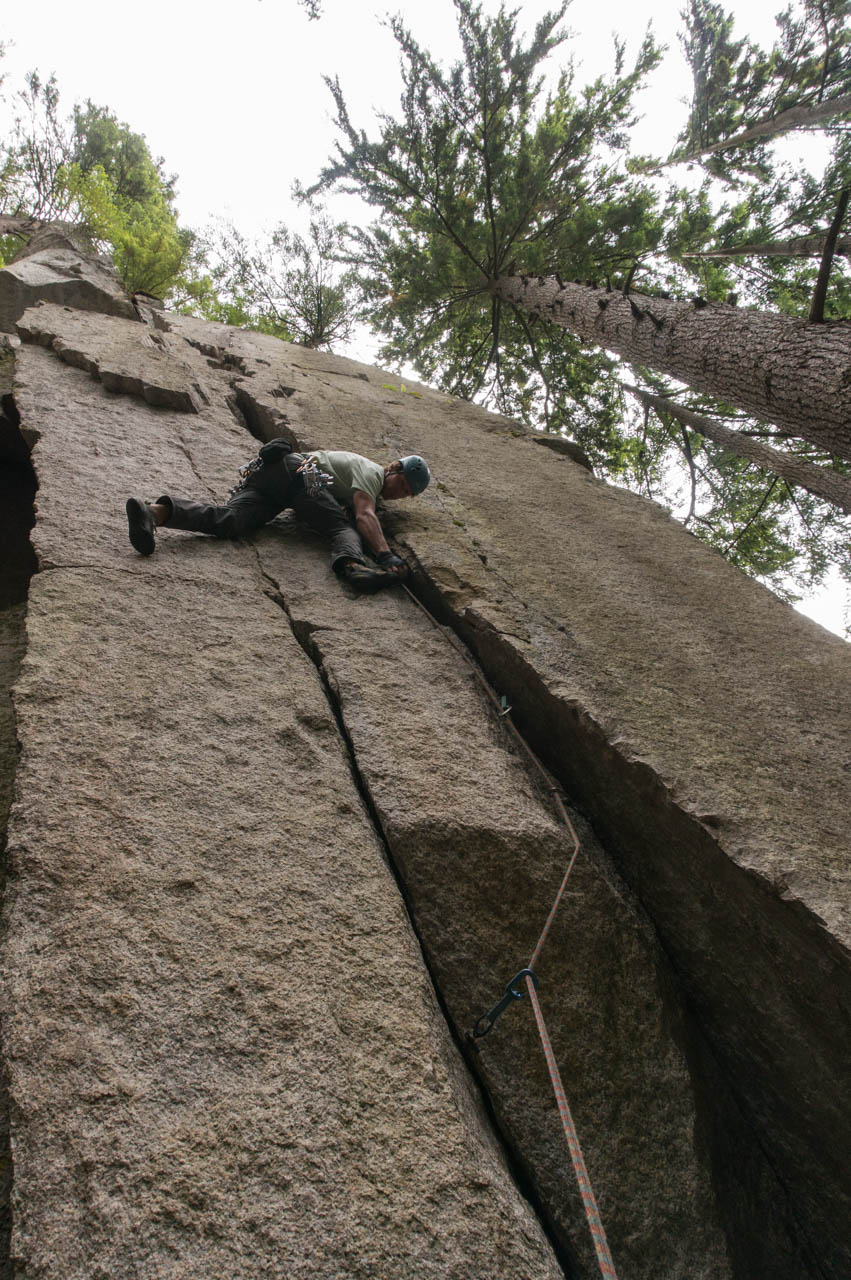 Eine wichtige Motivation für unseren Besuch in Squamish war unser Trad-Kletter-Können weiter auszubauen, und dafür sind hier die Voraussetzungen ziemlich gut. Verglichen mit anderen Gebieten gibt es hier nämlich, wie man es vom Sportklettern her kennt, Felsen an denen eine Trad-Tour neben der anderen ist. Das ist vor allem deshalb besonders, weil diese Touren ja üblicherweise Felsstrukturen folgen, welche auch eine Absicherung erlauben, wie zum Beispiel Rissen. Das einzige andere Gebiet welches uns einfällt, in dem so viele qualitativ hochwertige Touren auf engem Raum, oder gar nebeneinander, zu finden sind, ist Indian Creek, aber da wäre es im Sommer viel zu heiß. Außerdem findet man hier bei fast allen Einseillängen-Touren auch einen Umlenker mit zwei Haken, den man sogar häufig zu Fuß erreichen kann um sich ein Toprope einzuhängen – zum Lernen ists hier also wirklich ideal.