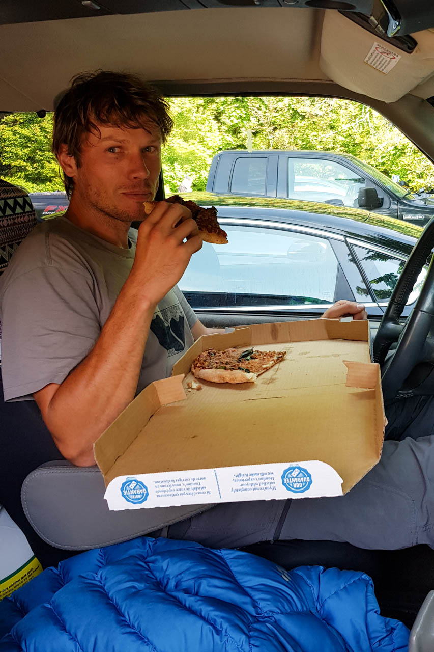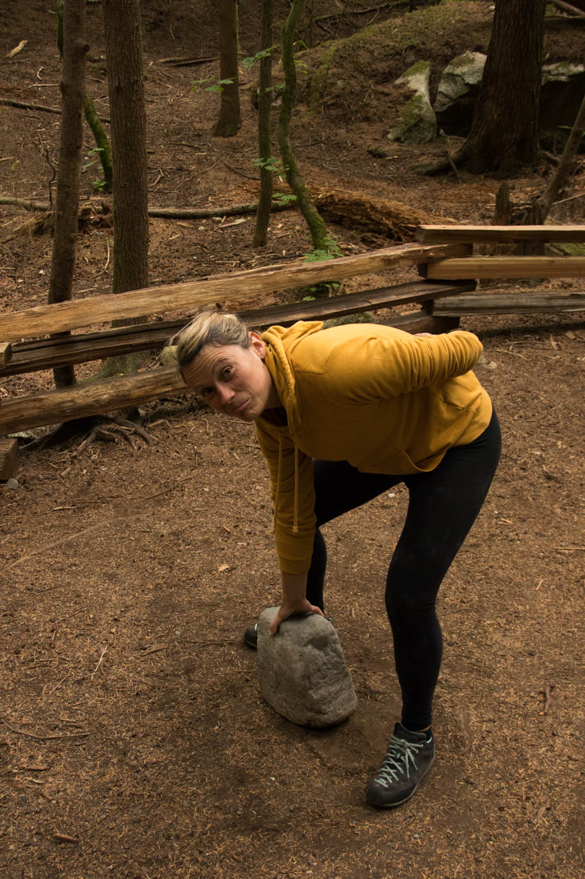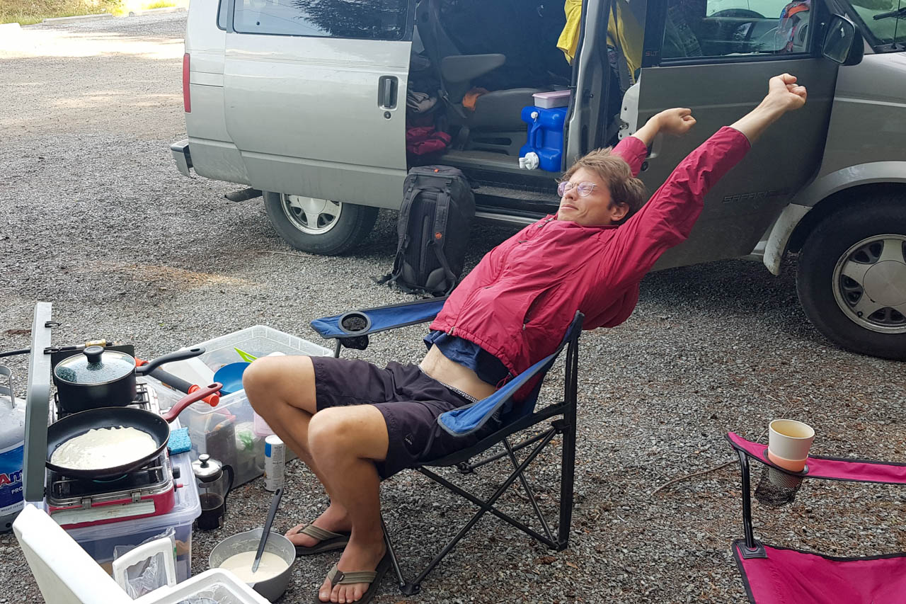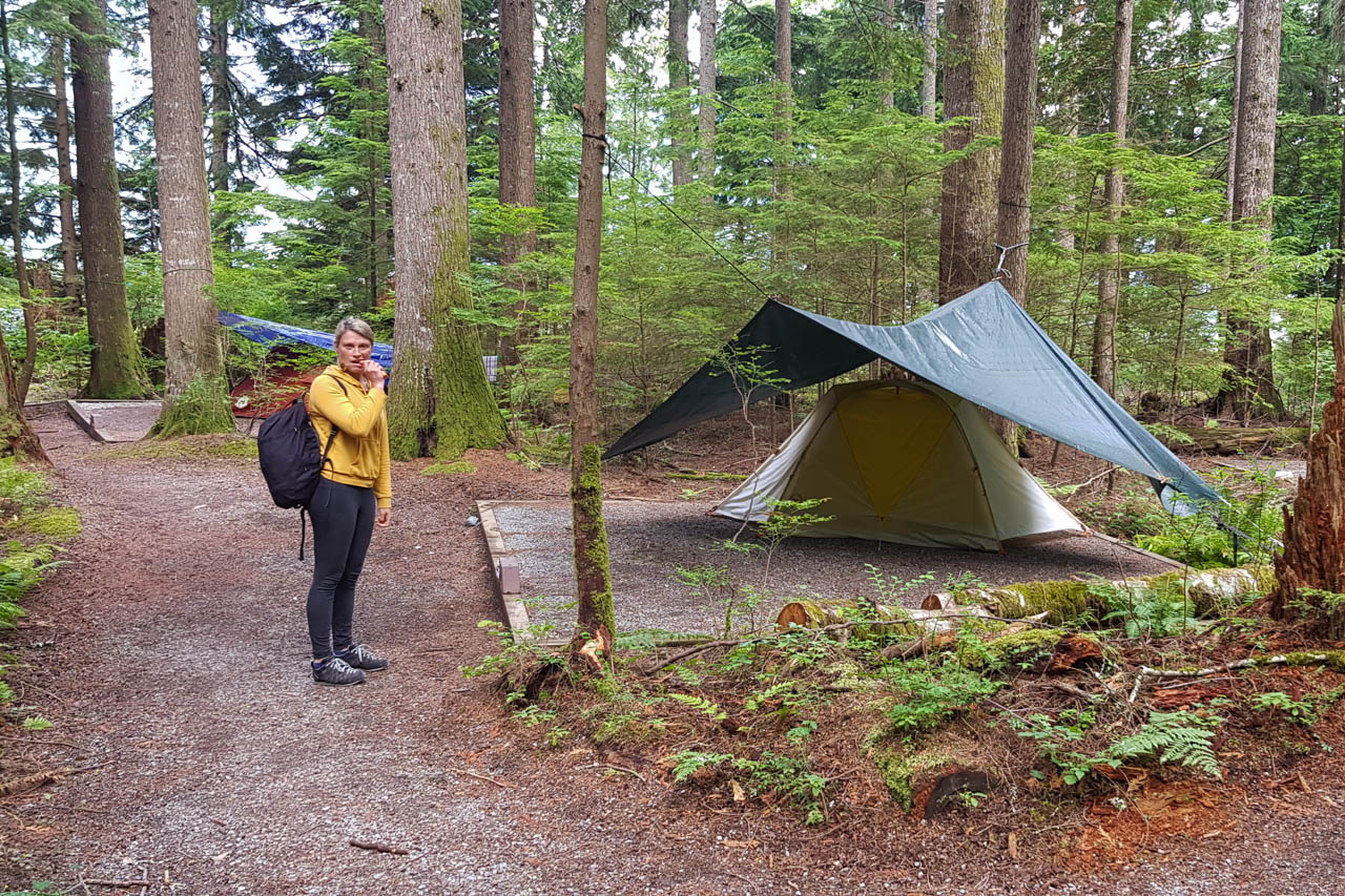 Anschließend sind wir auf den Campingplatz im Schatten des Stawamus-Chief, des zweitgrößten Granitmonolithen der Welt, gezogen und haben uns dort heimisch eingerichtet. Leider gab es keine Bänke mit Tisch, wie wir es von den Campingplätzen in den USA gewohnt sind und mussten wegen den hier umherstreifenden Schwarzbären auch immer wieder alles ins Auto verräumen. Dafür haben uns die Chipmunks und ab und dann eine Maus unseren Küchenboden immer sauber gehalten und wir konnten uns hinter unserem Platz im Wald eine Dusche einrichten – an vielen Tagen hier war es nämlich ziemlich ziemlich heiß. Auch der Schwarzbär hat tatsächlich abends mal vorbeigeschaut und ist über die kleine Wiese neben unserem Zelt marschiert, bis er von unseren Nachbarn mit Pfeifen, Pfannenschlagen und Feuerwerkskörpern vertrieben wurde.