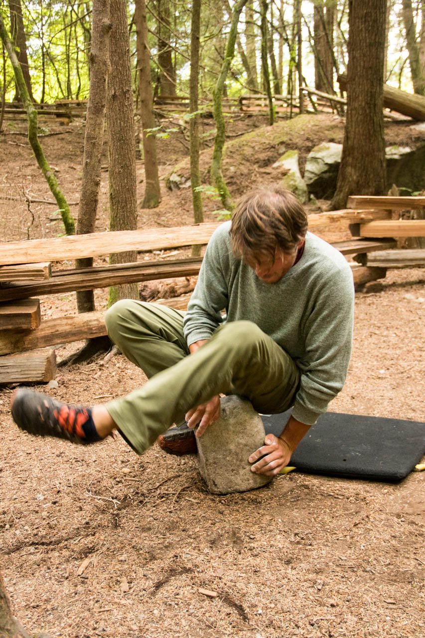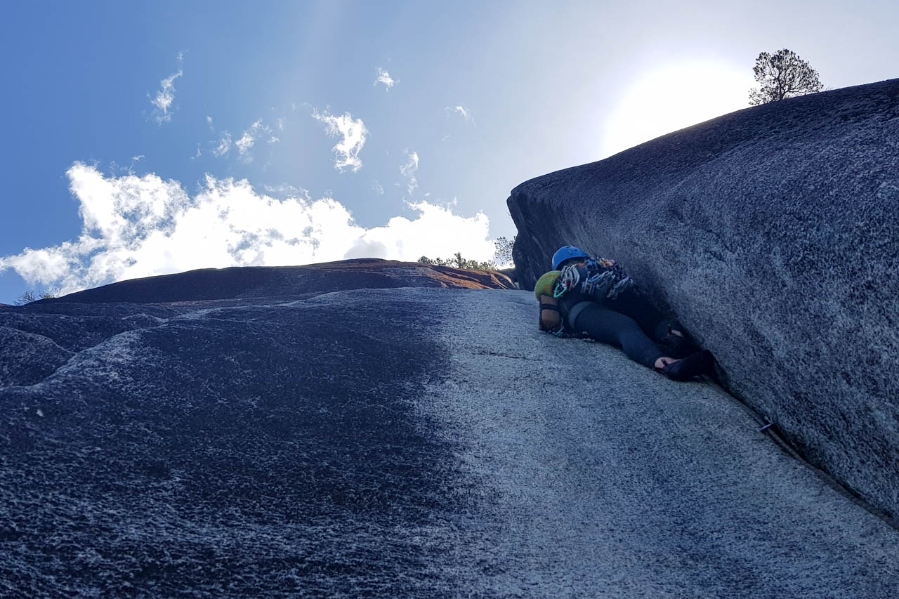 Am Ende hatten wir dann aber trotzdem über 30 Tage an den Felsen verbracht und den Großteil unserer Liste abgearbeitet. So haben wir in Einseillängen in den Smoke Bluffs mehr und mehr Routine in den leichteren Graden erhalten und unser Squeamish-Niveau ein klitzekleines bisschen nach oben versetzt und uns mutig in die nächst schwierigeren Touren gewagt. Ebenso konnten wir uns austoben, was die Erschließung neuer Risskletterfähigkeiten angeht: Von Fingerlocks und sogenannte „Thin Hands“-Rissgrößen über „Wide Hands“ und faustgroßen Rissen bis hin zu den „offwidth“-Größen (Ellbogenklemmer, Knieklemmer, „Chicken Wings“) und dem nach wie vor sehr beliebten Kamin. Um die dementsprechend besten Hand- und Fußtechniken für die jeweilige Rissgröße zu erkennen, haben wir uns ein von anderen Kletterern empfohlenes Rissklettertechnik-Buch gekauft, welches eifrig studiert wurde. Zusätzlich haben wir unseren Totem-Bestand ein wenig aufgestockt, damit wir uns wirklich immer, wenn wir wollen, insbesondere in den wirklich engen Rissen, eine verlässliche Sicherung legen können. Ebenso haben wir unseren Klemmkeilbesitz ausgebaut, indem wir fleißig von anderen Kletterern in der Route zurückgelassene Keile aufgesammelt haben. Wir sind anscheinend soviel geklettert, dass der Piet in seinen Risskletterschuhen Löcher entdeckt hat, weswegen wir uns natürlich beide mit neuen La Sportiva TC Pros (das steht bestimmt für Trad Climbing Profi!) ausstatten mussten.