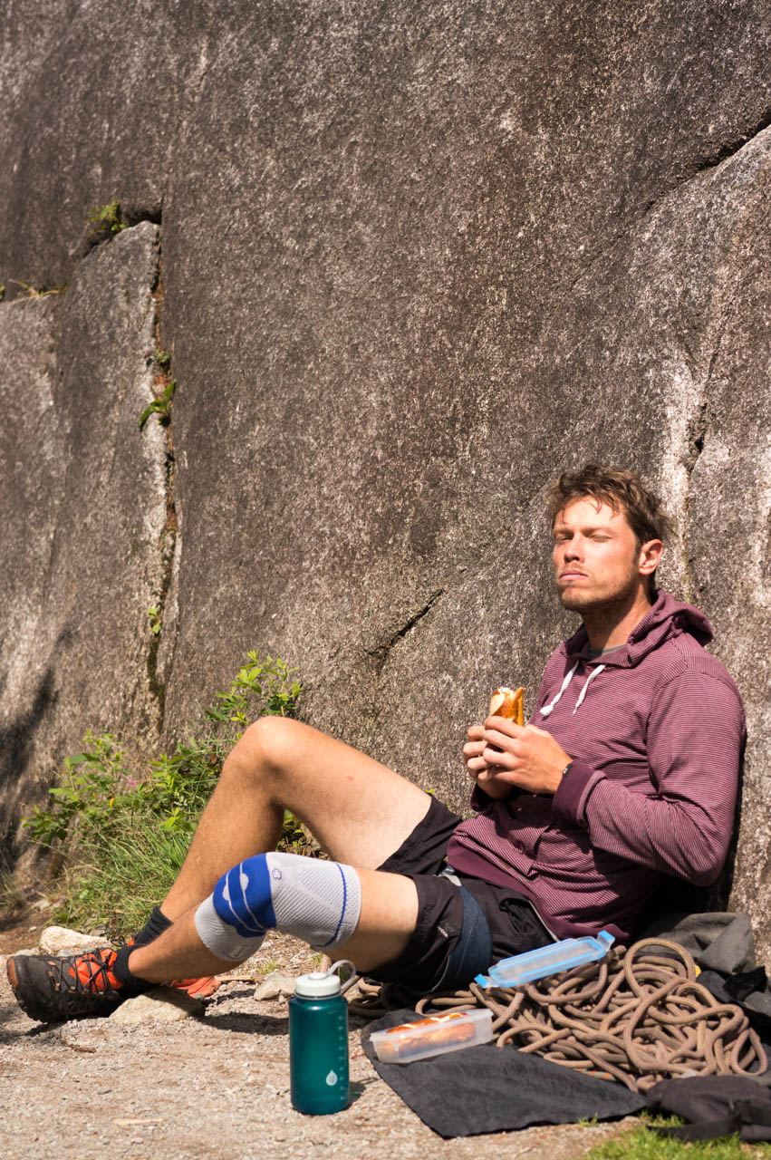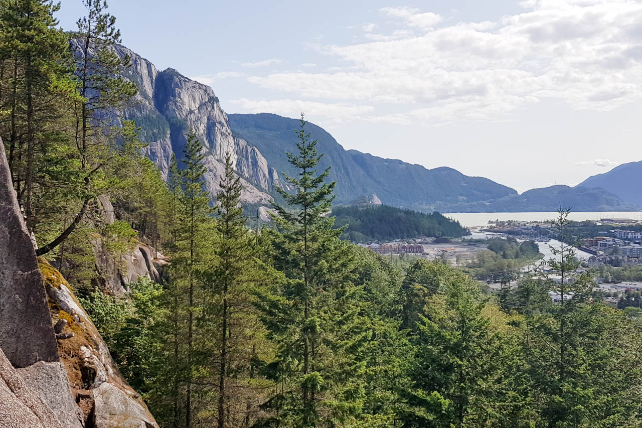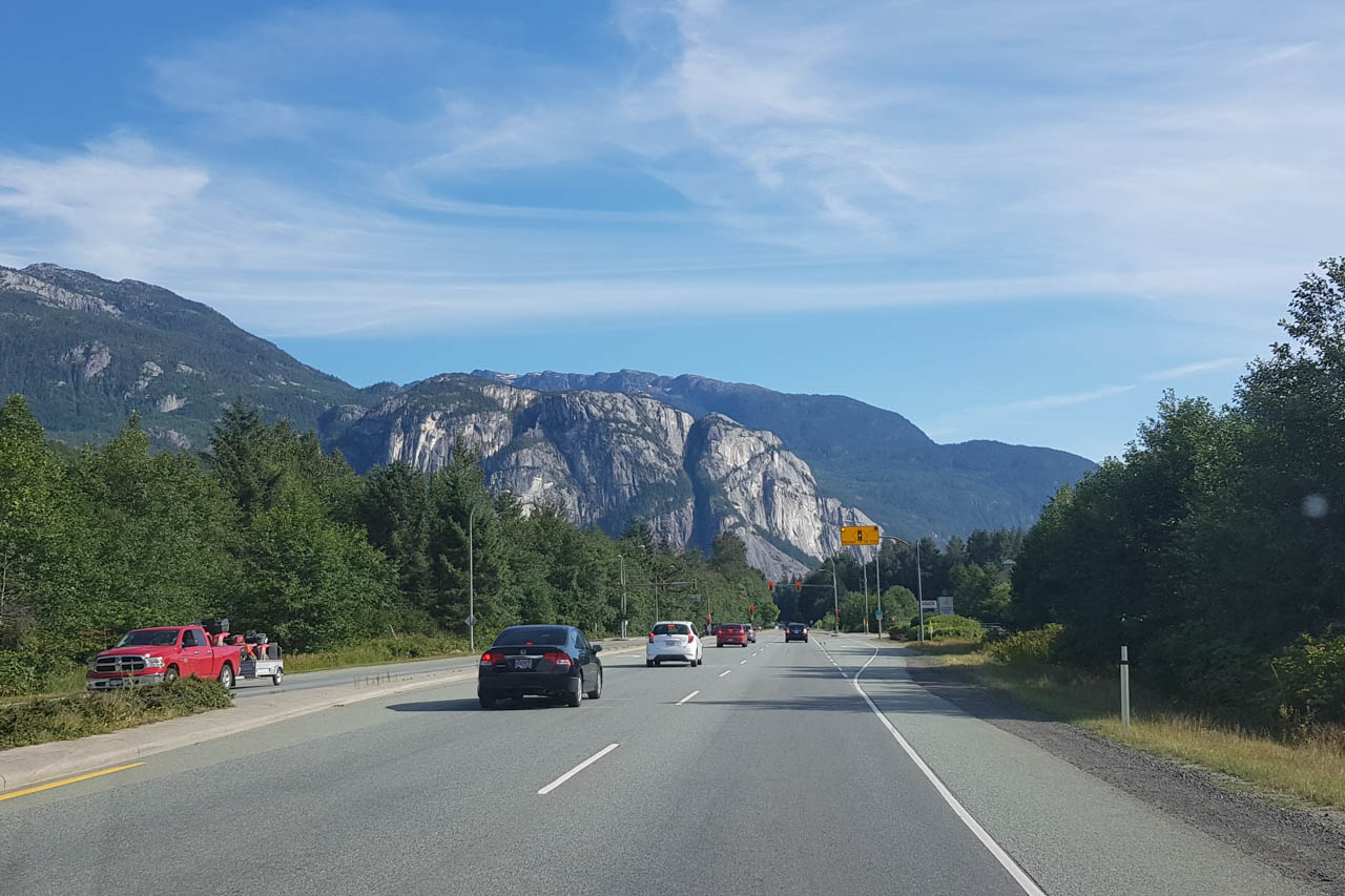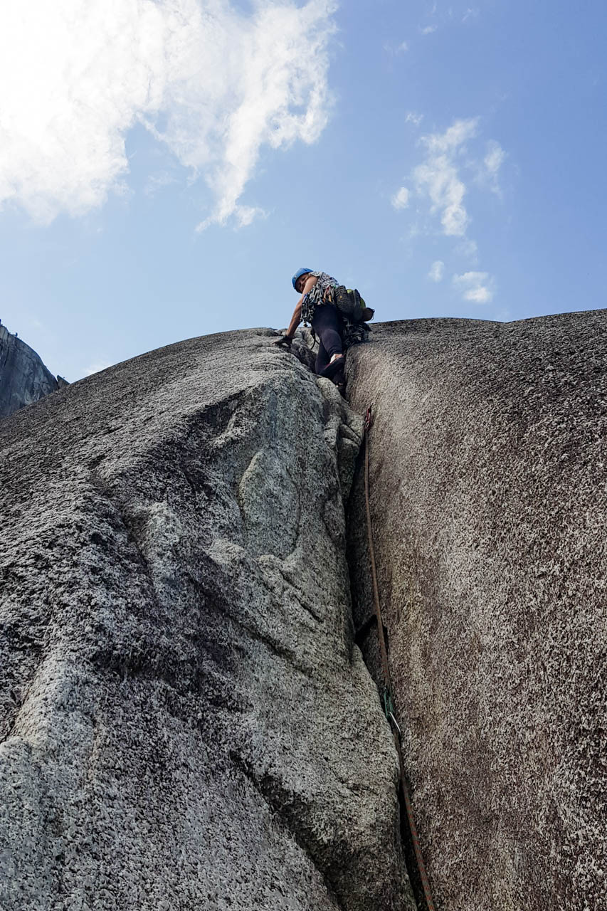 Die Stadt Squamish betitelt sich selbst als ‚Outdoor Recreaton Capital of Canada’ und wird als solche leider auch sehr stark besucht. Regelmäßig am Wochenende spült es Unmengen von Leuten aus dem Süden, aus Vancouver, hoch in Richtung Squamish, die hier Kitesurfen, Windsurfen, Mountainbiken, Gleitschirmfliegen, Wandern oder Klettern wollen. Und selbst beim Klettern hat man dann noch die Auswahl zwischen Bouldern, Sportklettern oder Trad-Klettern, wobei wir uns für letzteres entschieden haben. Und selbst hier konnten wir uns noch entscheiden, ob wir nur Einseillängen-Touren klettern oder aber hoch hinaus wollten.