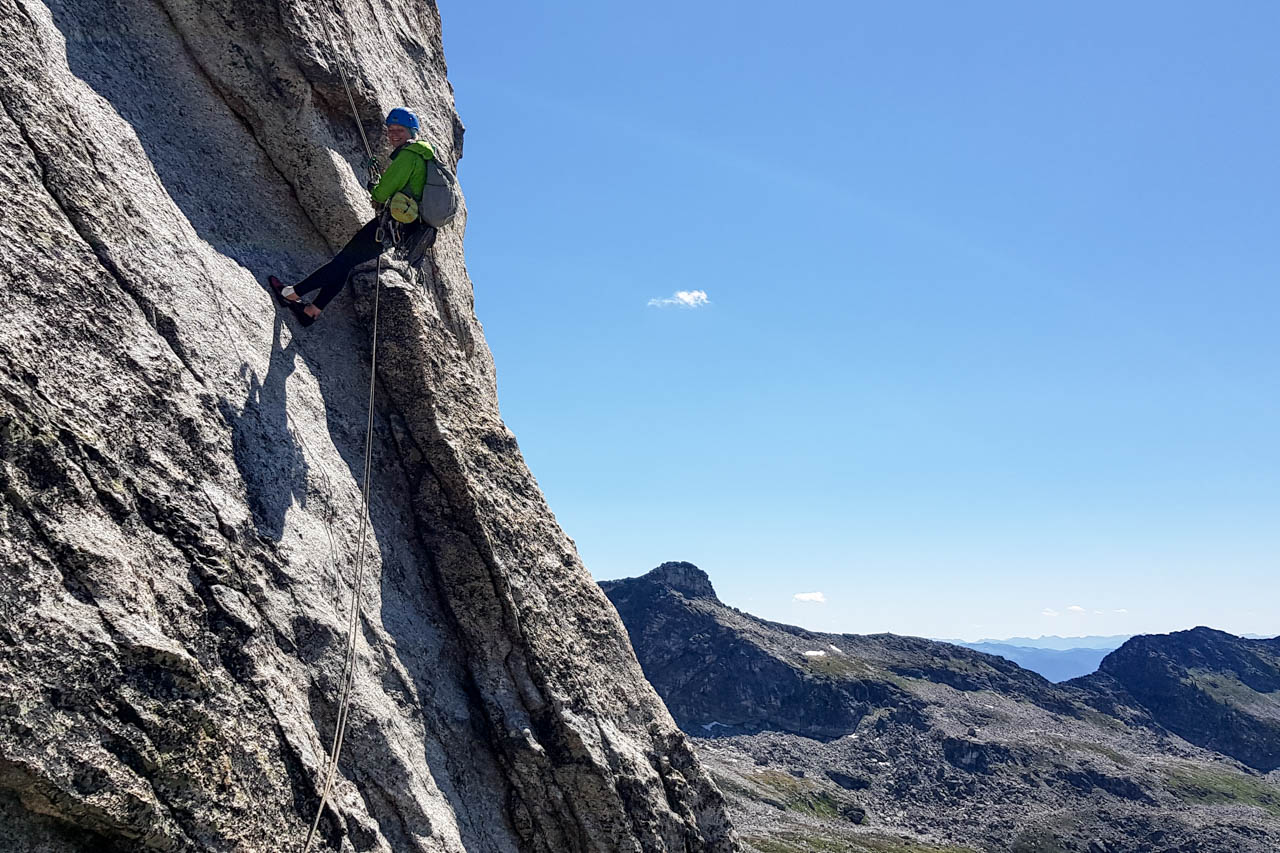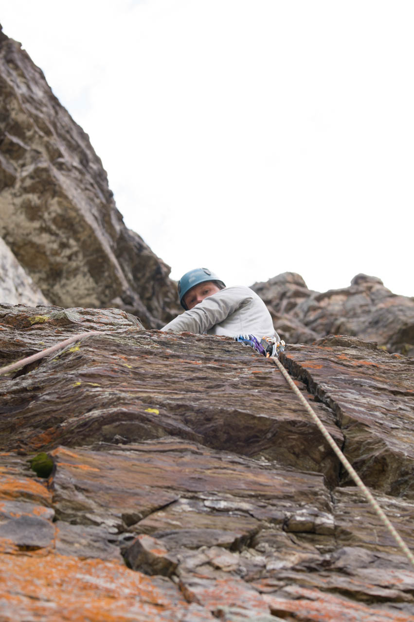 Vom Aufstieg mit dem schweren Kletterequipment bereits etwas erschöpft sind wir dann in die Tour eingestiegen. Gleich die erste Seillänge soll wohl die Schwerste sein – und tatsächlich mussten wir dort auch gleich richtig schuften. Aber wir haben sie geschafft, um dann an einem ziemlich exponierten selbstgebauten Stand zu hängen und tief durchzuatmen. Nach einer weiteren Seillänge haben wir uns dann angeschaut und festgestellt, dass wir nicht wirklich fit sind und sich alles viel anstrengender anfühlt als es sollte – ob es die Höhenluft ist, das frühe Aufstehen, der schlechte Schlaf, die verstopften Nebenhöhlen oder wir einfach doch nicht so fit sind wie gedacht konnten wir nicht genau feststellen. Wir haben uns dann erfolgreich von einem riesigen Chockstone (=verklemmter Block) abgeseilt, die wirklich wunderschöne Landschaft bei einem zweiten Frühstück genossen und sind wieder abgestiegen. Nach der langen Rückfahrt über die Holperpiste sind wir am nächstgelegenen Campingplatz ins Schlafkoma versunken.