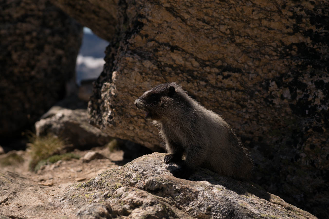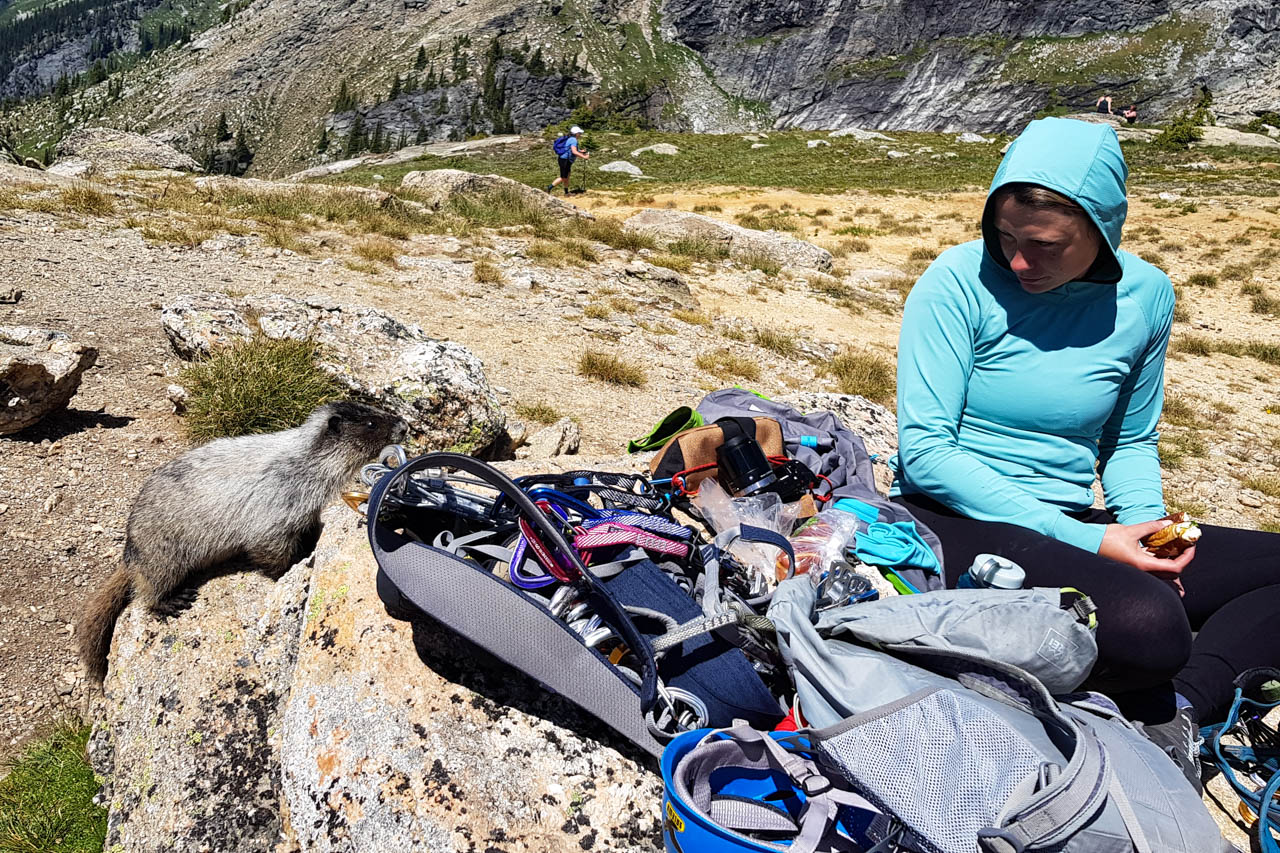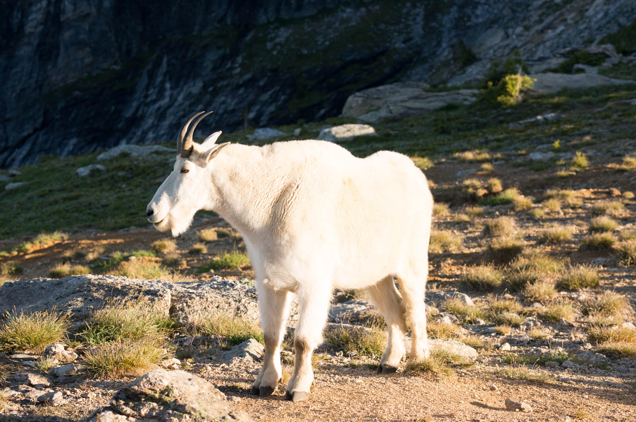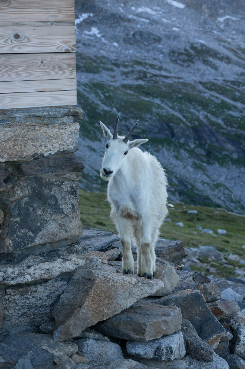 Pünktlich um 4.00 Uhr morgens klingelte dann der Wecker und es ging los. Dauerhaft begleitet von einem Mückenschwarm sind wir 2 Stunden lang den Berg hochgestapft, um über der Baumgrenze tatsächlich die Tiere zu finden, die wir unbedingt sehen wollten: Mountain Goats. Diese haben sich dauerhaft um den Mount Gimli herum angesiedelt, verlieren gerade ihr Winterfell, haben sogar Nachwuchs präsentiert und sind schauerlich gierig nach den Salzen im menschlichen Urin – weswegen es dort in luftiger Höhe ein Plumpsklo und sogar ein freistehendes Urinal gibt, damit die Mountain Goats nur für sie natürliche Salzquellen anzapfen. Zusätzlich gab es auch ziemlich runde und neugierige Murmeltiere, die auch gerne am Kletterzeug und den Rucksäcken genagt haben – wahrscheinlich auch, um das Salz aus unserem Schweiß zurück zu gewinnen.