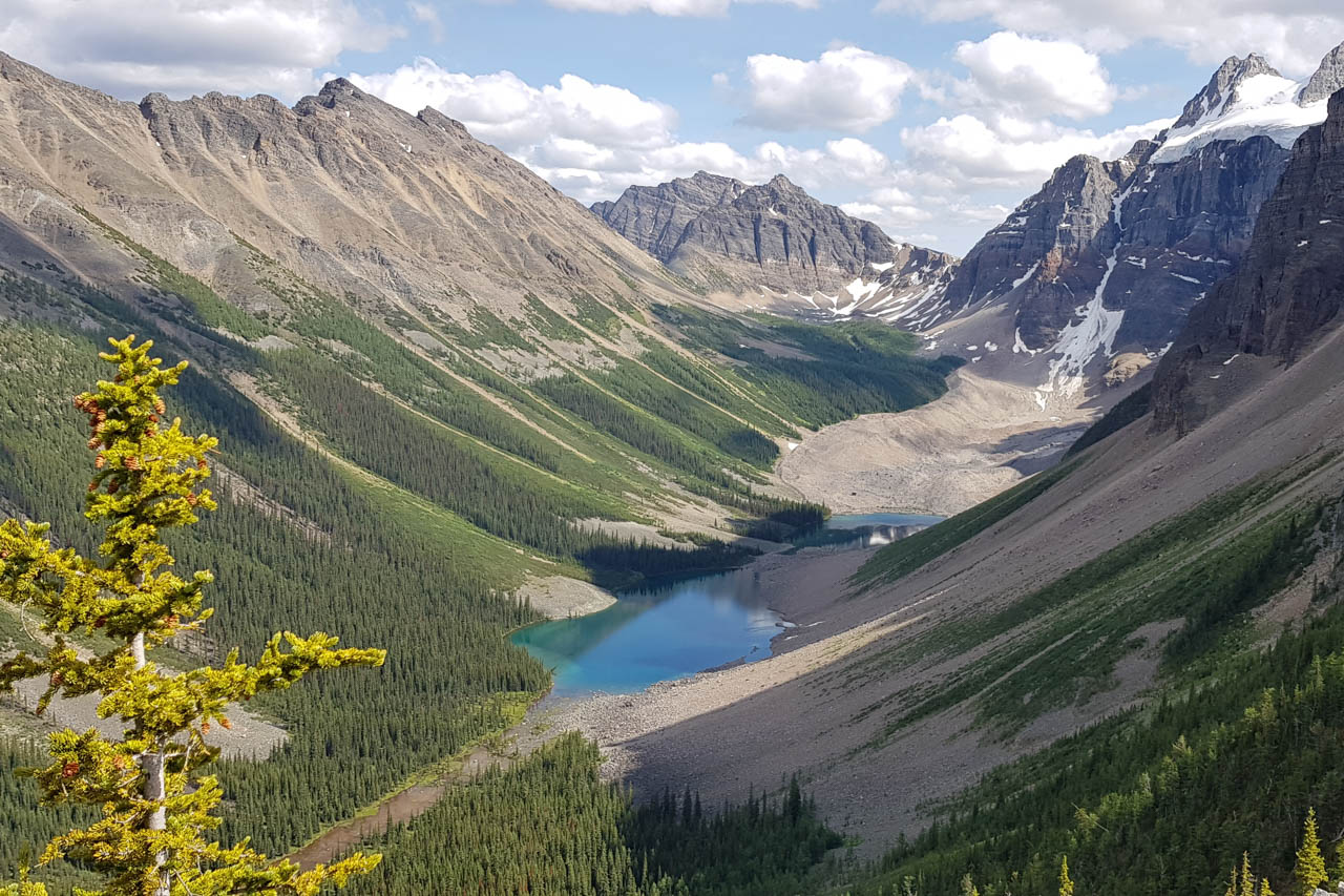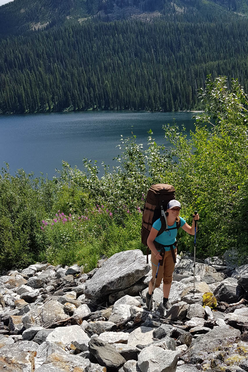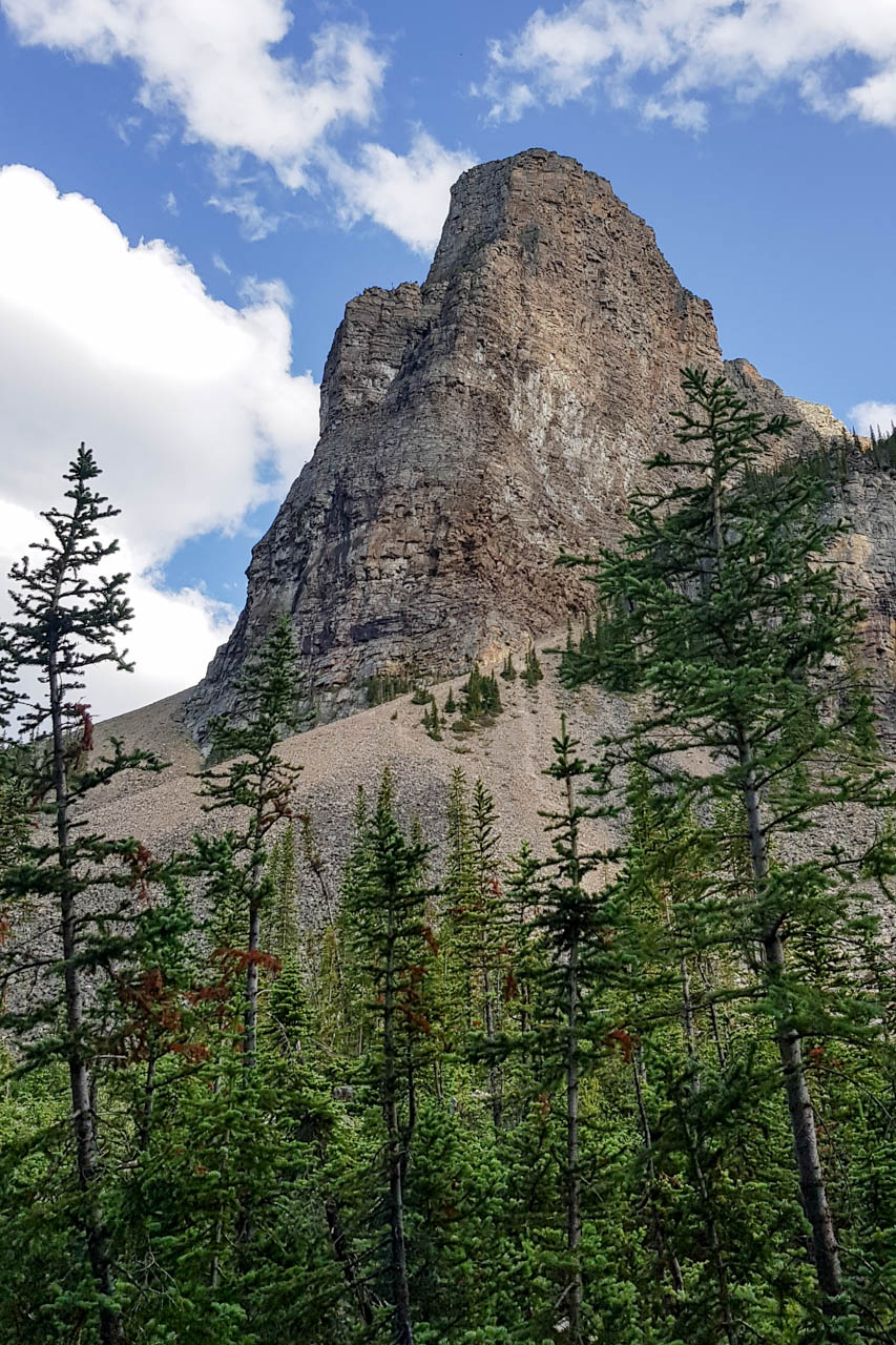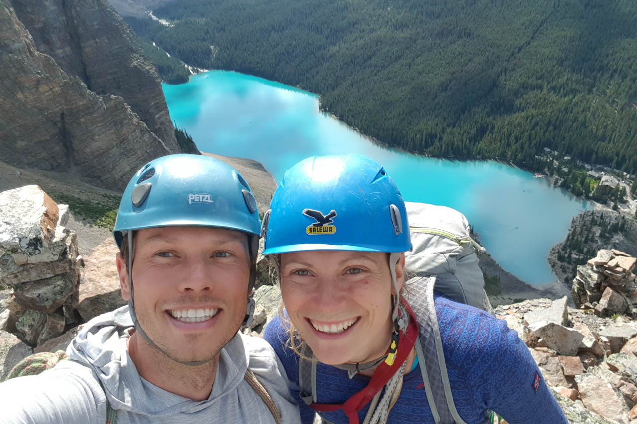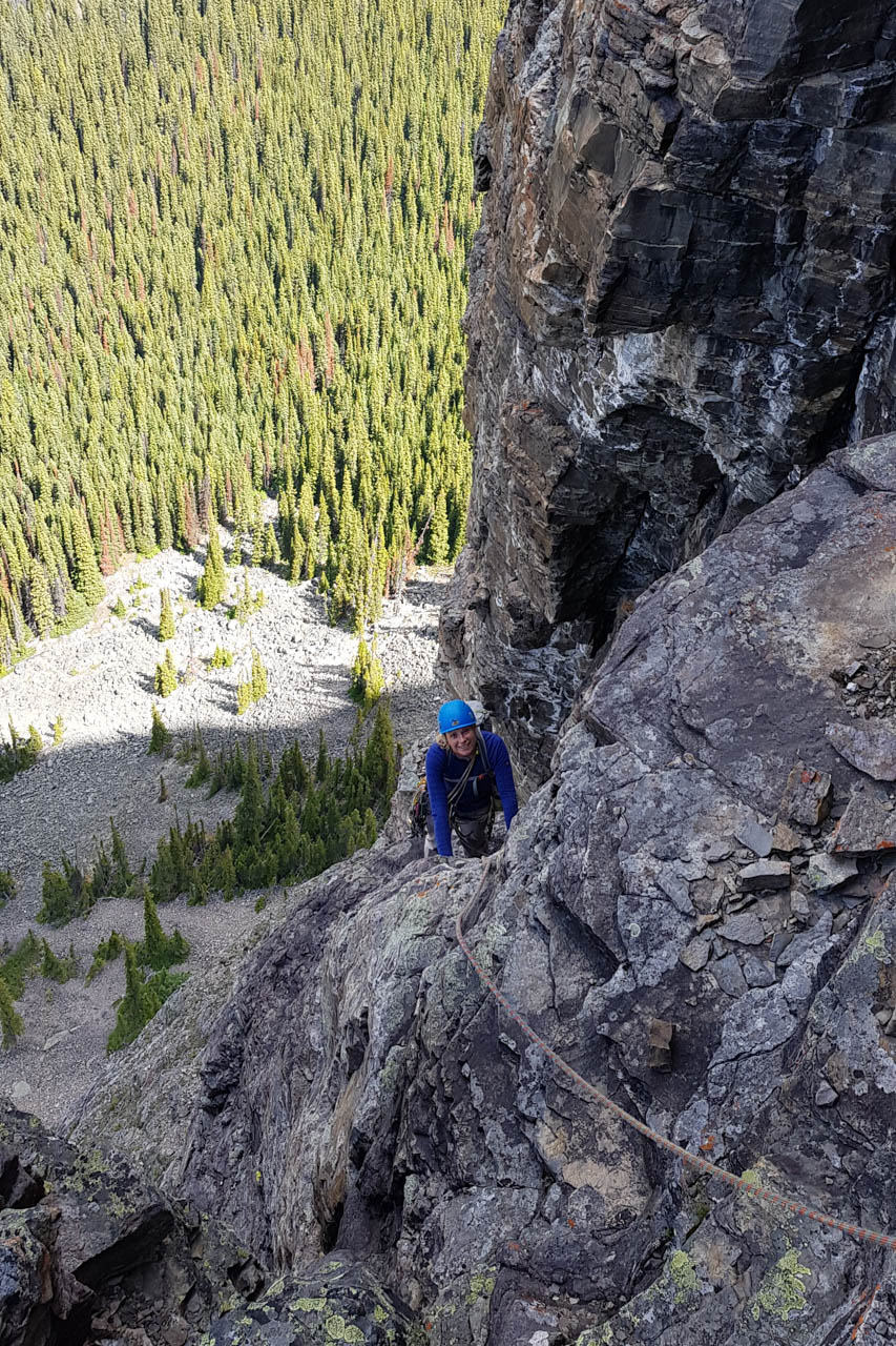 Am ersten Tag vor Ort haben wir uns im Ranger-Office die Genehmigung geholt, auf dem kleinen Campingplatz auf halber Strecke schlafen zu dürfen und die Bärenbox erhalten (wir sind erneut im Grizzlybärenland) und uns nach dem aktuellen Wetter erkundigt. Anscheinend gibt es diese Saison viele Gewitter, teilweise wohl auch früh, aber die Aussichten waren dennoch gut genug für unser Vorhaben. Also haben wir uns auch ein Kanu organisiert und sind am nächsten Tag losgepaddelt. Das Paddeln hat richtig Spaß gemacht und führte uns über zwei sehr schöne Seen. Den steilen Aufstieg mit den zwei schweren Rücksäcken durchs Blockfeld in der Sonne auf knapp 2900 Meter können wir allerdings nur als Qual beschreiben. Wir waren so froh, als wir den idyllischen Backcountry-Campground erreicht hatten. Dort haben wir uns von anderen Kletterern, die an diesem Tag die Tour geklettert sind, zusätzliche Informationen geholt und uns den ersten unübersichtlichen Teil des Aufstiegs am nächsten Morgen, der im Dunkeln stattfinden sollte, angeschaut. Erledigt sind wir ins Bett gefallen, haben allerdings aufgrund von Kopfschmerzen, wahrscheinlich wegen der Höhe, nicht so gut geschlafen wie erhofft. Und dann hatten wir die nächste Entscheidung zu treffen: Als um 03.00 Uhr morgens der Wecker klingelte, war das Erste, was wir sahen, ein Blitz, der das Zelt erhellt hat… Der Wind hat ordentlich zugenommen und während der nächsten halben Stunde hat es immer wieder leicht geregnet. Am dunklen Himmel waren keine Sterne zu sehen – also sind wir zurück ins Zelt gekrabbelt und haben versucht weiter zu schlafen. Uns fiel die Entscheidung richtig schwer – aber wir konnten in der Dunkelheit nicht abschätzen, wie nah das Gewitter ist, wohin es sich bewegt, wie die Wolken aussehen usw. – und desto später man in die Klettertour zum Gipfel einsteigt, desto wahrscheinlicher ist, dass man in die hier häufigen Nachmittagsgewitter kommt – und das wollten wir auf knapp 4000 Metern definitiv vermeiden. Aber es gab zwei weitere Seilschaften, die sich nichts desto trotz auf den Weg gemacht haben und die Tour auch geklettert sind… *grummel* So unterschiedlich sind die Entscheidungen beim alpinen Klettern.