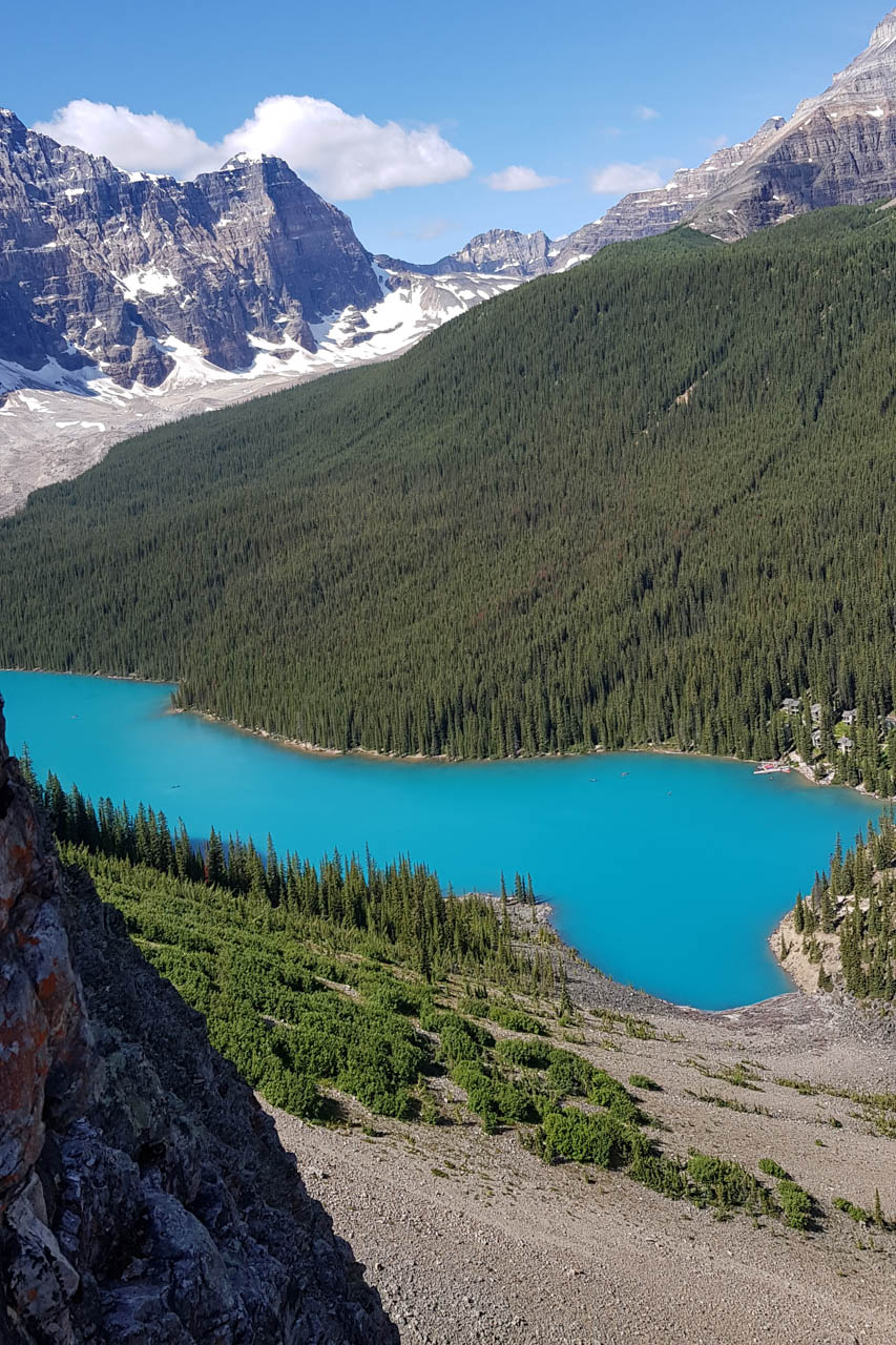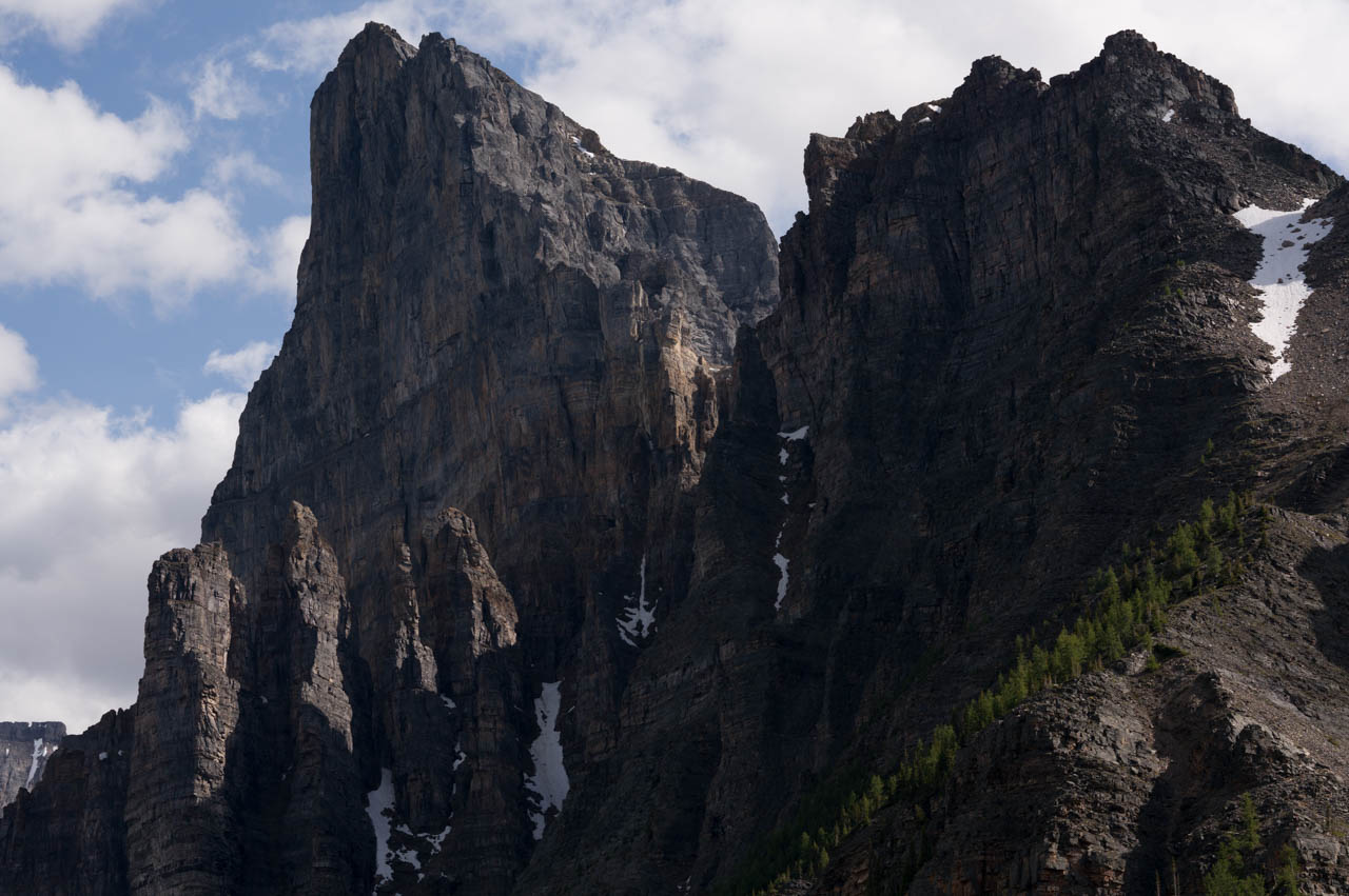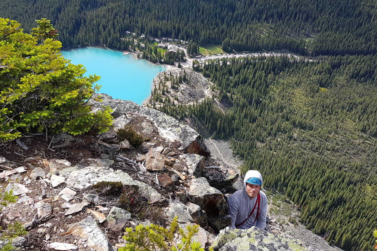 Das hat uns natürlich viel Zuversicht für den nur wenige Kilometer entfernt liegenden nächsten Campingplatz gegeben. Aber dort haben wir ein schönes Plätzchen gefunden und wurden auch von den Bären in Ruhe gelassen. Anschließend sind wir am Lake Louise wandern gegangen und schließlich zeitig ins Bett, damit wir am nächsten Morgen rechtzeitig am Parkplatz zu unserem nächsten Ziel sein konnten – dem Tower of Babel. Dieser Turm zu Babel liegt nämlich am Moraine Lake, einem magisch türkisblauen See, welchen so viele Touristen sehen wollen, dass der Parkplatz ab ca. 6:00 Uhr früh bereits voll ist und daraufhin die Zufahrt gesperrt wird. Pünktlich um 5:40 Uhr wollten wir auf diesen Parkplatz abbiegen, um festzustellen, dass er bereits gesperrt ist – toll! Die einzige andere Möglichkeit, zum Startpunkt zu kommen, ist zum Shuttle Parkplatz zu fahren und mit dem Shuttle zu fahren. Uns blieb nichts Anderes übrig – dort haben wir dann auch den Grund erfahren, warum der Parkplatz schon gesperrt war: Wir haben den Übergang von der Pacific Standard Time zur Mountain Time verschlafen – und damit waren wir schon eine Stunde weiter als gedacht. Das hat uns zeitlich etwas in Bedrängnis gebracht, da der letzte Shuttle Bus bereits um 16:30 zurück fährt und wir für die Klettertour einige Stunden einplanen mussten. Letztlich haben wir’s dann trotzdem versucht.