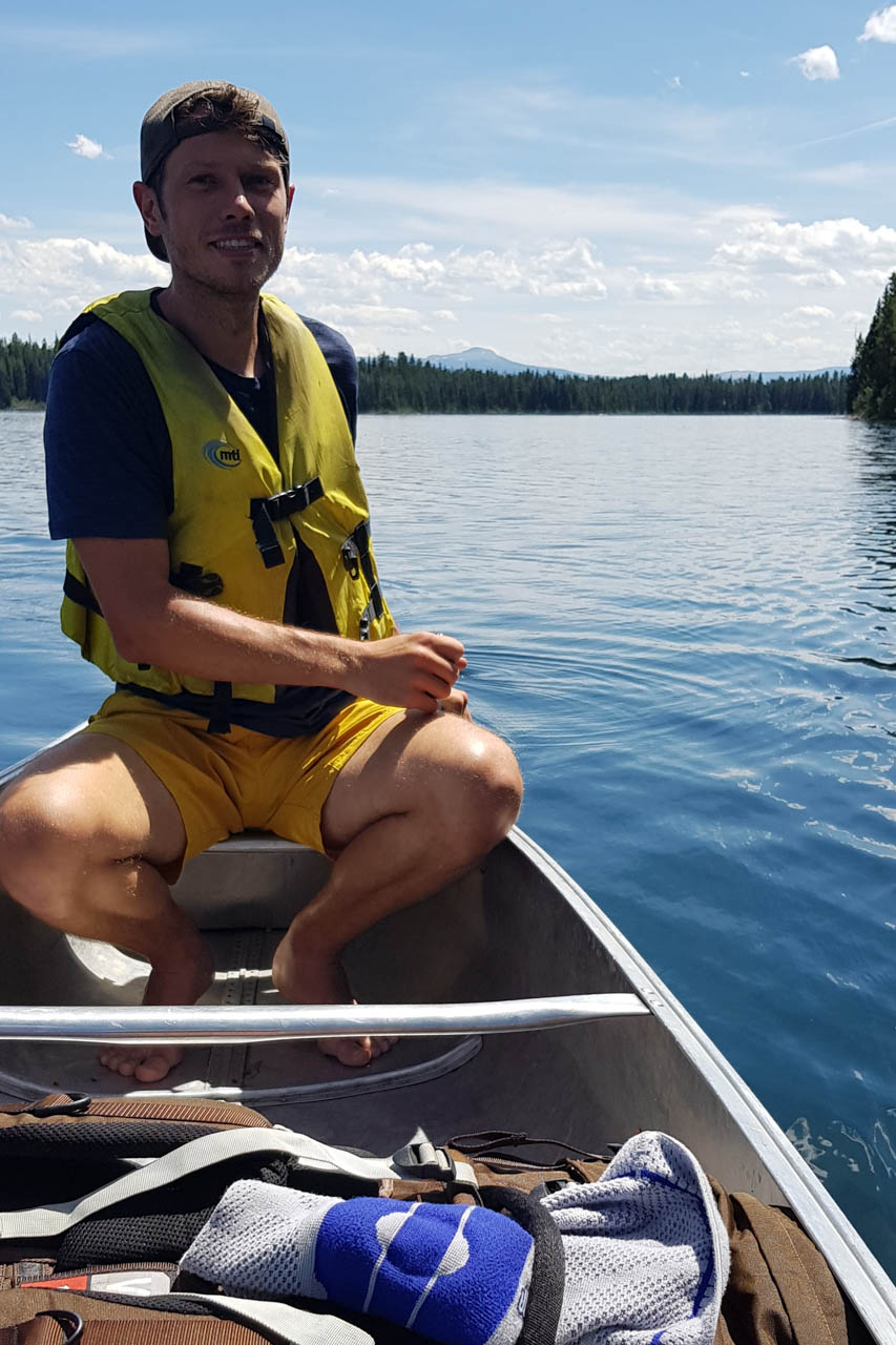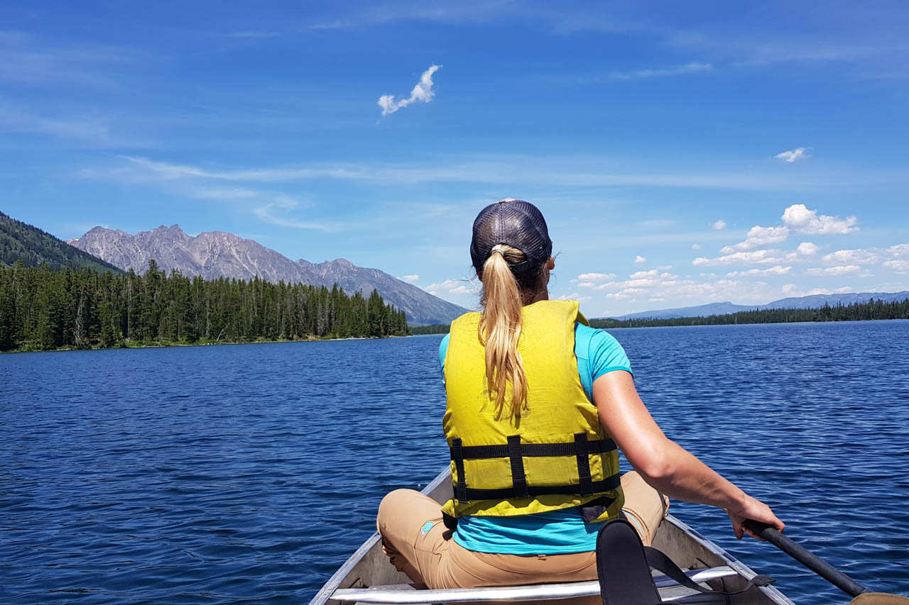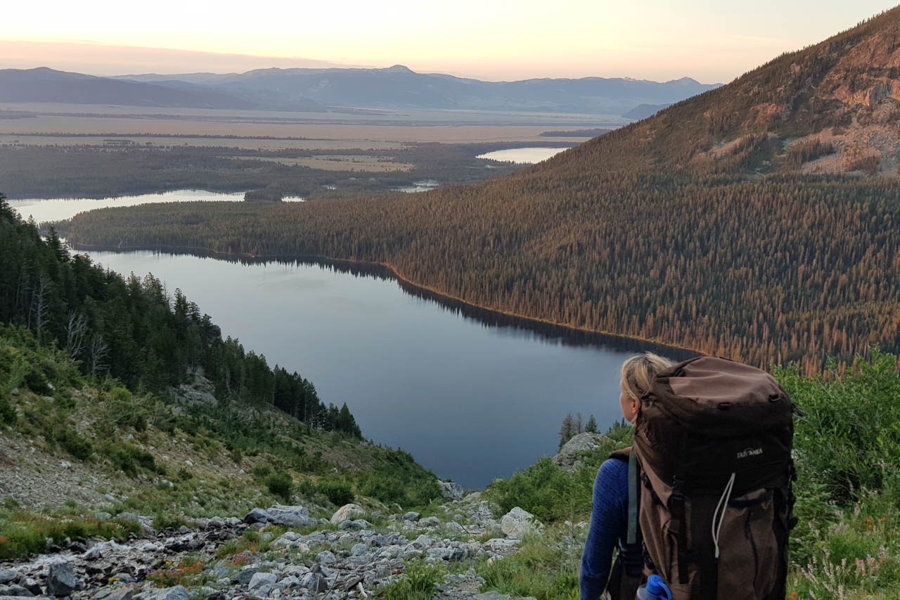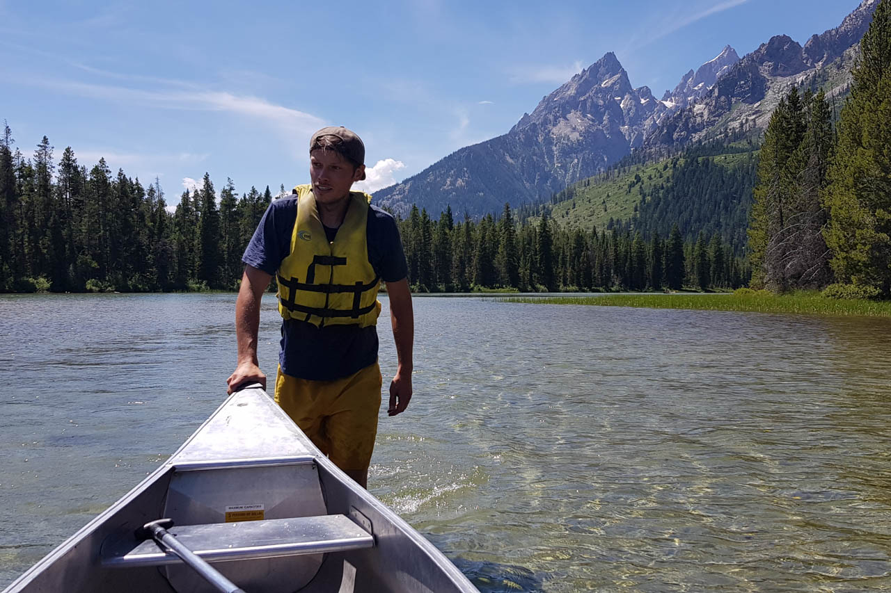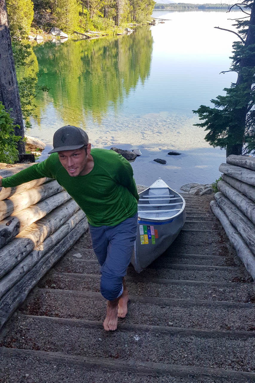 Vorerst dürfen wir auf jeden Fall in den USA bleiben und sind, über einen kurzen Zwischenstopp im Yellowstone National Park, der erneut beeindruckend war, in den Grand Teton National Park gefahren. Hier hatten wir uns einen besonderen Triathlon vorgenommen: Erst 2 Stunden mit einem Kanu über zwei Seen paddeln, dann 2 Stunden mit Sturmgepäck (Zelt, 2 Isomatten, 2 Schlafsäcke, Bärenbox mit Essen für 2 Tage, Wasser, Trad-Klettersachen inkl. 17 Friends, Klemmkeile, Gurte, Karabiner, Exen, sowie 2 Seilen) 1000 Höhenmeter wandern, dort schlafen, und am nächsten Tag erneut 2 Stunden weitere 600 Höhenmeter hochwandern um dann noch 400 Meter auf den Mount Moran zu klettern.