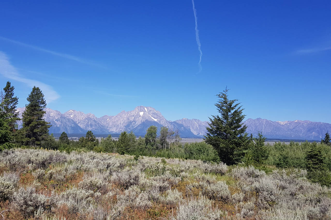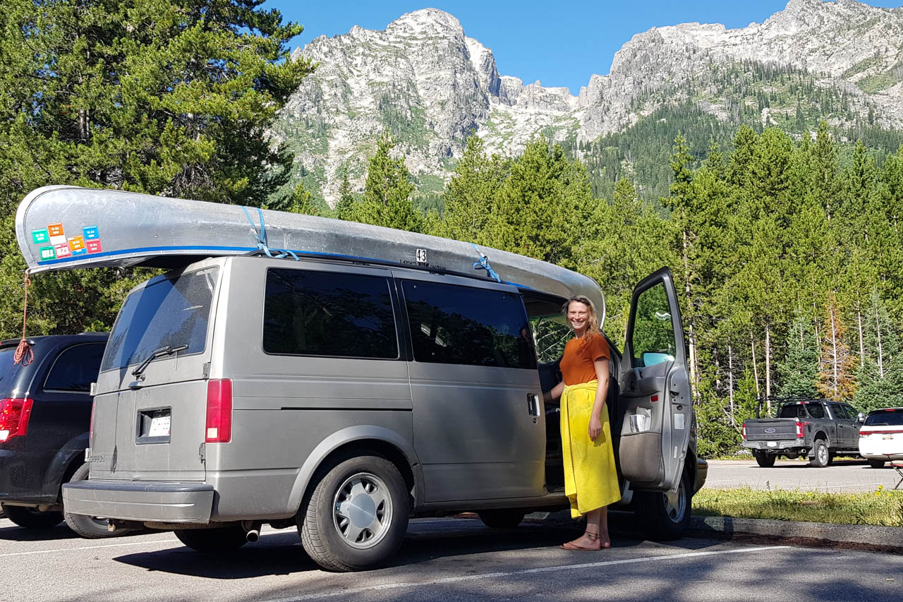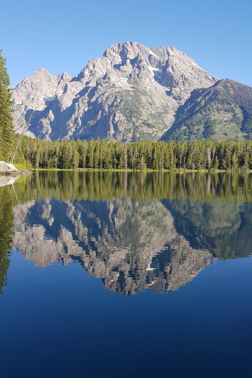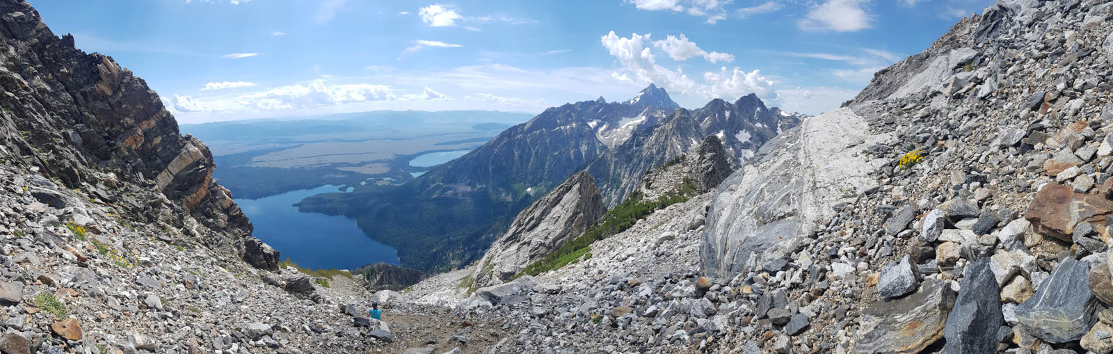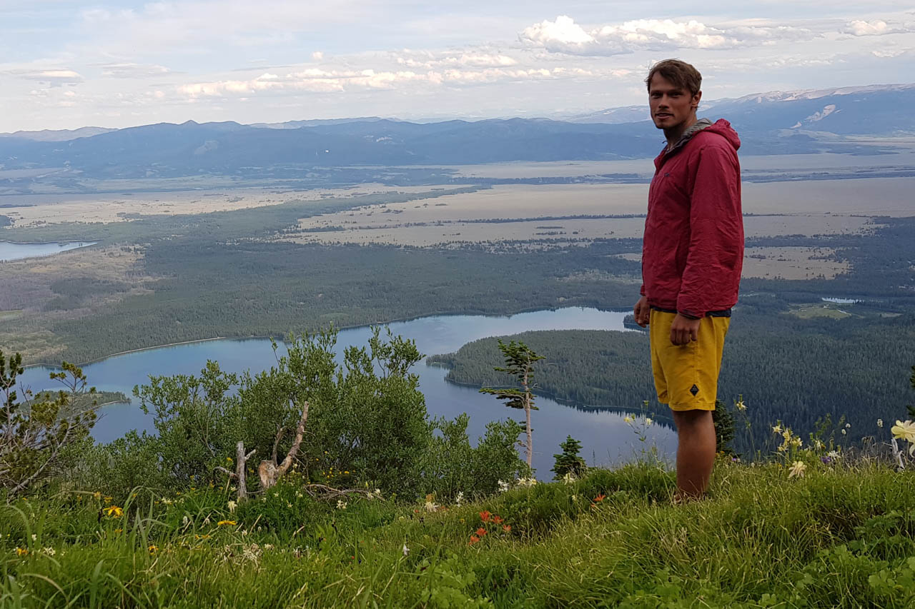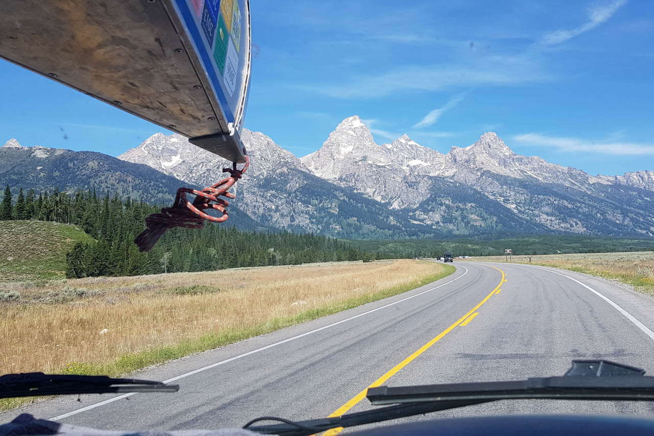 Vorerst dürfen wir auf jeden Fall in den USA bleiben und sind, über einen kurzen Zwischenstopp im Yellowstone National Park, der erneut beeindruckend war, in den Grand Teton National Park gefahren. Hier hatten wir uns einen besonderen Triathlon vorgenommen: Erst 2 Stunden mit einem Kanu über zwei Seen paddeln, dann 2 Stunden mit Sturmgepäck (Zelt, 2 Isomatten, 2 Schlafsäcke, Bärenbox mit Essen für 2 Tage, Wasser, Trad-Klettersachen inkl. 17 Friends, Klemmkeile, Gurte, Karabiner, Exen, sowie 2 Seilen) 1000 Höhenmeter wandern, dort schlafen, und am nächsten Tag erneut 2 Stunden weitere 600 Höhenmeter hochwandern um dann noch 400 Meter auf den Mount Moran zu klettern.
