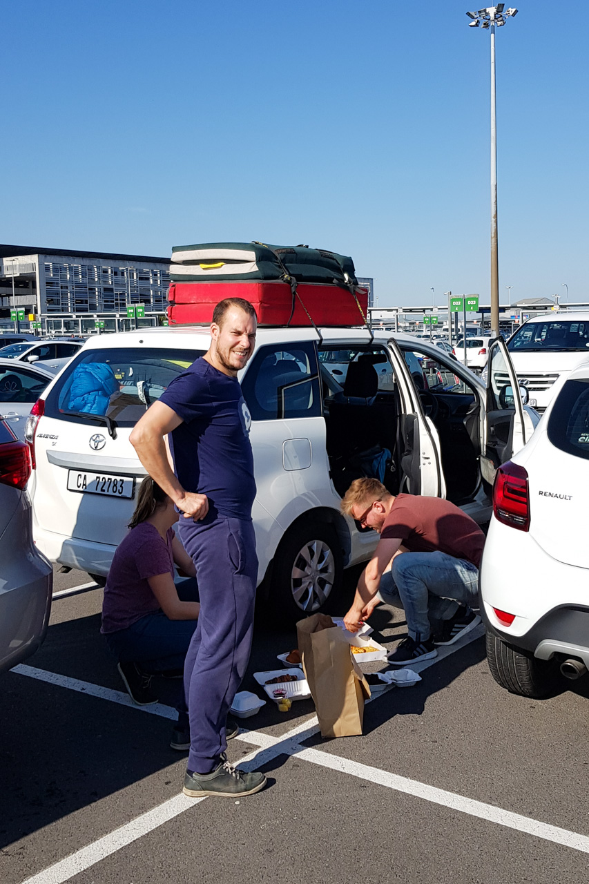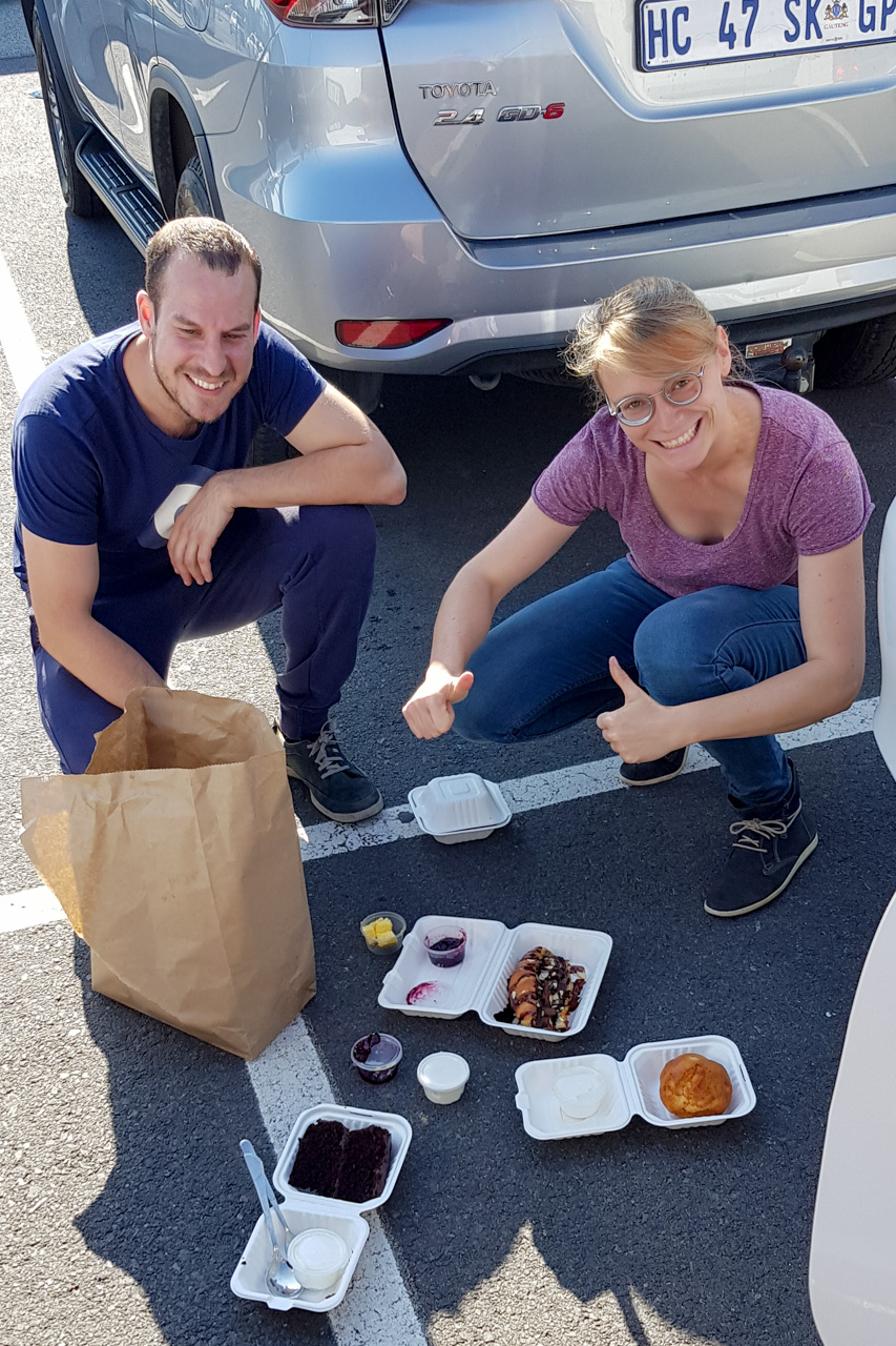Die ersten beiden von unseren vier Wochen in Südafrika sind wie im Flug vergangen. Direkt am Mietwagenverleih wurden wir von unserem vierten Mitstreiter, dem Flo, mit einer Vielzahl von Snacks empfangen: Käsekuchen, Schokoladenkuchen, Muffins und mehreren seltsamen Blätterteig-Teilen. Flo kam schon drei Tage vor uns an und konnte am Strand bereits alle Snack-Quellen erkunden.