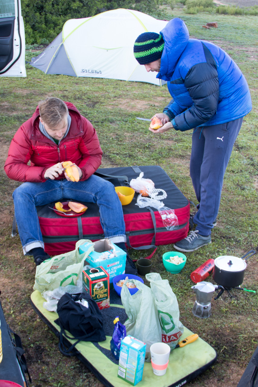 Unsere Abende verbringen wir die meiste Zeit direkt in der Küche, also neben dem Auto auf den Bouldermatten. Dort kochen wir auf unseren beiden Benzinkochern unsere Abendessen: z.B. Nudeln mit Gemüse-Tomatensoße, Kartoffel-Linsencurry, Nudeln mit Mangold oder Cousous-Blumenkohl Gemüse. Unser Notfall-Pesto mussten wir bisher nicht anbrechen. Da in Südafrika gerade Winter ist findet das Kochen und Essen eigentlich immer schon im Dunkeln bzw. im Licht der Stirnlampen statt. Oder natürlich optimistisch gesehen im Mondlicht und unter einen fantastischen Sternenhimmel. Auf der Südhalbkugel ist man allerdings ziemlich aufgeschmissen mit den gewohnten Sternbildern. Großer Wagen, Cassiopeia, Polarstern.. alles Fehlanzeige. Und ohne unseren von zu Hause gewohnten Internetzugriff via Handy mussten wir auch ziemlich schnell feststellen, dass wir einfach absolut keine Ahnung haben, was wir dort oben am Himmel eigentlich sehen.
