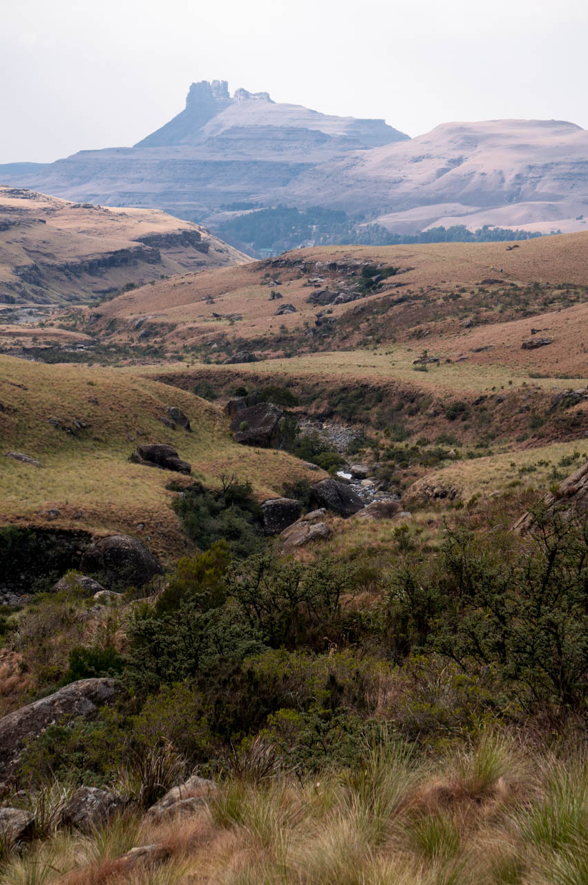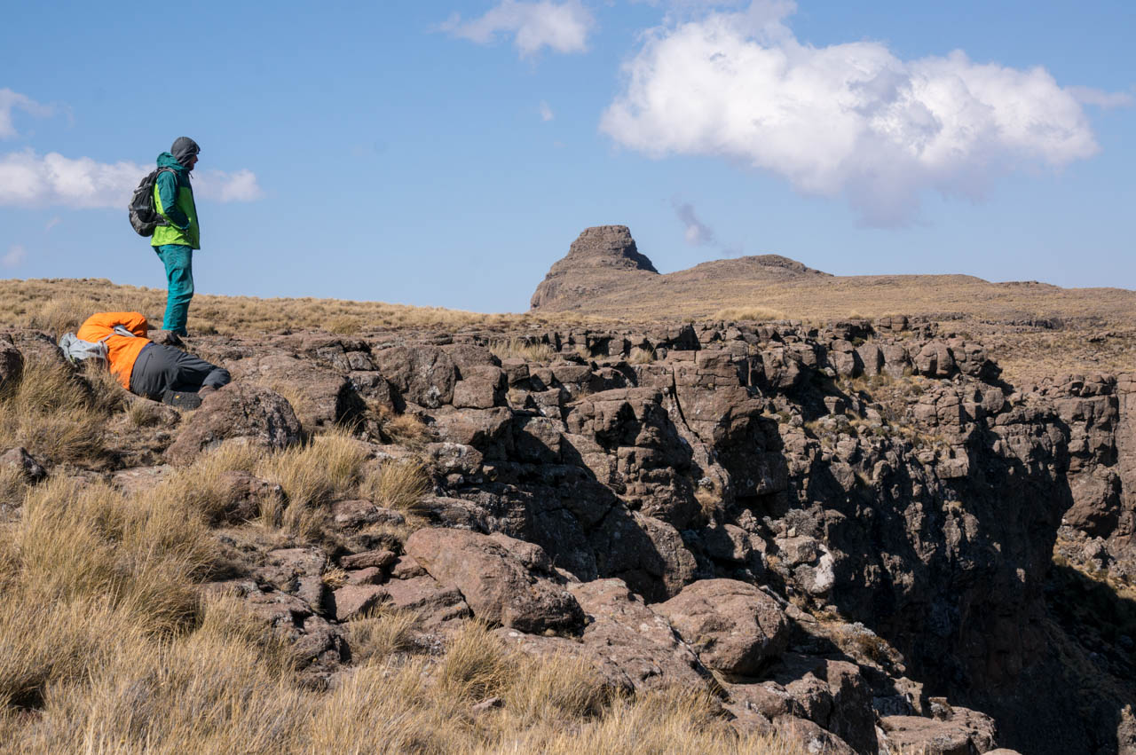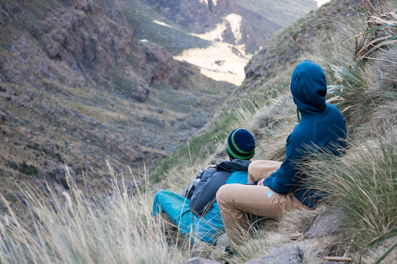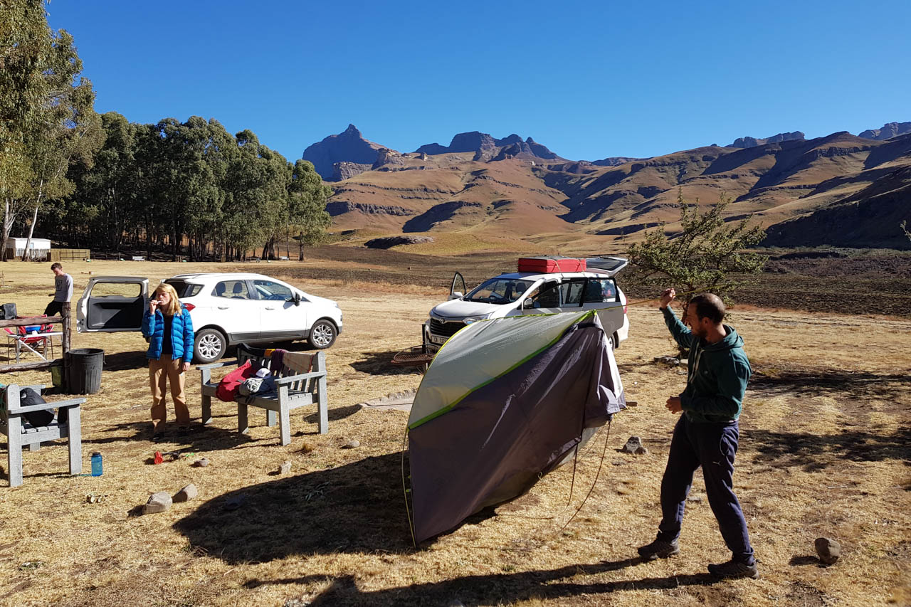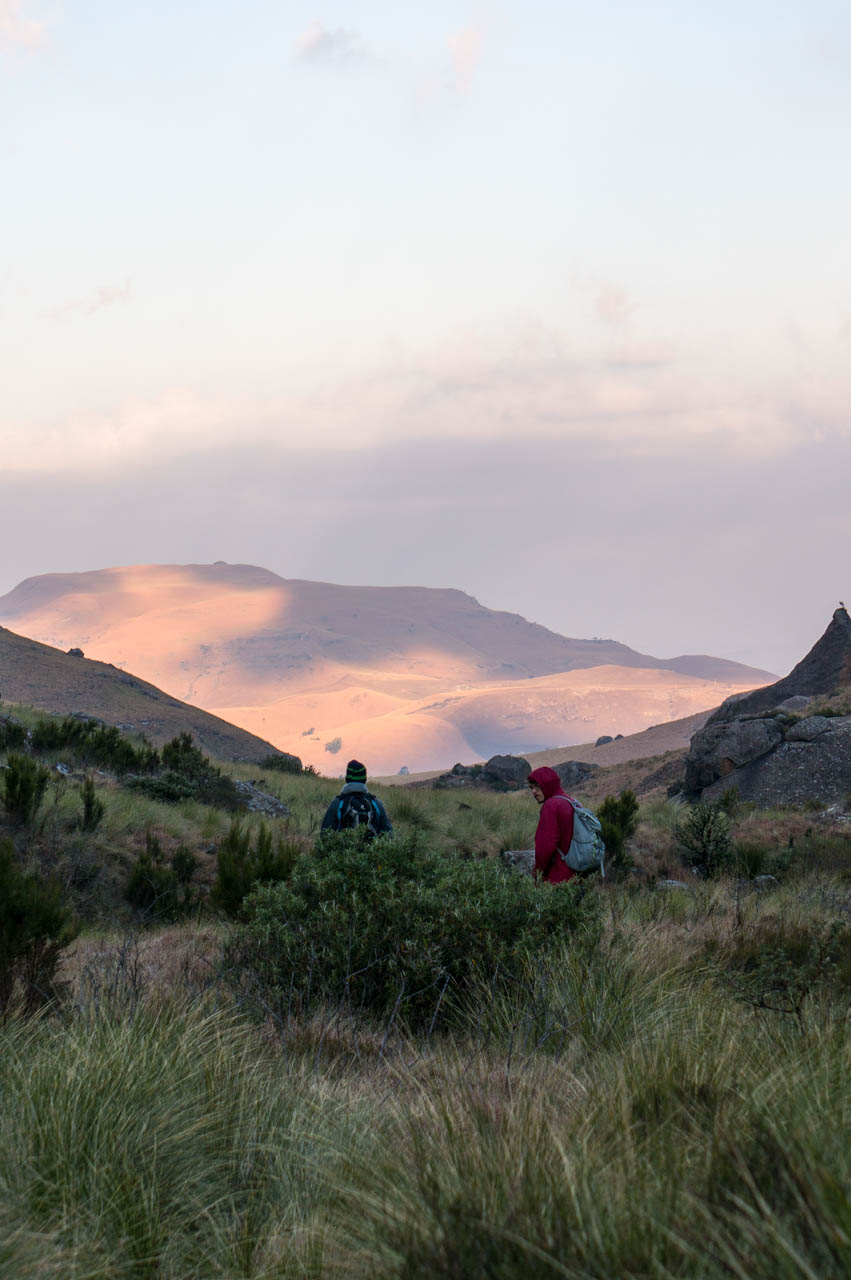Als wir in den Drakensbergen angekommen sind, hat es erstmal geregnet. Unser Abendessen haben wir auf dem Boden des kleinen Küchenunterstandes gekocht, da es sonst zu windig, zu nass und zu kalt gewesen wäre – aber mit Crashpads als Couch war auch das ganz gut zu erdulden. Nachts konnten wir intensiv die Kraft des Winds bewundern: Unsere Zelte standen direkt vorm Wald – und die Windböen konnten wir bereits hören, wenn die ersten Bäume weiter weg erfasst wurden, bis das Rauschen immer gewaltiger und lauter wurde und die Böen, wie bei einer Laola-Welle, bei uns ankamen und wir von innen die Zeltstangen gehalten haben oder die Zeltplane ins Gesicht gedrückt bekommen haben. Nach dieser extremst erholsamen Nacht haben wir dann am nächsten Tag auch noch das bekommen, was wir im Tourist Info Office der Drakensberge angefragt hatten, eine „severe to extreme“, also sehr anstrengende, Wanderung hoch zum Rhino Peak (18 Kilometer lange Wanderung auf bis zu 3.051m). Die ersten Kilometer gingen gut, dann wurde es immer steiler und der Sattel wollte einfach nicht näher kommen. Auch der Wind lies einfach nicht nach. Hoch bis auf den Sattel haben wir es geschafft, dort haben wir die Aussicht und den noch stärkeren Wind genossen, kurz zu Mittag unser Milchbrötchen mit Ei gesnackt und dann wieder den Rückweg eingeschlagen. Bei Dämmerung kamen wir dann wieder bei unseren Zelten an, um festzustellen, dass unser Kocher nicht mehr richtig funktioniert und unser Nudelwasser nicht heiß wird. Den drohenden Stimmungssturz aufgrund hungriger Mägen konnten wir dann aber glücklicherweise noch durch das Reinigen bzw. Zurechtschnitzen des Benzinfilters abwenden.