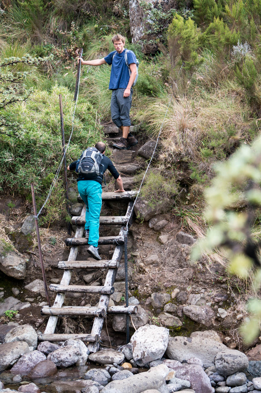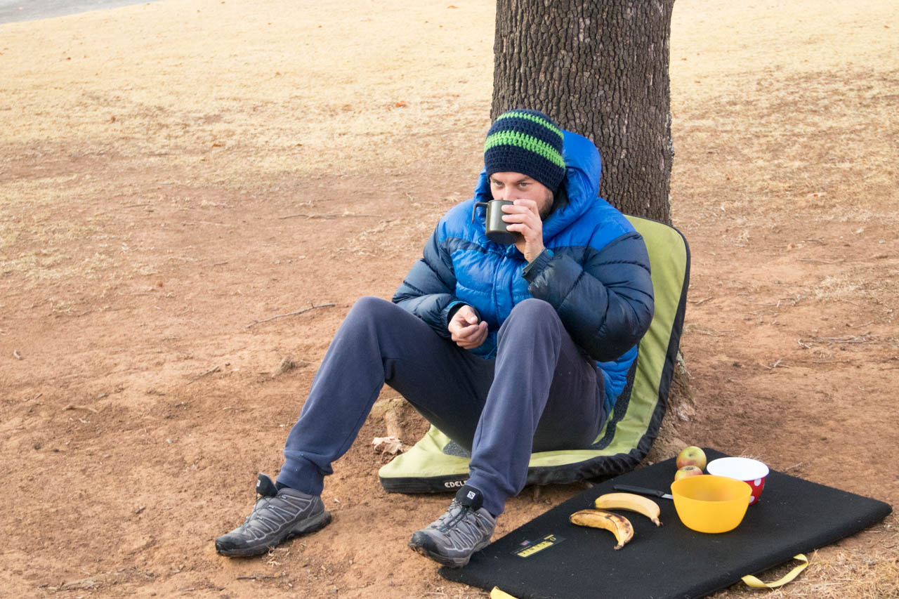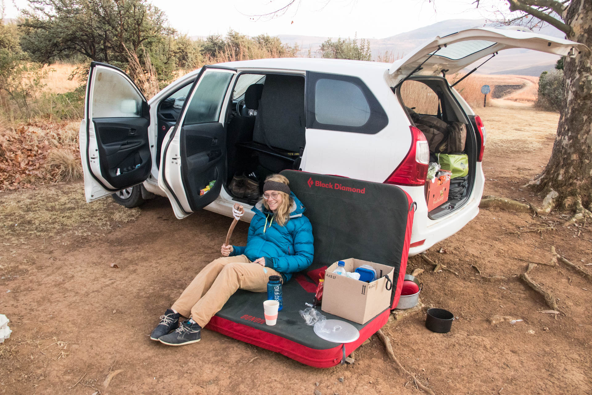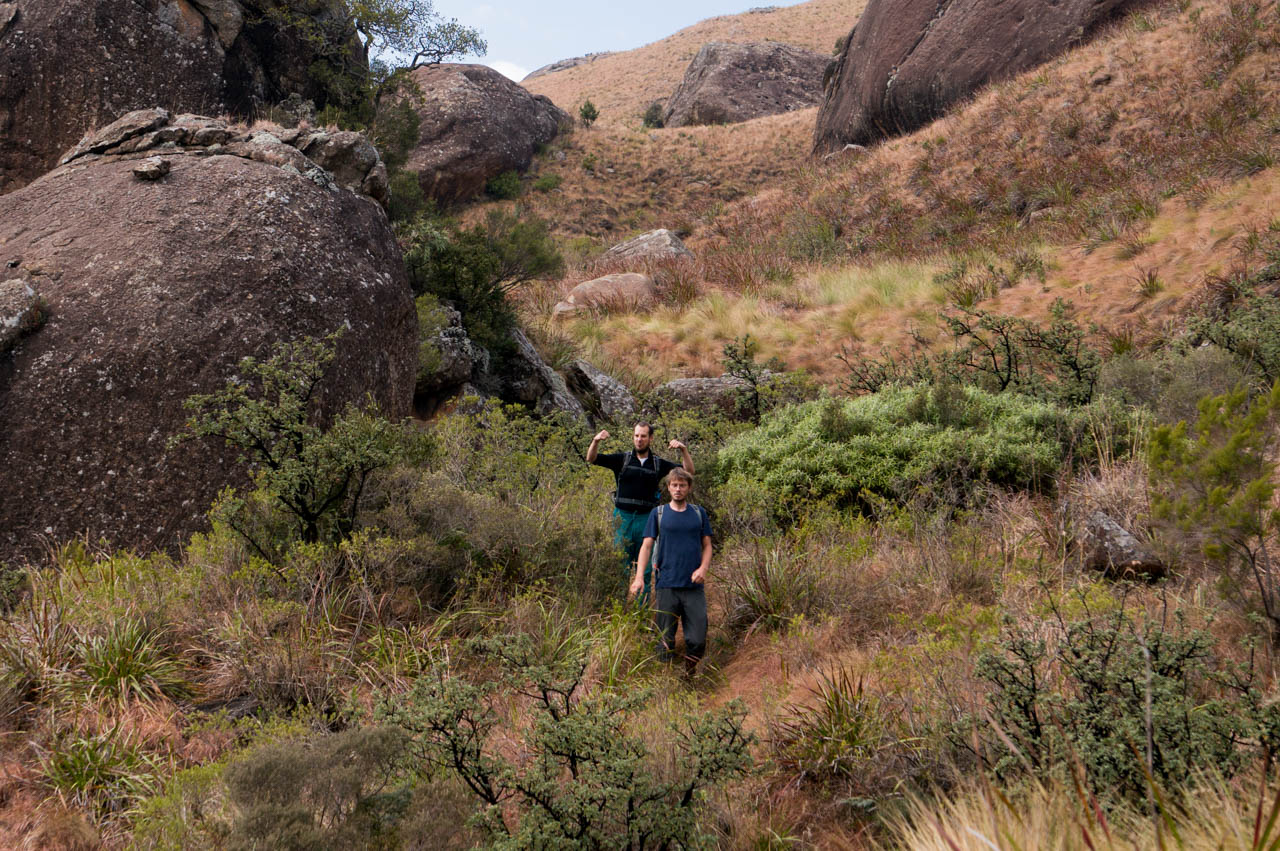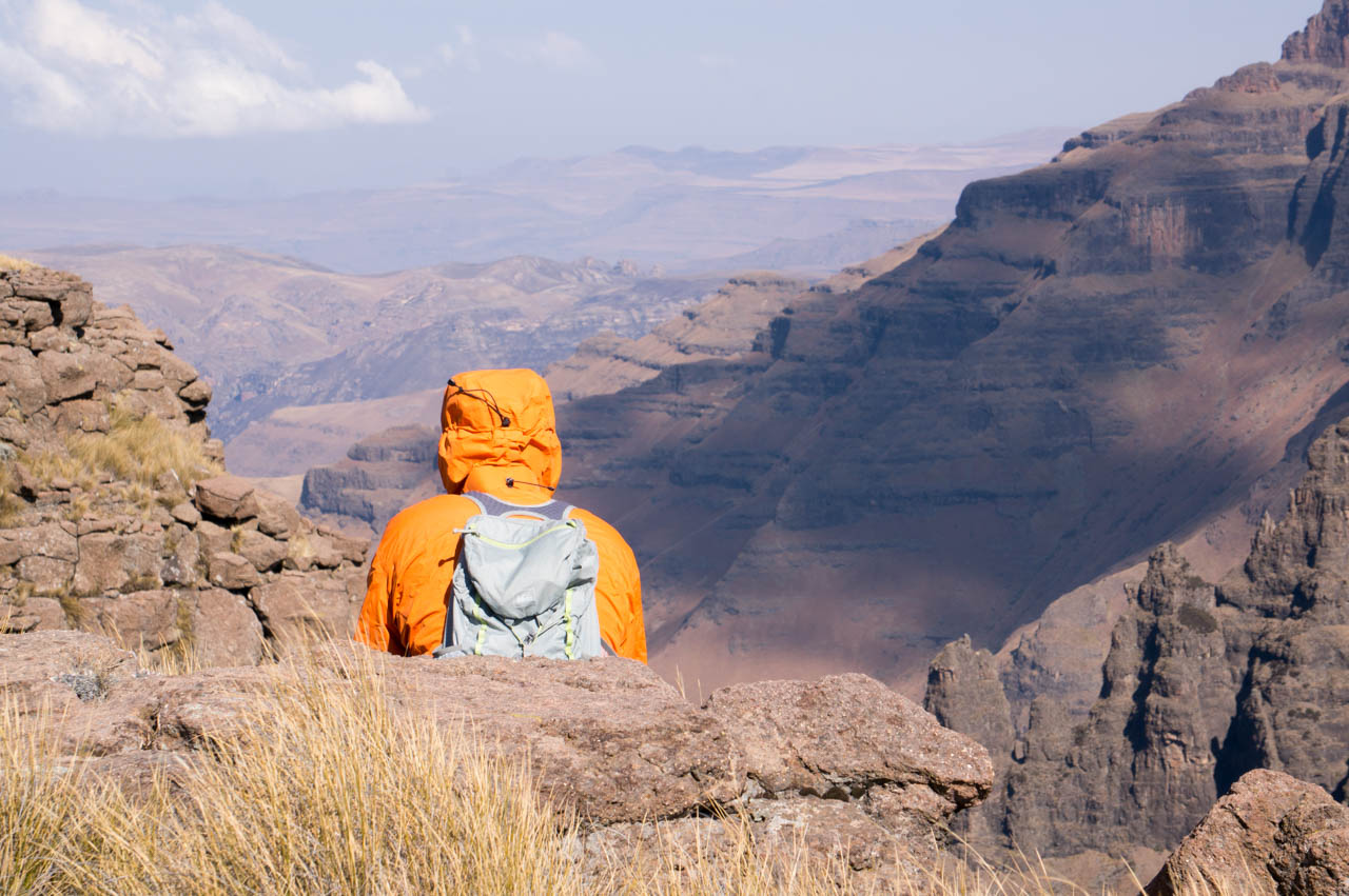 Als wir in den Drakensbergen angekommen sind, hat es erstmal geregnet. Unser Abendessen haben wir auf dem Boden des kleinen Küchenunterstandes gekocht, da es sonst zu windig, zu nass und zu kalt gewesen wäre – aber mit Crashpads als Couch war auch das ganz gut zu erdulden. Nachts konnten wir intensiv die Kraft des Winds bewundern: Unsere Zelte standen direkt vorm Wald – und die Windböen konnten wir bereits hören, wenn die ersten Bäume weiter weg erfasst wurden, bis das Rauschen immer gewaltiger und lauter wurde und die Böen, wie bei einer Laola-Welle, bei uns ankamen und wir von innen die Zeltstangen gehalten haben oder die Zeltplane ins Gesicht gedrückt bekommen haben. Nach dieser extremst erholsamen Nacht haben wir dann am nächsten Tag auch noch das bekommen, was wir im Tourist Info Office der Drakensberge angefragt hatten, eine „severe to extreme“, also sehr anstrengende, Wanderung hoch zum Rhino Peak (18 Kilometer lange Wanderung auf bis zu 3.051m). Die ersten Kilometer gingen gut, dann wurde es immer steiler und der Sattel wollte einfach nicht näher kommen. Auch der Wind lies einfach nicht nach. Hoch bis auf den Sattel haben wir es geschafft, dort haben wir die Aussicht und den noch stärkeren Wind genossen, kurz zu Mittag unser Milchbrötchen mit Ei gesnackt und dann wieder den Rückweg eingeschlagen. Bei Dämmerung kamen wir dann wieder bei unseren Zelten an, um festzustellen, dass unser Kocher nicht mehr richtig funktioniert und unser Nudelwasser nicht heiß wird. Den drohenden Stimmungssturz aufgrund hungriger Mägen konnten wir dann aber glücklicherweise noch durch das Reinigen bzw. Zurechtschnitzen des Benzinfilters abwenden.