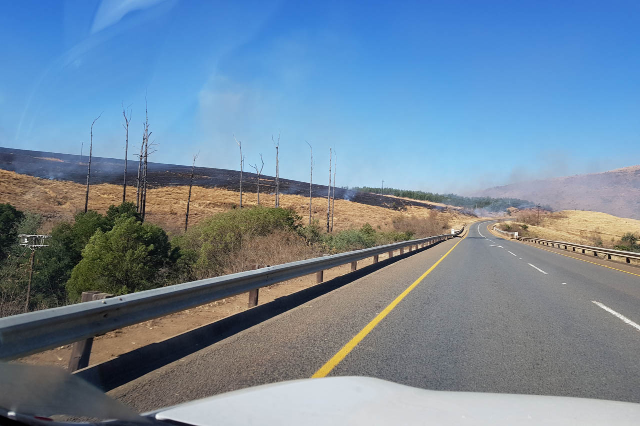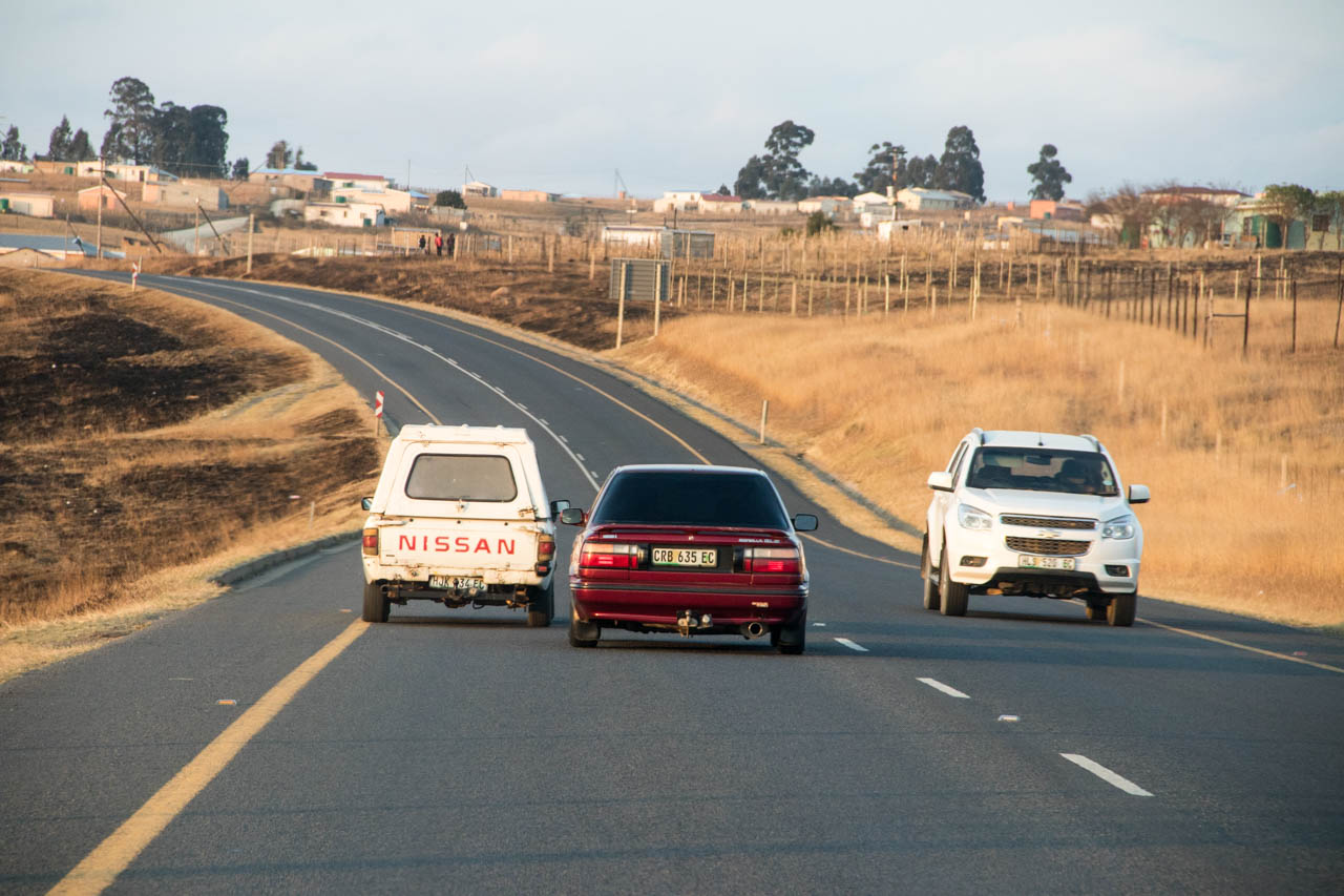 Nach unserer erfolgreichen Löwensuche sind wir am nächsten Tag mit neuen Erwartungen weitergefahren: Jetzt würden wir gerne noch mindestens einen Leoparden, ein Krokodil und ein Hippo sehen! Aber erstmal ging es eine längere Strecke bis in einen Nationalpark ohne wirkliche Wildtiere weiter: Den Ukhahlamba-Drakensberg Park. Schon die Fahrt dorthin war aufregend – traditionelle südafrikanische Überholpraktiken auf einer normal zweispurigen Straße mussten von unserer Fahrerin Franzi erst erkannt und erlernt werden, bevor auch unser Mietauto sich „normal“ verhalten konnte (in Südafrika haben auf einer 2-spurigen Straße nämlich bis zu 4 Autos nebeneinander Platz – dafür sind die jeweiligen Seitenstreifen schließlich da). Während wir uns von einer Straßenbaustelle mit fleißig winkenden Fahnenschwenkern zur nächsten vorgearbeitet haben, konnten wir einen guten Eindruck vom Land erhalten: Von Weinbaugegenden, Land- und Forstwirtschaft fokussierten Gebieten, über kleine Orte und größere Städte mit Namen wie Gouda, Atlantis, Alexandria, Underberg, Frankfort oder Hamburg, war alles dabei. Überall standen und warteten die Südafrikaner am Straßenrand (auch am Highway) und würden gerne mitgenommen werden (auch wenn das für uns neue Straßenschild „Anhalter verboten“ direkt hinter ihnen aufragte). Nach so mancher erfolgreichen Ortsdurchquerung unseres hauptsächlich genutzten Highways, dem „N2“, entlang, haben wir aufgeatmet – die innerörtlichen Straßensituationen haben sehr an vietnamesische oder thailändische Straßen in Großstädten erinnert. Auch an brennenden Feldern sind wir vorbeigefahren – dies ist scheinbar in bestimmten Gegenden Südafrikas üblich, um der Erde neue Nährstoffe zuzuführen (wird auch in bestimmten Nationalparks praktiziert).